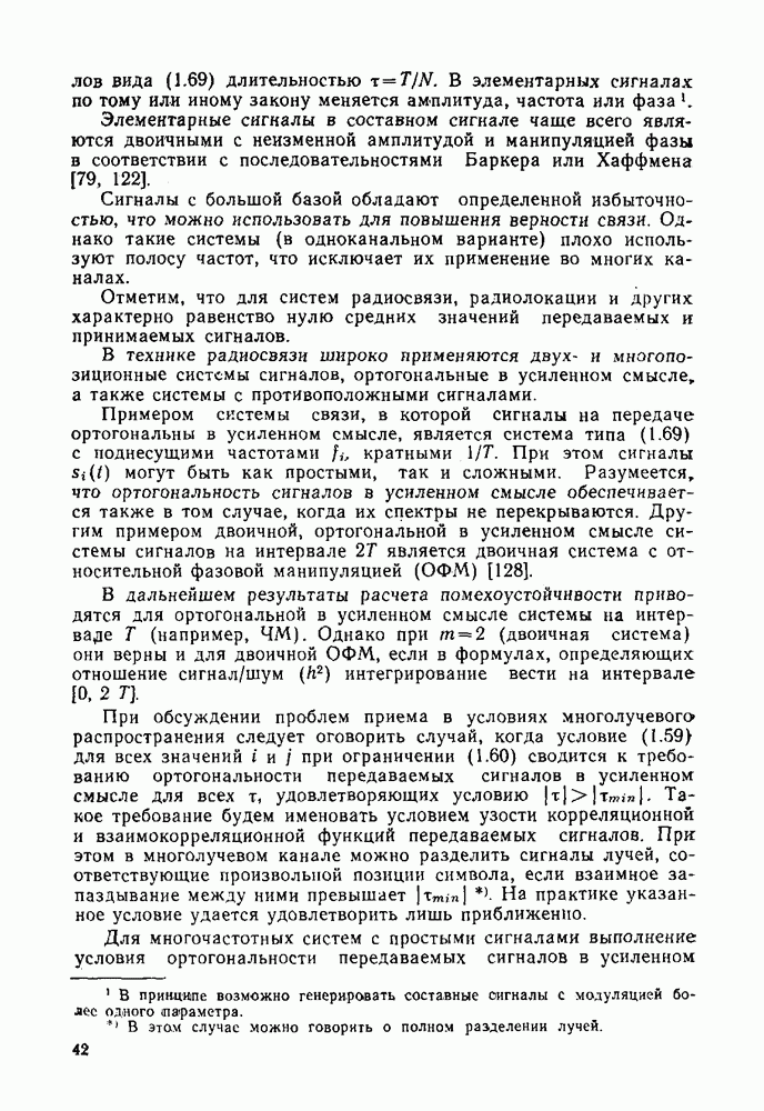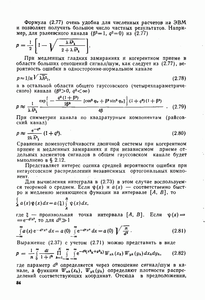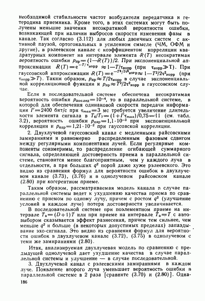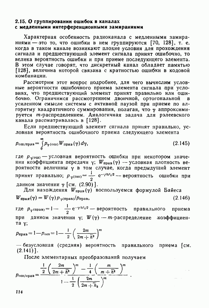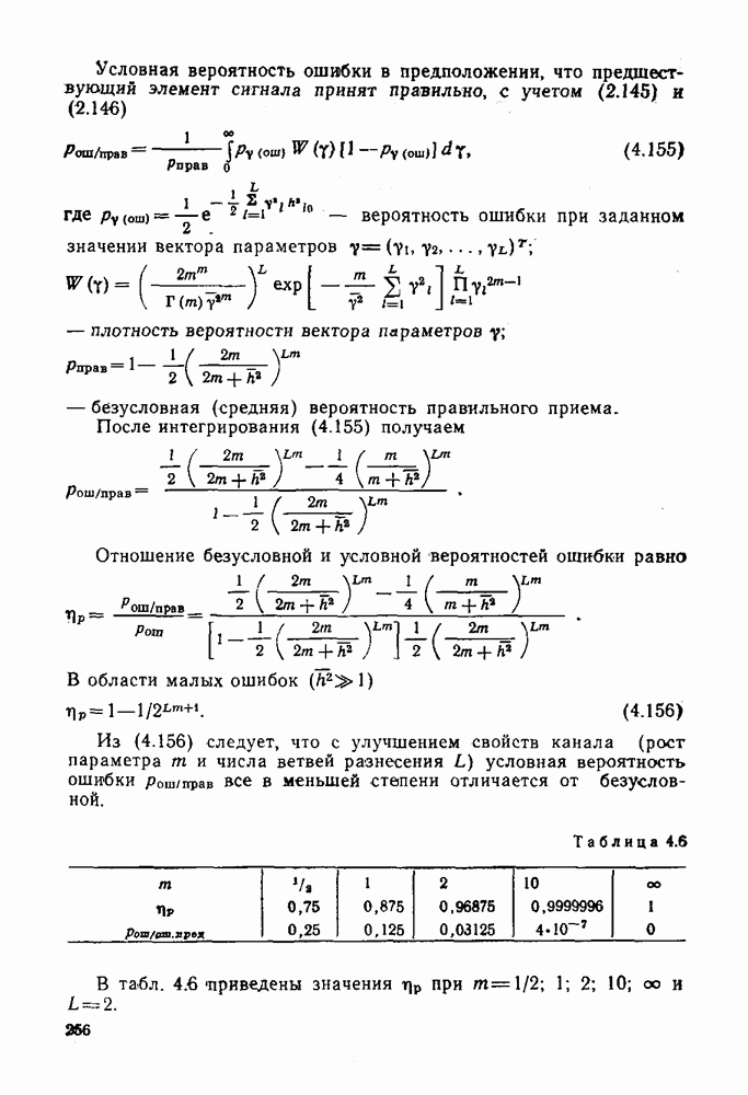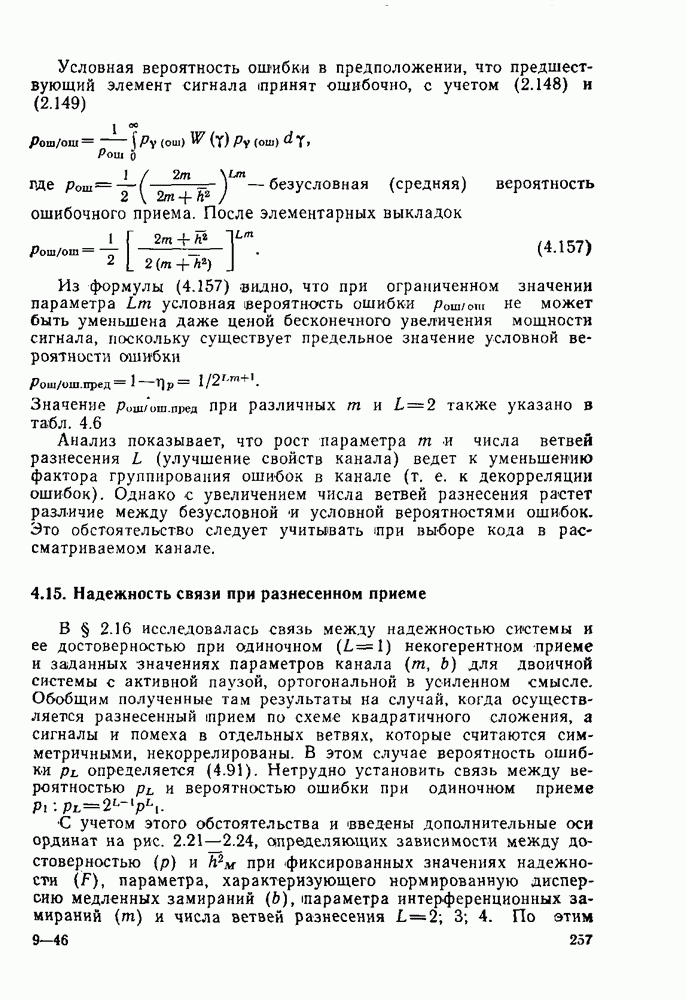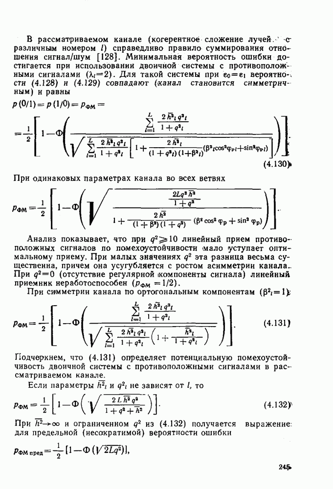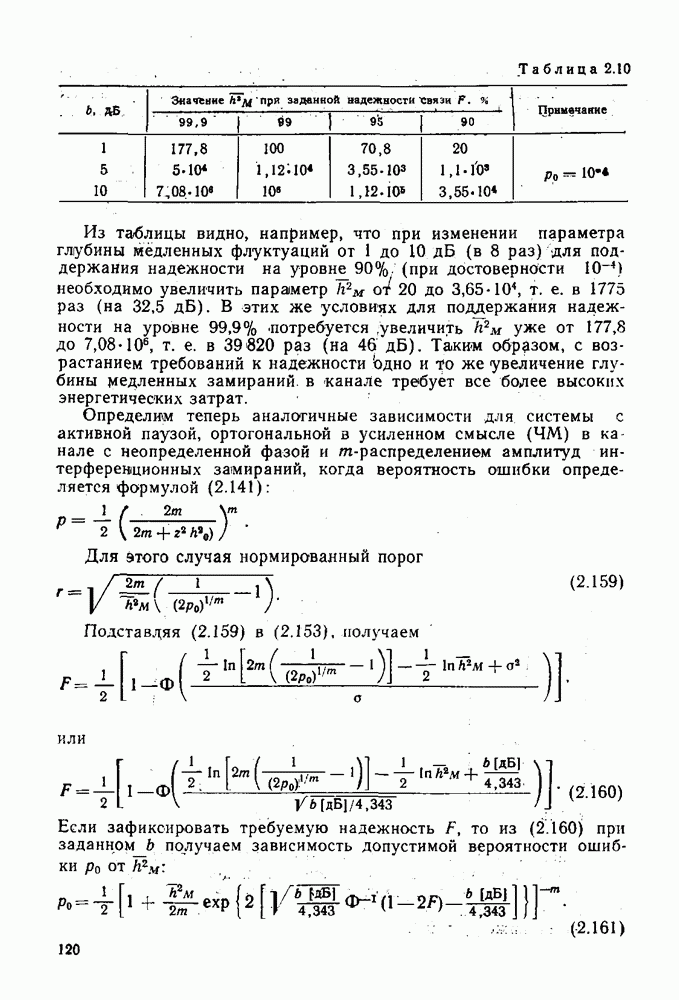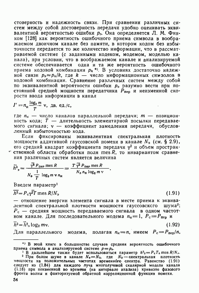 Из сравнения полученных выражений видно, что в каналах с небольшими значениями При Итак, для ортогональной в усиленном смысле системы с активной паузой прием по простому алгоритму квадратичного суммирования (2.132) дает примерно те же результаты, что и более трудная для реализации оптимальная схема. Оценим энергетический проигрыш, связанный с потерей оптимальности (условие Анализ, проведенный в работе [176] для обобщенного рэлеевского канала, показывает, что этот проигрыш монотонно растет с увеличением Таблица 2.7 (см. скан) Из таблицы видно, что если коэффициент взаимной корреляции сигналов по огибающей не превышает 0,5, то энергетический проигрыш не превышает Оценим теперь эффективность простых многопозиционных кодов и одноканальных (по частоте) систем, используемых в четырехпараметрическом канале с гладкими замираниями при независимом приеме элементов сигнала. Для прямой (без канала обратной связи [97, 128]) системы передачи информации с В односторонне-нормальном канале в области малых ошибок с учетом (2.136).