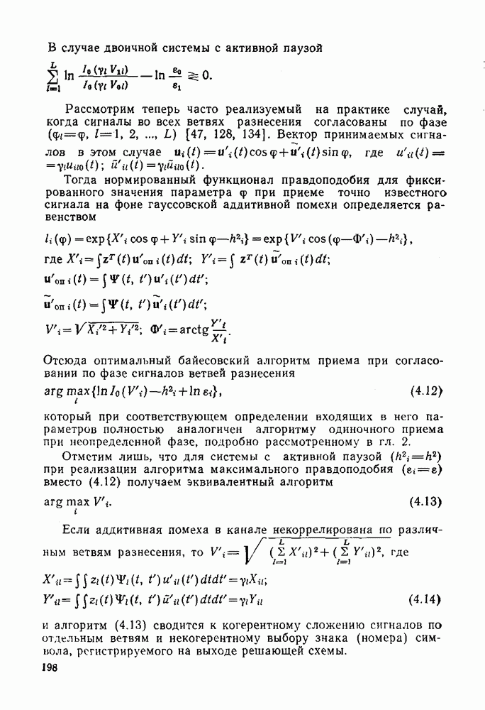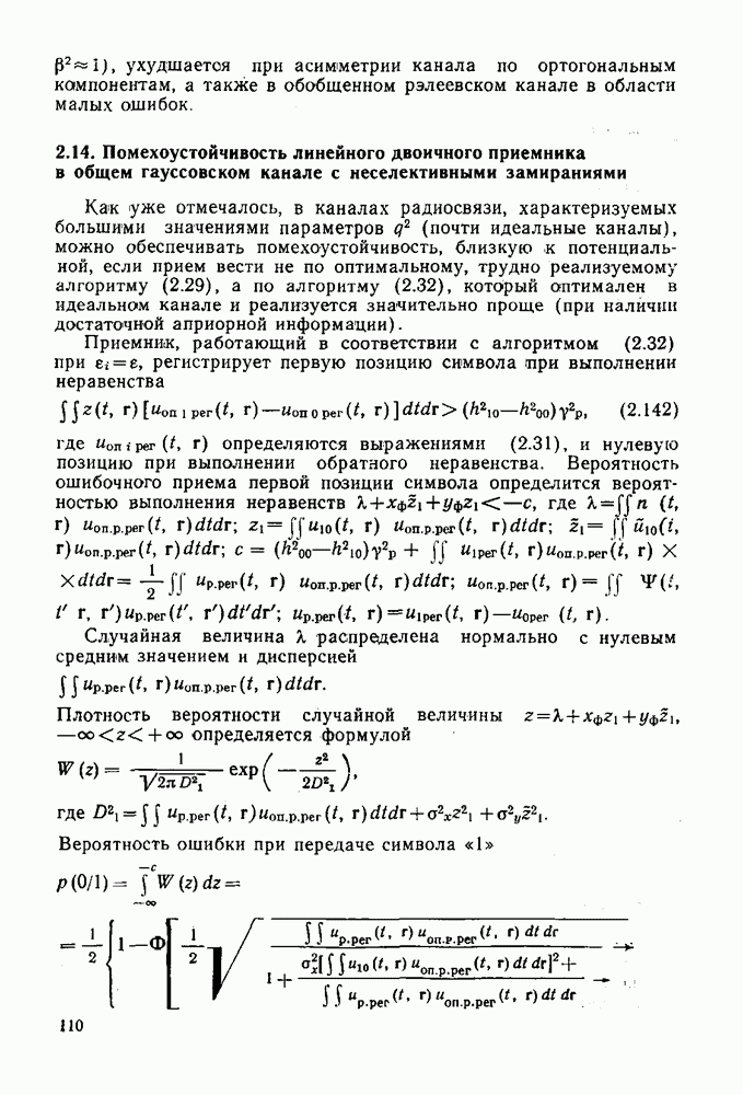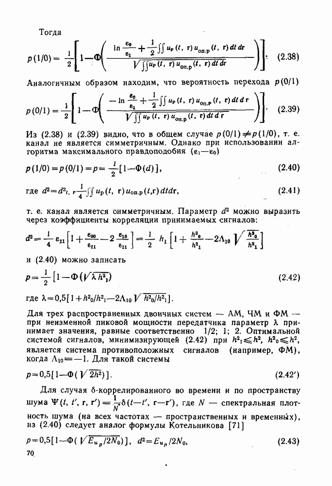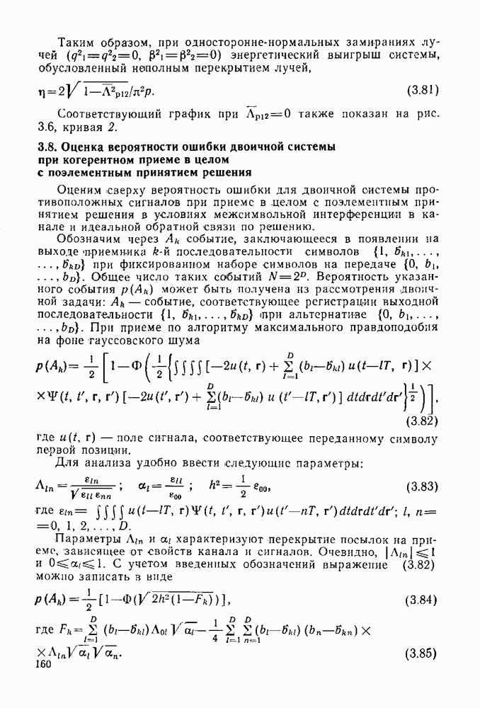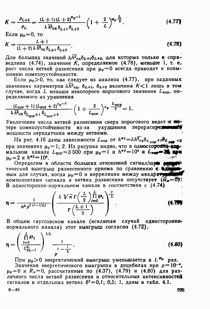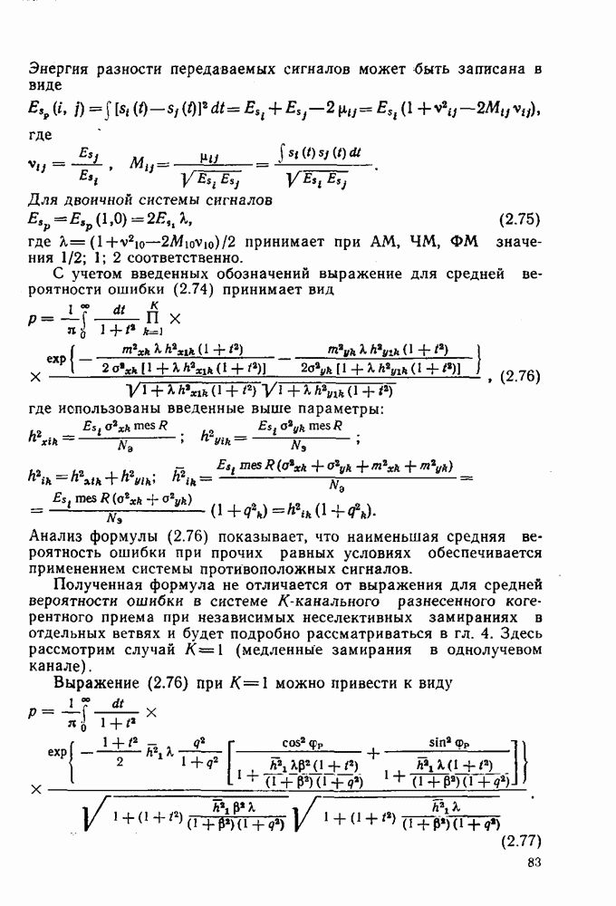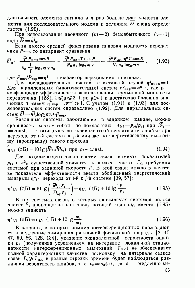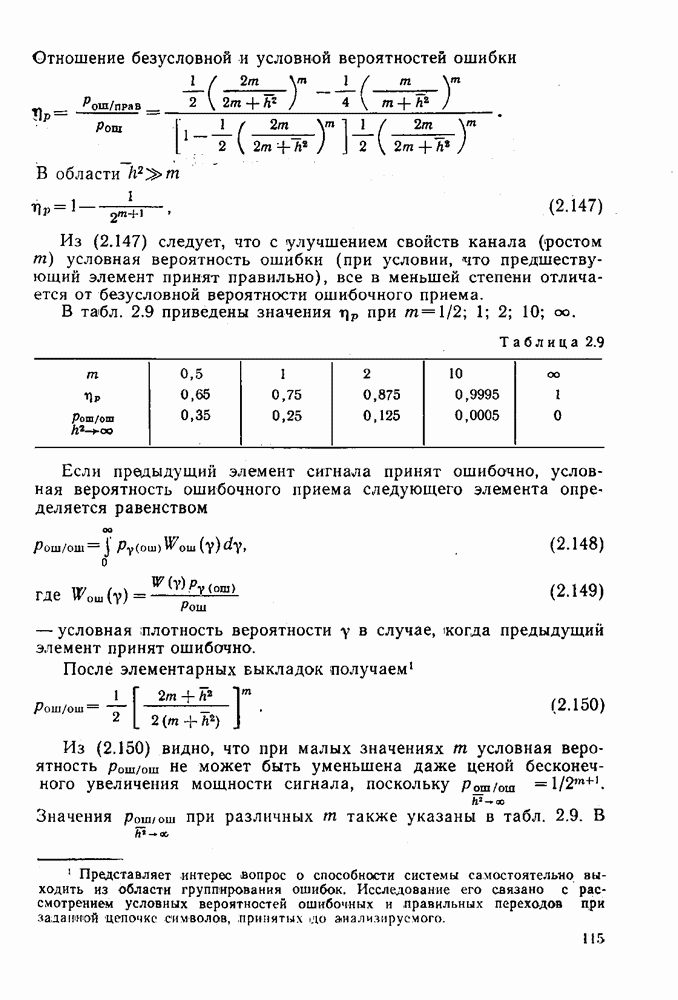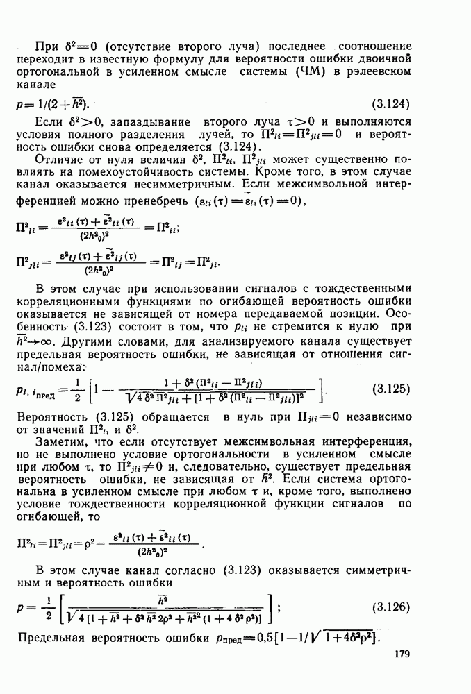Из сравнения полученных выражений видно, что в каналах с небольшими значениями При Итак, для ортогональной в усиленном смысле системы с активной паузой прием по простому алгоритму квадратичного суммирования (2.132) дает примерно те же результаты, что и более трудная для реализации оптимальная схема. Оценим энергетический проигрыш, связанный с потерей оптимальности (условие Анализ, проведенный в работе [176] для обобщенного рэлеевского канала, показывает, что этот проигрыш монотонно растет с увеличением Таблица 2.7 (см. скан) Из таблицы видно, что если коэффициент взаимной корреляции сигналов по огибающей не превышает 0,5, то энергетический проигрыш не превышает Оценим теперь эффективность простых многопозиционных кодов и одноканальных (по частоте) систем, используемых в четырехпараметрическом канале с гладкими замираниями при независимом приеме элементов сигнала. Для прямой (без канала обратной связи [97, 128]) системы передачи информации с В односторонне-нормальном канале в области малых ошибок с учетом (2.136).