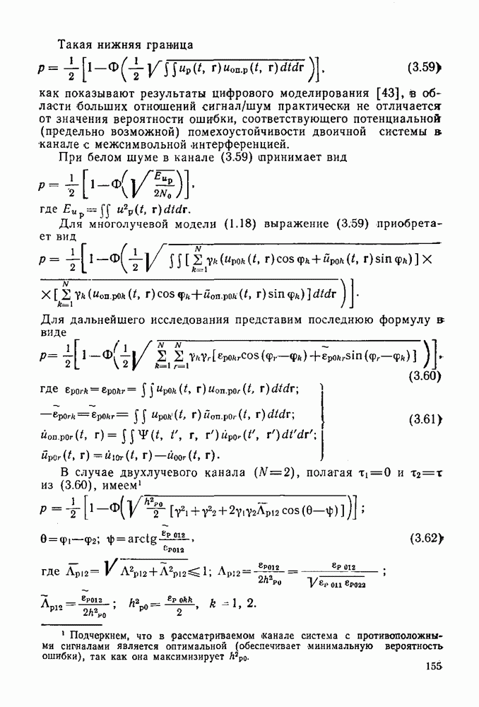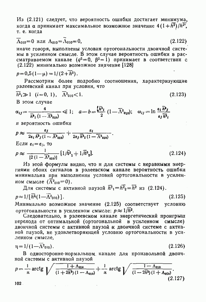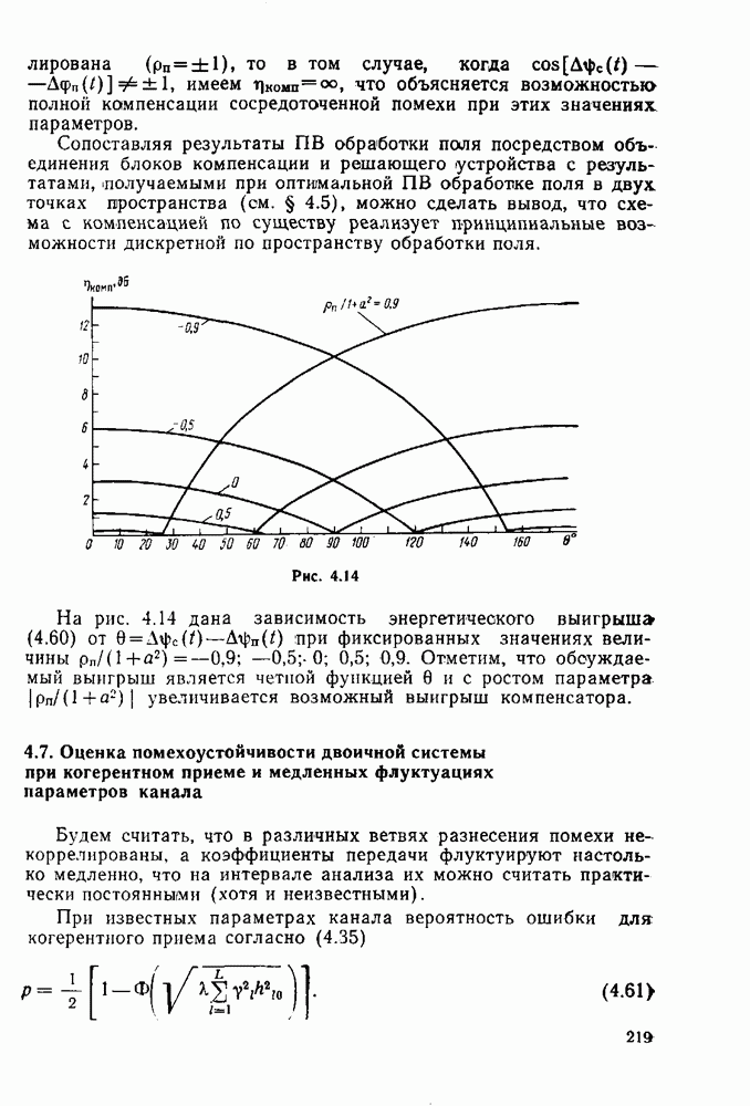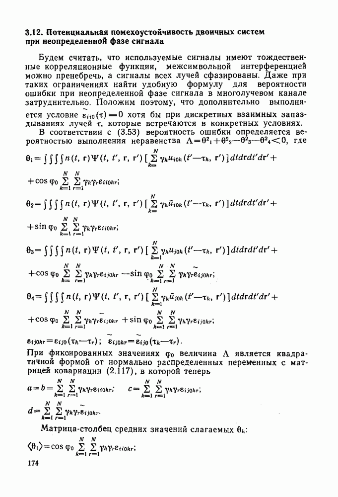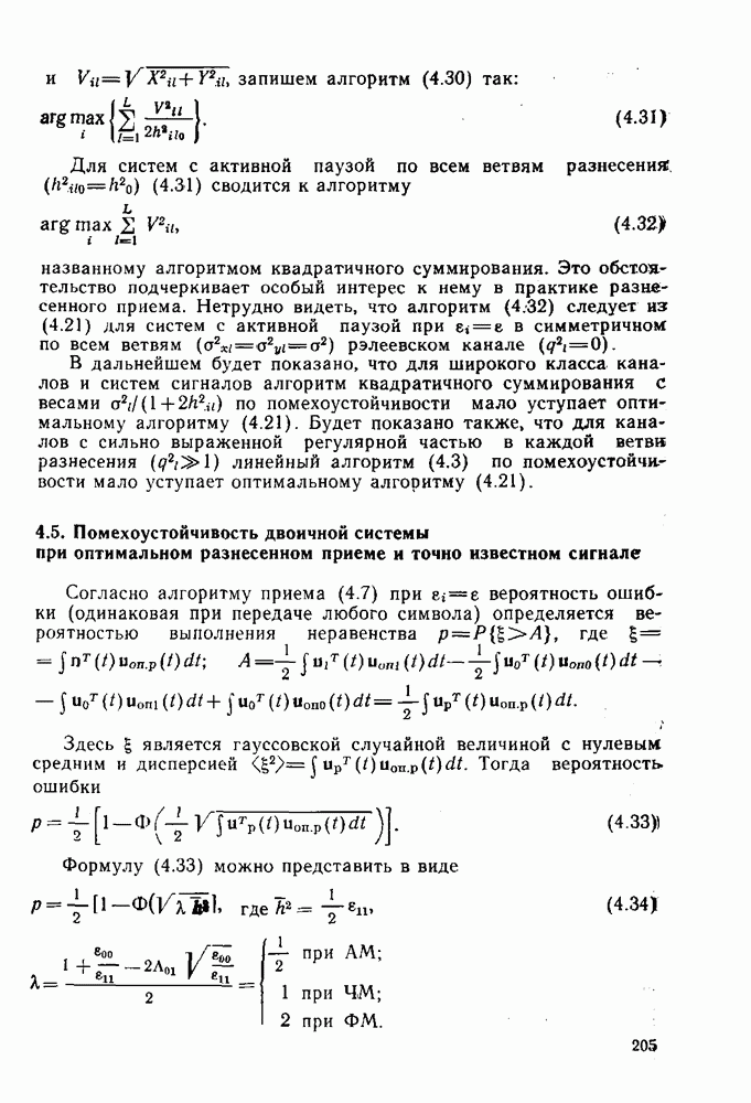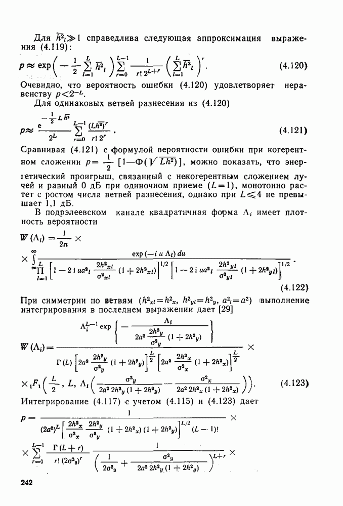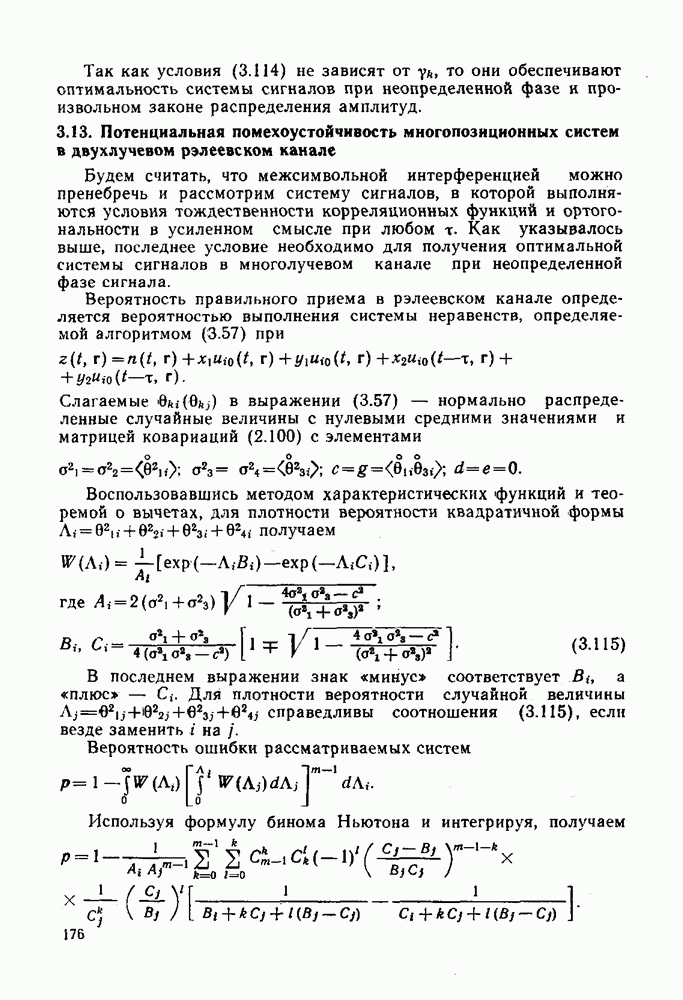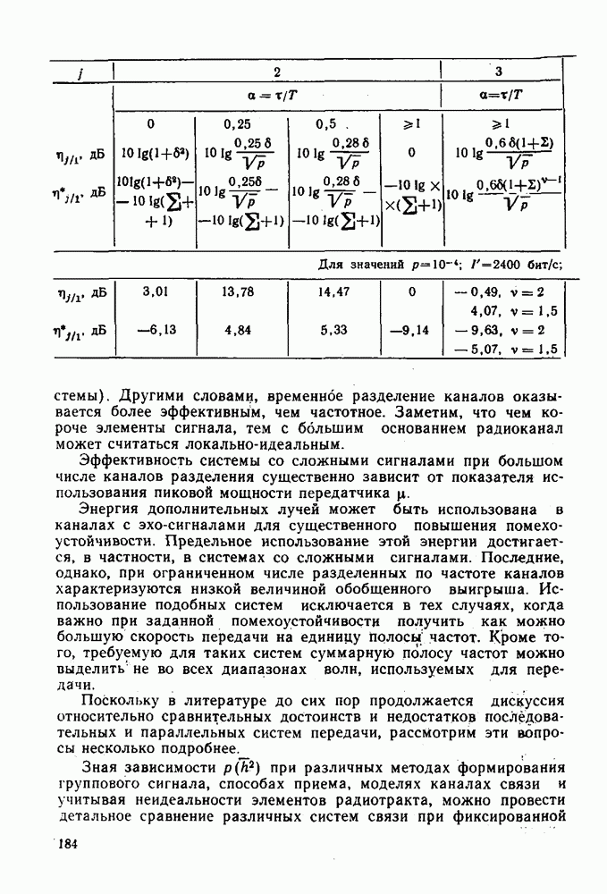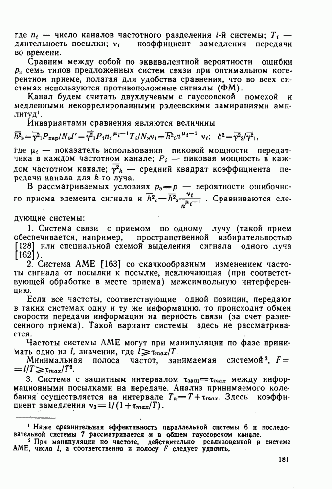 Из сравнения полученных выражений видно, что в каналах с небольшими значениями При Итак, для ортогональной в усиленном смысле системы с активной паузой прием по простому алгоритму квадратичного суммирования (2.132) дает примерно те же результаты, что и более трудная для реализации оптимальная схема. Оценим энергетический проигрыш, связанный с потерей оптимальности (условие Анализ, проведенный в работе [176] для обобщенного рэлеевского канала, показывает, что этот проигрыш монотонно растет с увеличением Таблица 2.7 (см. скан) Из таблицы видно, что если коэффициент взаимной корреляции сигналов по огибающей не превышает 0,5, то энергетический проигрыш не превышает Оценим теперь эффективность простых многопозиционных кодов и одноканальных (по частоте) систем, используемых в четырехпараметрическом канале с гладкими замираниями при независимом приеме элементов сигнала. Для прямой (без канала обратной связи [97, 128]) системы передачи информации с В односторонне-нормальном канале в области малых ошибок с учетом (2.136).