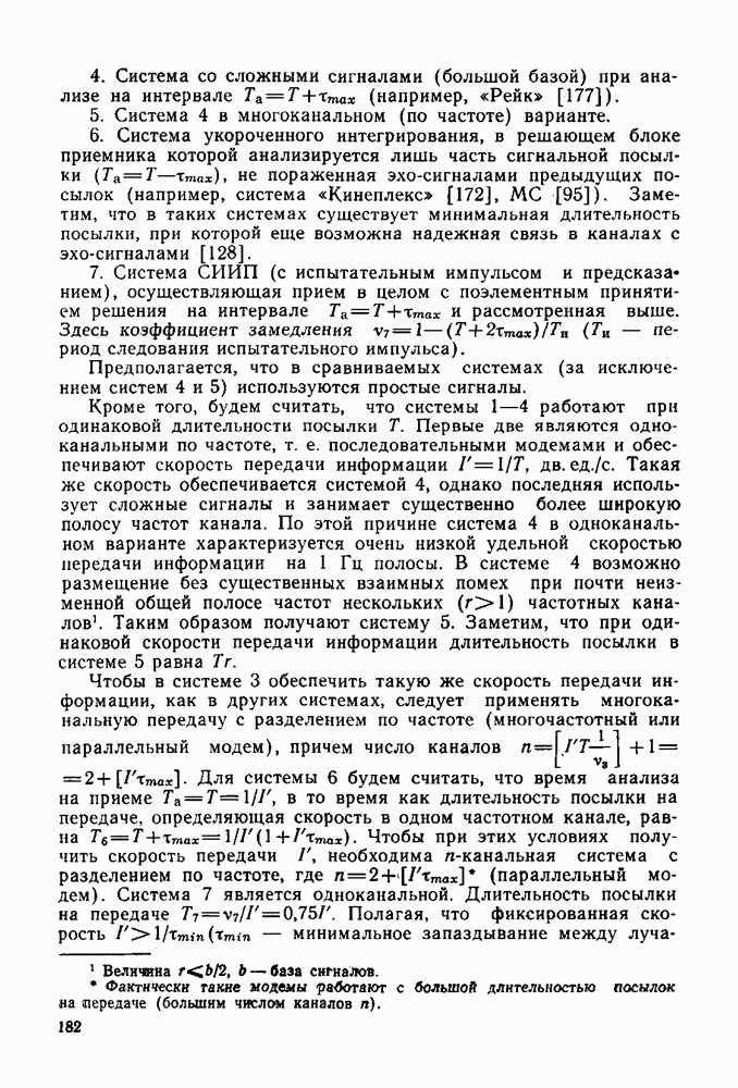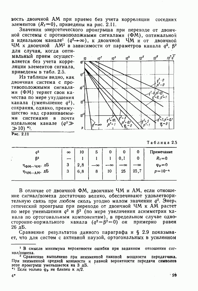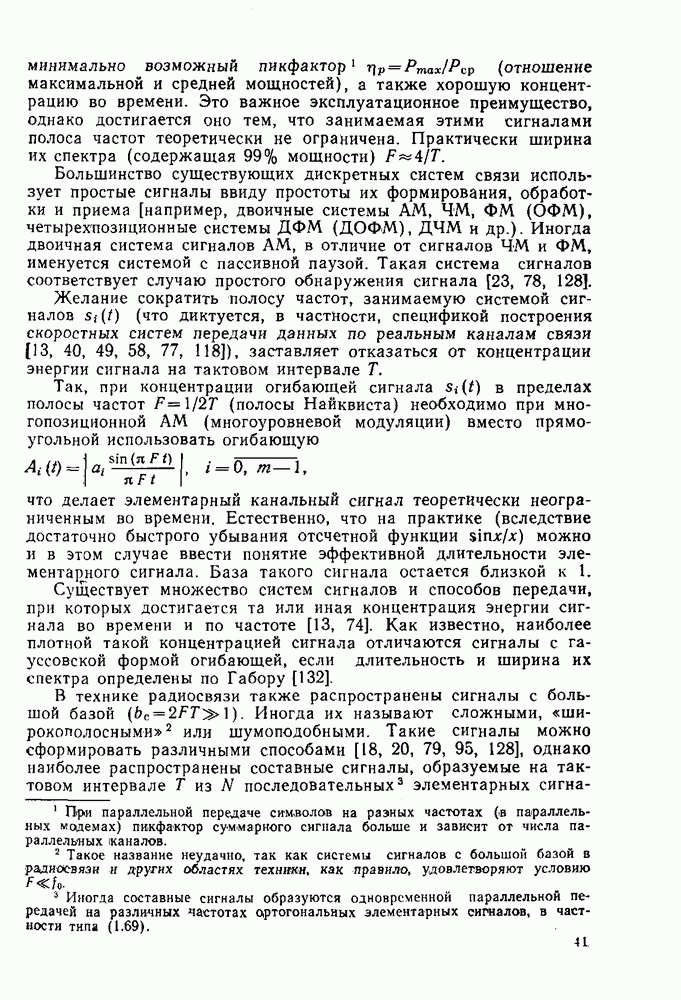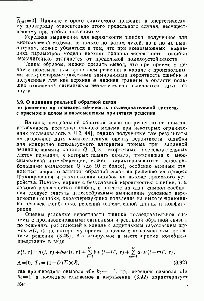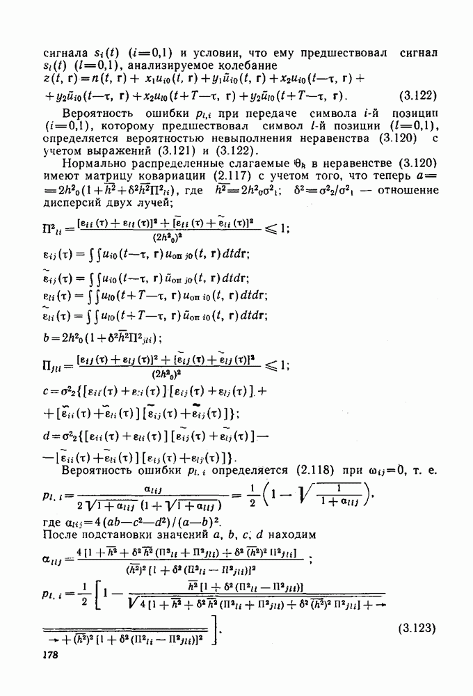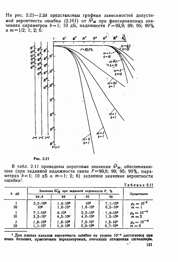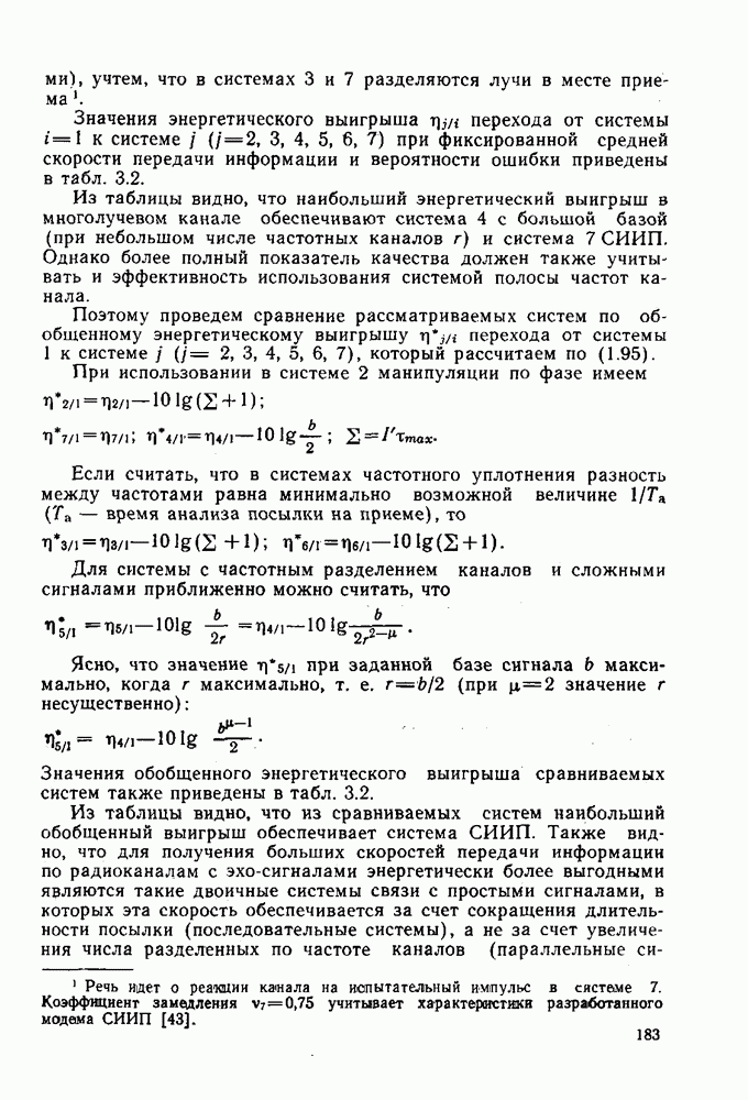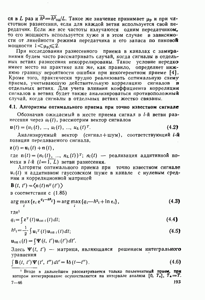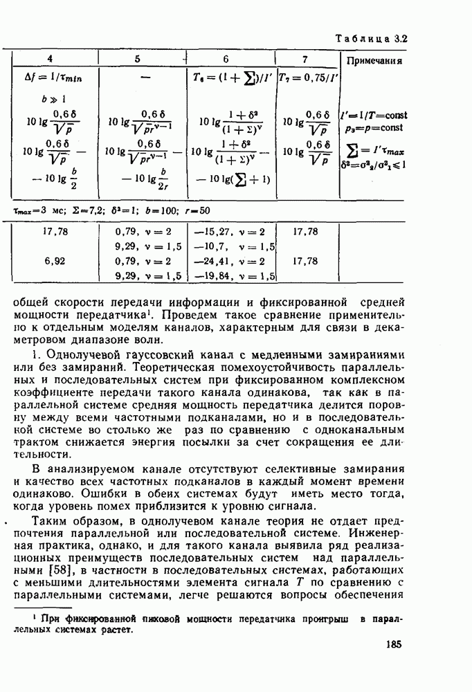 Из сравнения полученных выражений видно, что в каналах с небольшими значениями При Итак, для ортогональной в усиленном смысле системы с активной паузой прием по простому алгоритму квадратичного суммирования (2.132) дает примерно те же результаты, что и более трудная для реализации оптимальная схема. Оценим энергетический проигрыш, связанный с потерей оптимальности (условие Анализ, проведенный в работе [176] для обобщенного рэлеевского канала, показывает, что этот проигрыш монотонно растет с увеличением Таблица 2.7 (см. скан) Из таблицы видно, что если коэффициент взаимной корреляции сигналов по огибающей не превышает 0,5, то энергетический проигрыш не превышает Оценим теперь эффективность простых многопозиционных кодов и одноканальных (по частоте) систем, используемых в четырехпараметрическом канале с гладкими замираниями при независимом приеме элементов сигнала. Для прямой (без канала обратной связи [97, 128]) системы передачи информации с В односторонне-нормальном канале в области малых ошибок с учетом (2.136).