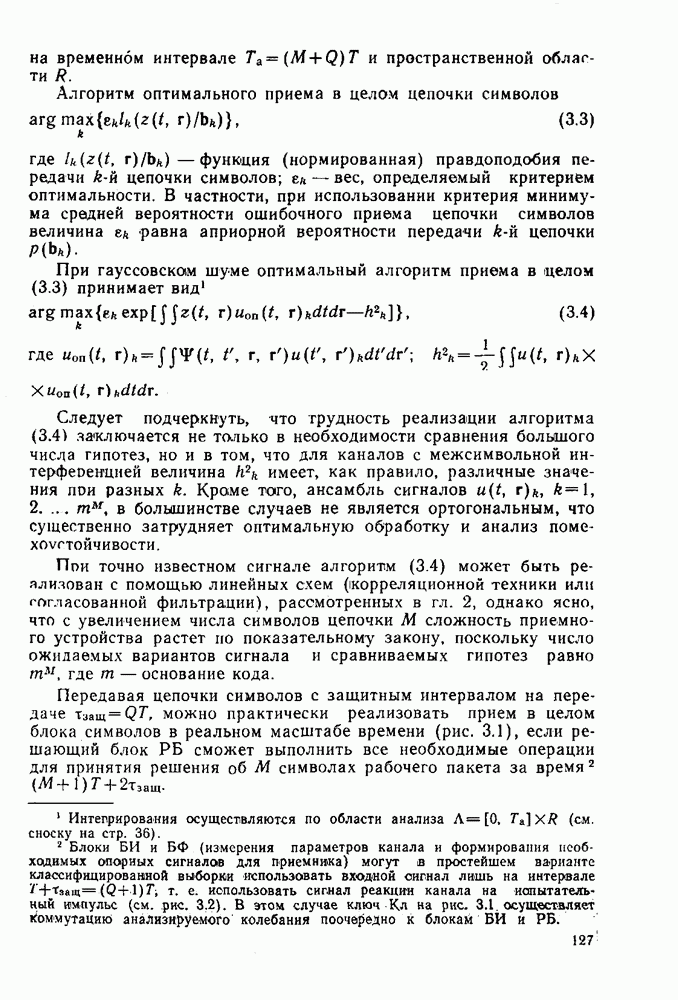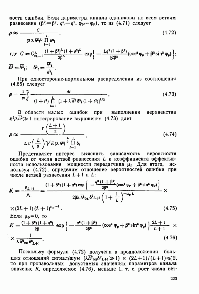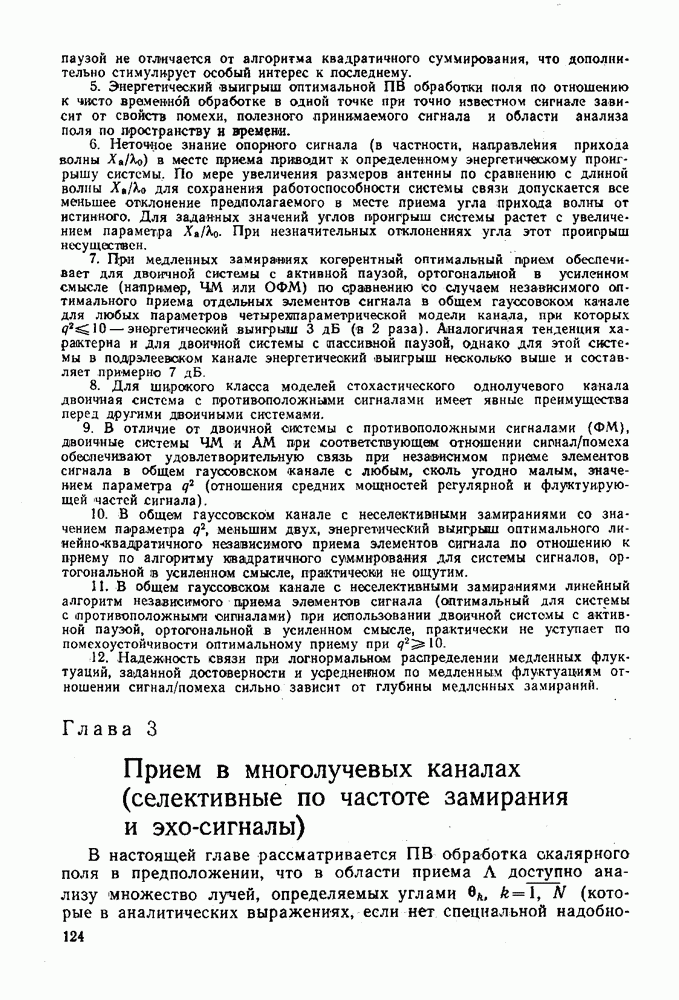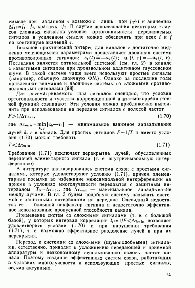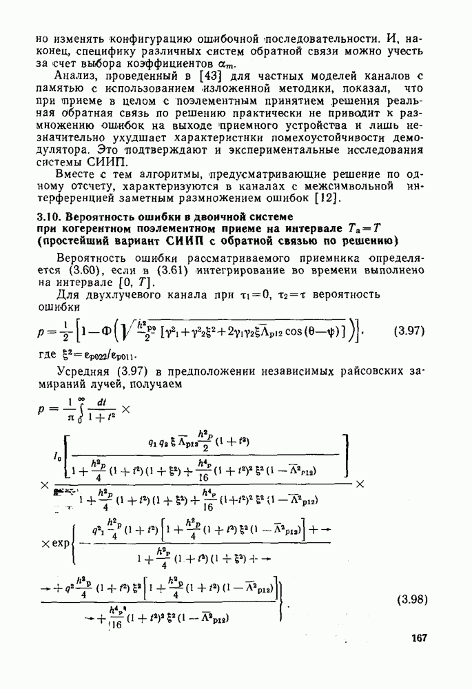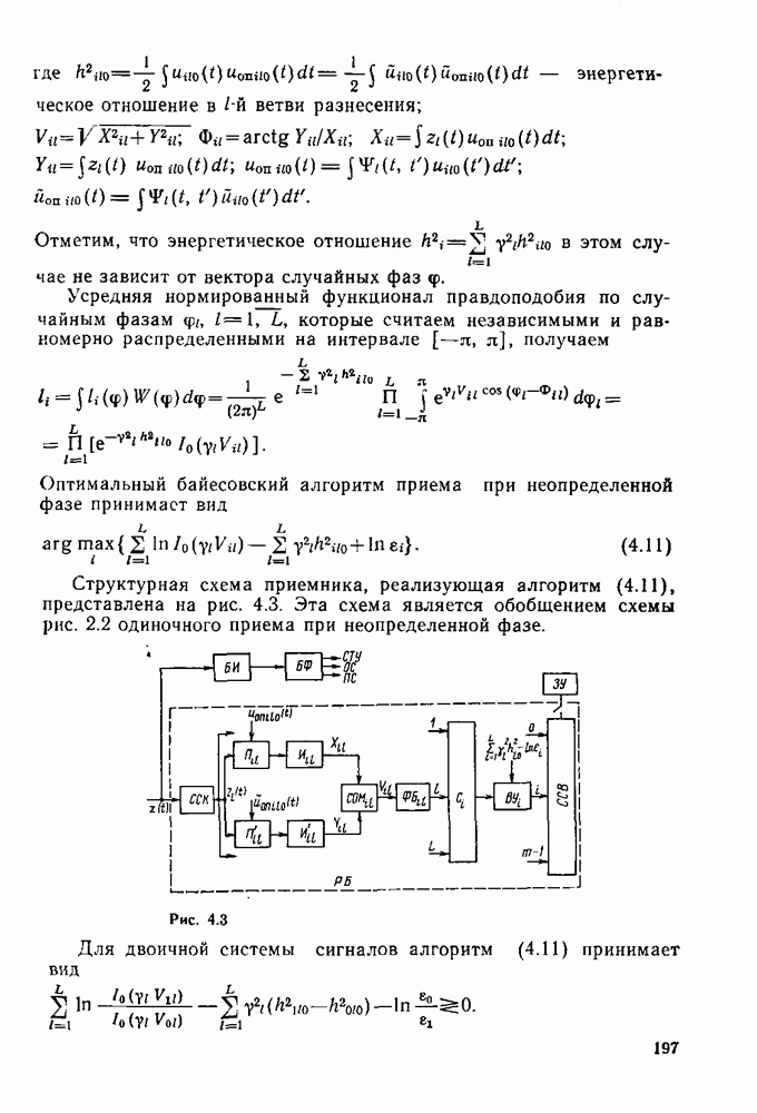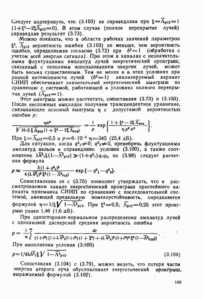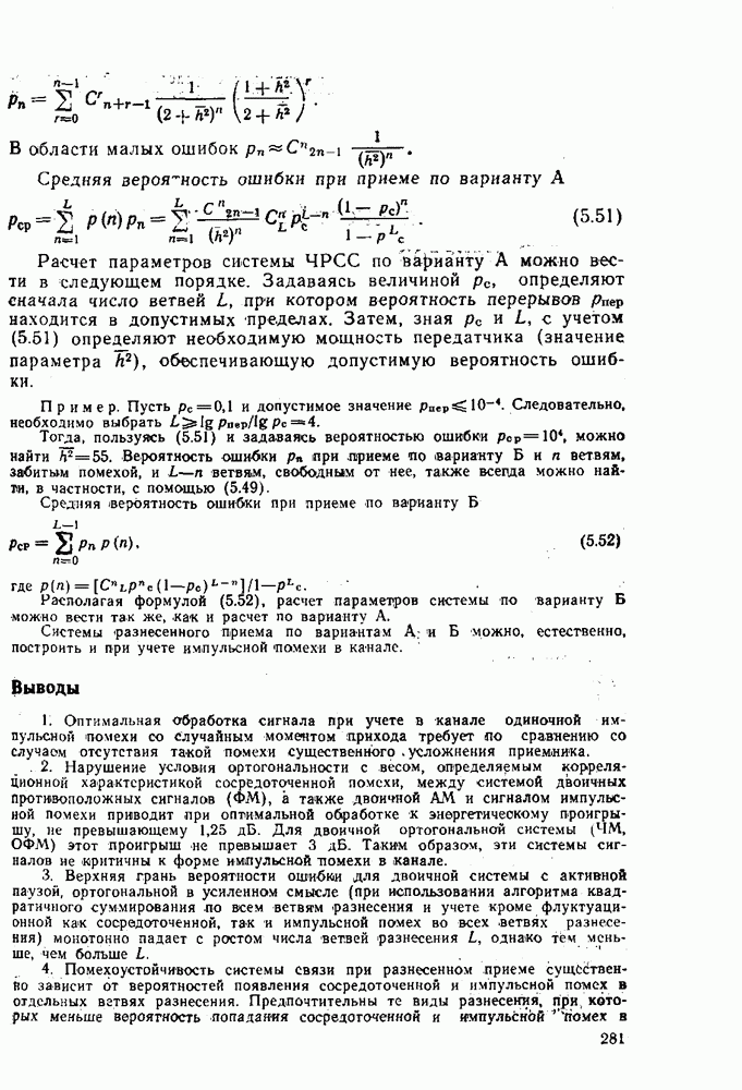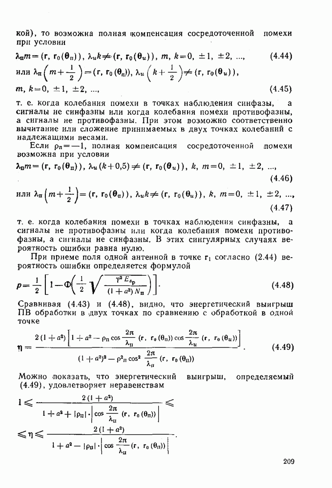 Из сравнения полученных выражений видно, что в каналах с небольшими значениями При Итак, для ортогональной в усиленном смысле системы с активной паузой прием по простому алгоритму квадратичного суммирования (2.132) дает примерно те же результаты, что и более трудная для реализации оптимальная схема. Оценим энергетический проигрыш, связанный с потерей оптимальности (условие Анализ, проведенный в работе [176] для обобщенного рэлеевского канала, показывает, что этот проигрыш монотонно растет с увеличением Таблица 2.7 (см. скан) Из таблицы видно, что если коэффициент взаимной корреляции сигналов по огибающей не превышает 0,5, то энергетический проигрыш не превышает Оценим теперь эффективность простых многопозиционных кодов и одноканальных (по частоте) систем, используемых в четырехпараметрическом канале с гладкими замираниями при независимом приеме элементов сигнала. Для прямой (без канала обратной связи [97, 128]) системы передачи информации с В односторонне-нормальном канале в области малых ошибок с учетом (2.136).