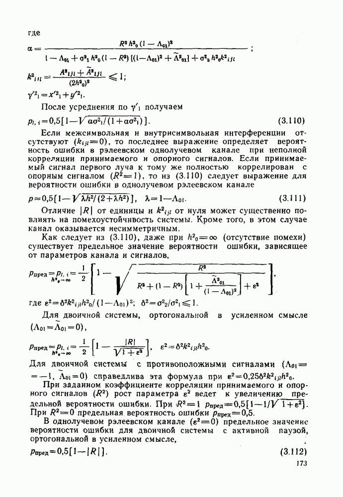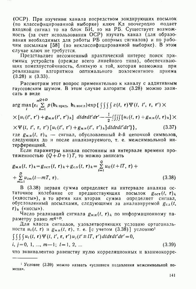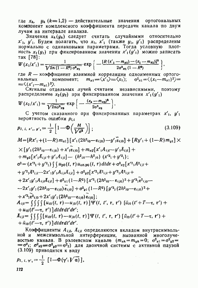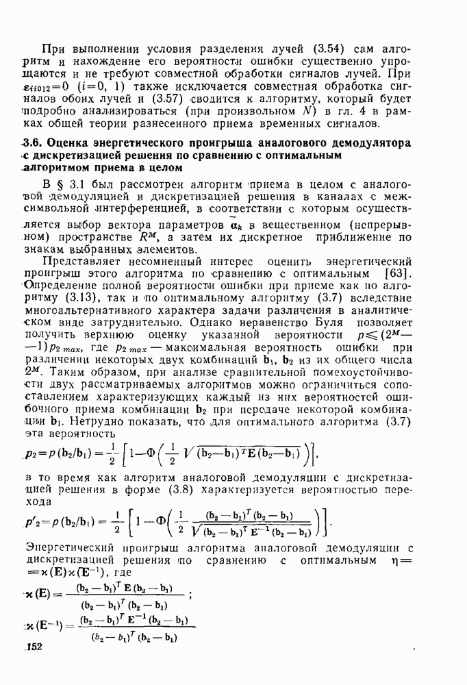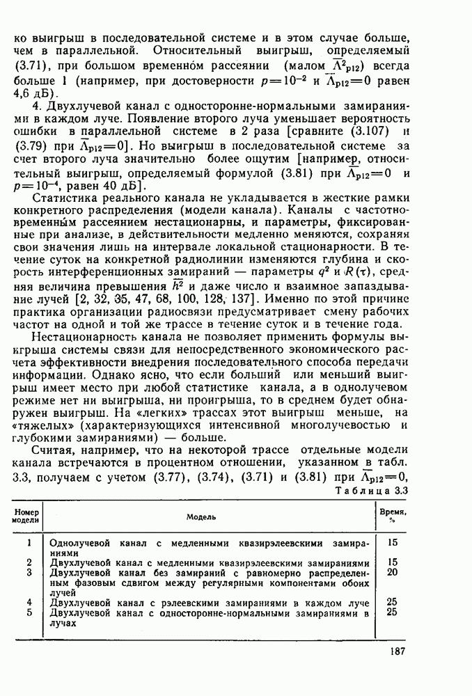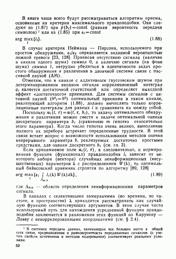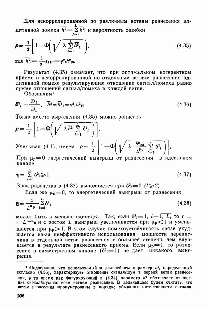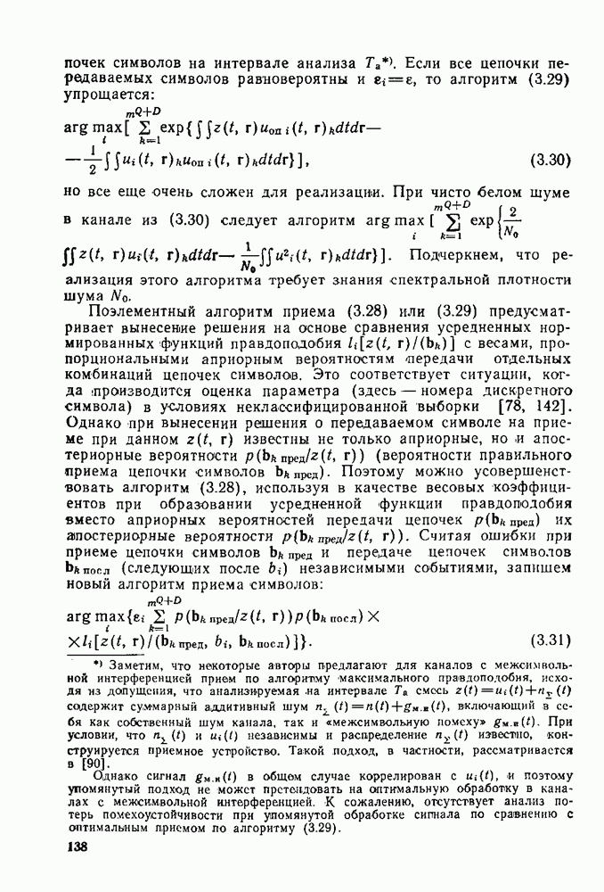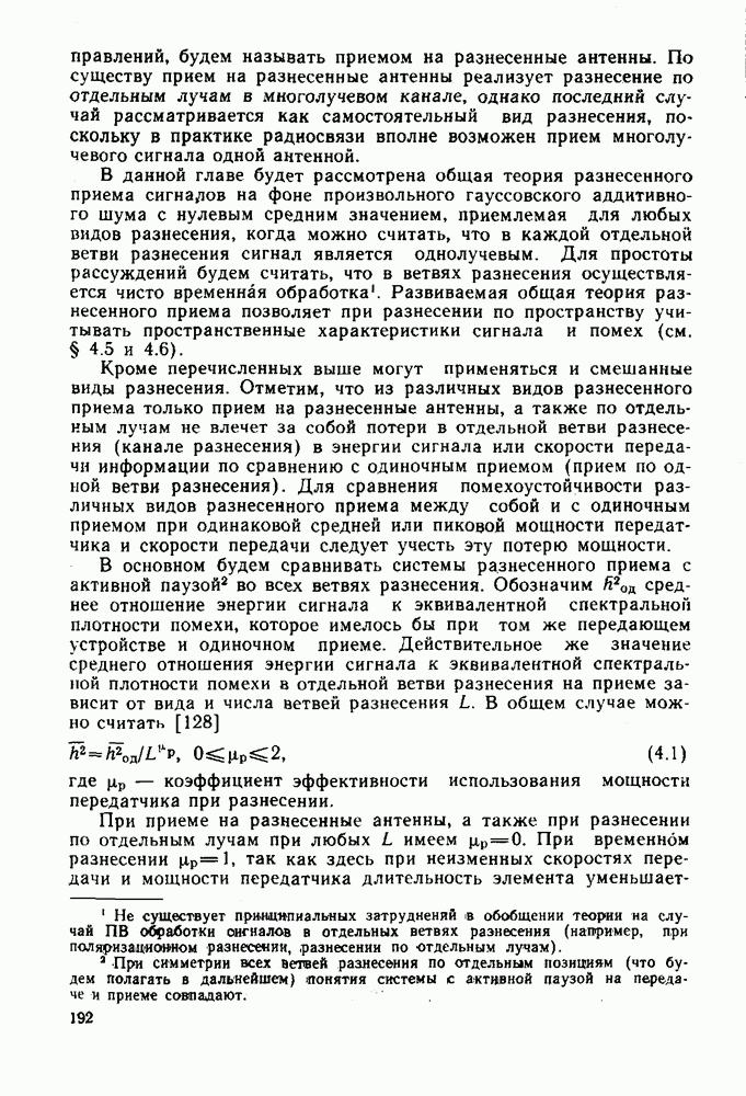 Из сравнения полученных выражений видно, что в каналах с небольшими значениями При Итак, для ортогональной в усиленном смысле системы с активной паузой прием по простому алгоритму квадратичного суммирования (2.132) дает примерно те же результаты, что и более трудная для реализации оптимальная схема. Оценим энергетический проигрыш, связанный с потерей оптимальности (условие Анализ, проведенный в работе [176] для обобщенного рэлеевского канала, показывает, что этот проигрыш монотонно растет с увеличением Таблица 2.7 (см. скан) Из таблицы видно, что если коэффициент взаимной корреляции сигналов по огибающей не превышает 0,5, то энергетический проигрыш не превышает Оценим теперь эффективность простых многопозиционных кодов и одноканальных (по частоте) систем, используемых в четырехпараметрическом канале с гладкими замираниями при независимом приеме элементов сигнала. Для прямой (без канала обратной связи [97, 128]) системы передачи информации с В односторонне-нормальном канале в области малых ошибок с учетом (2.136).