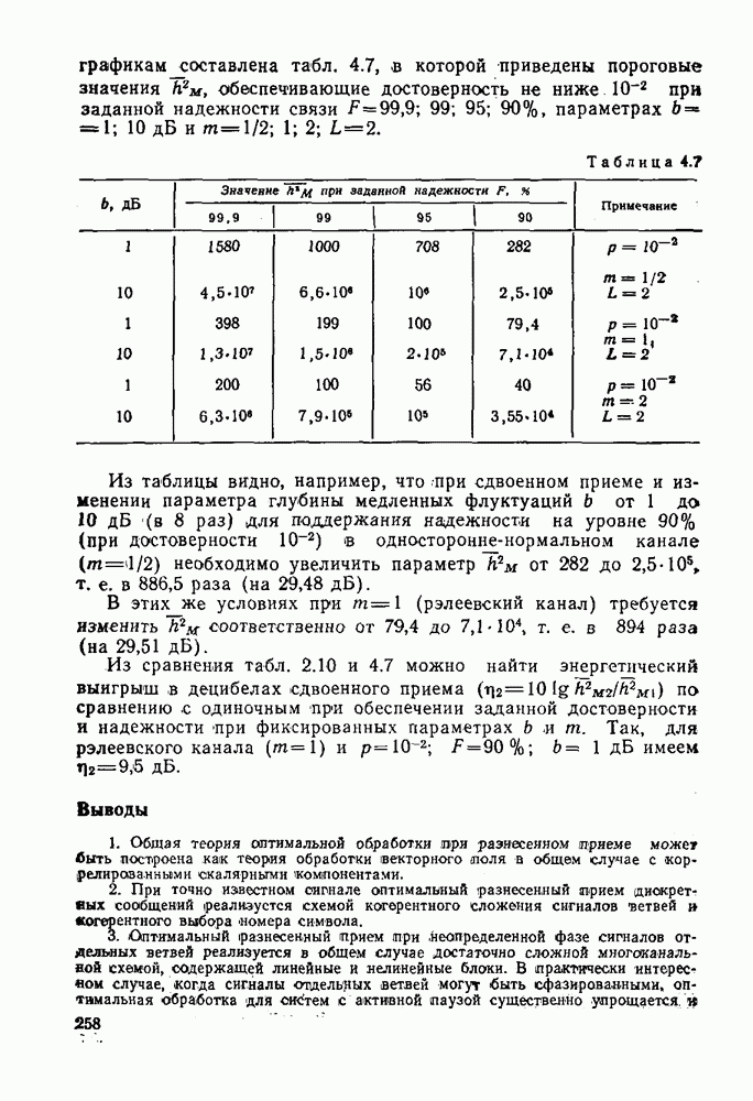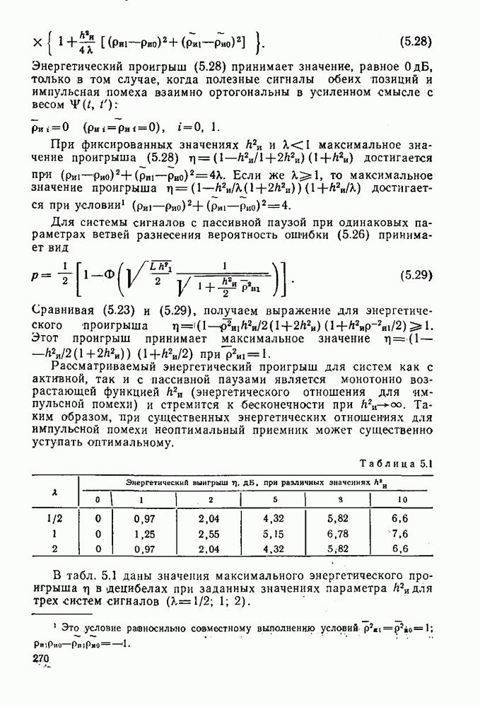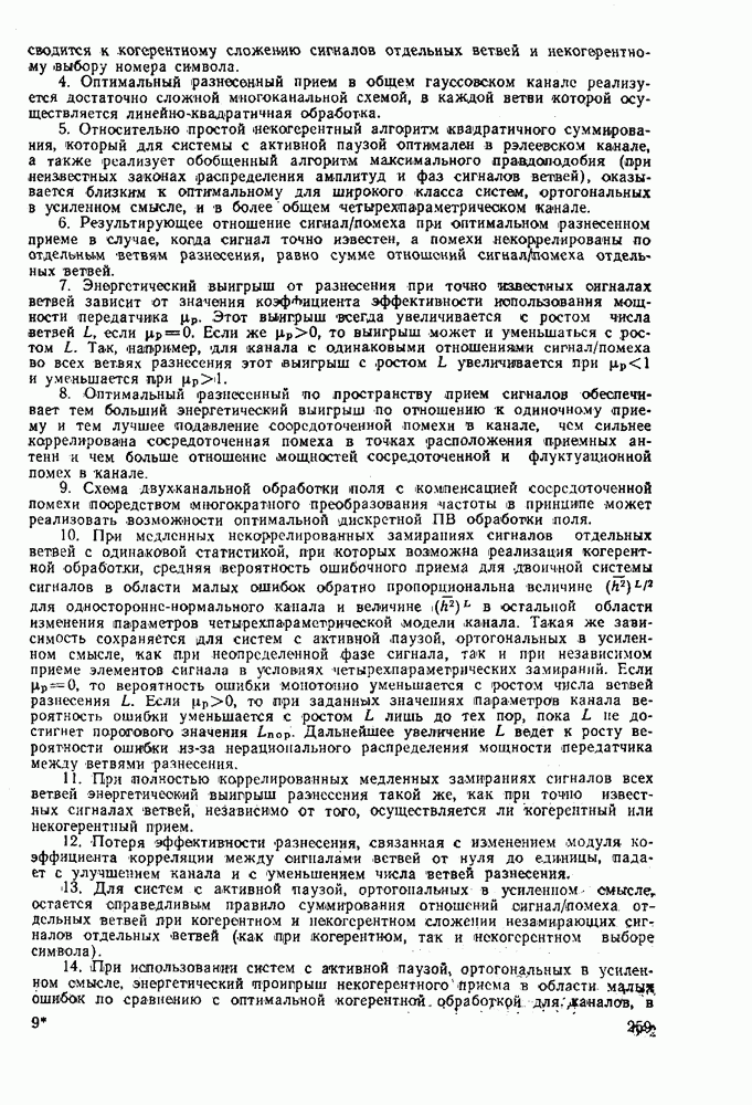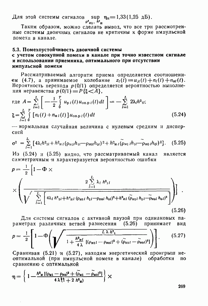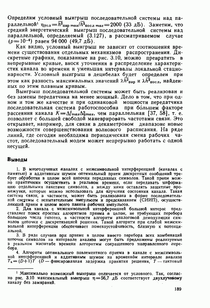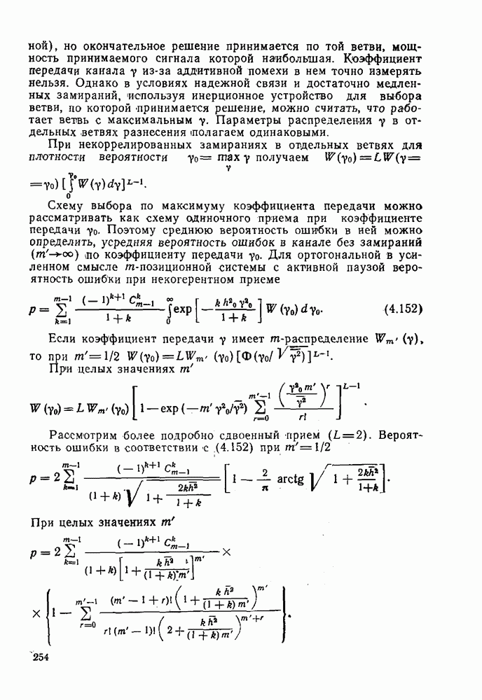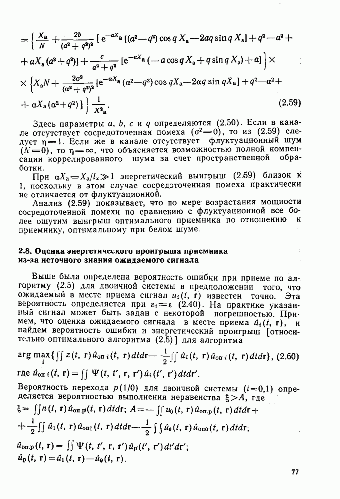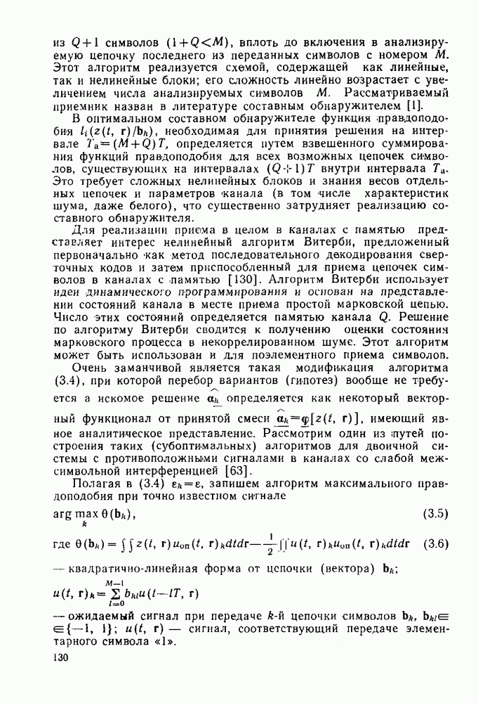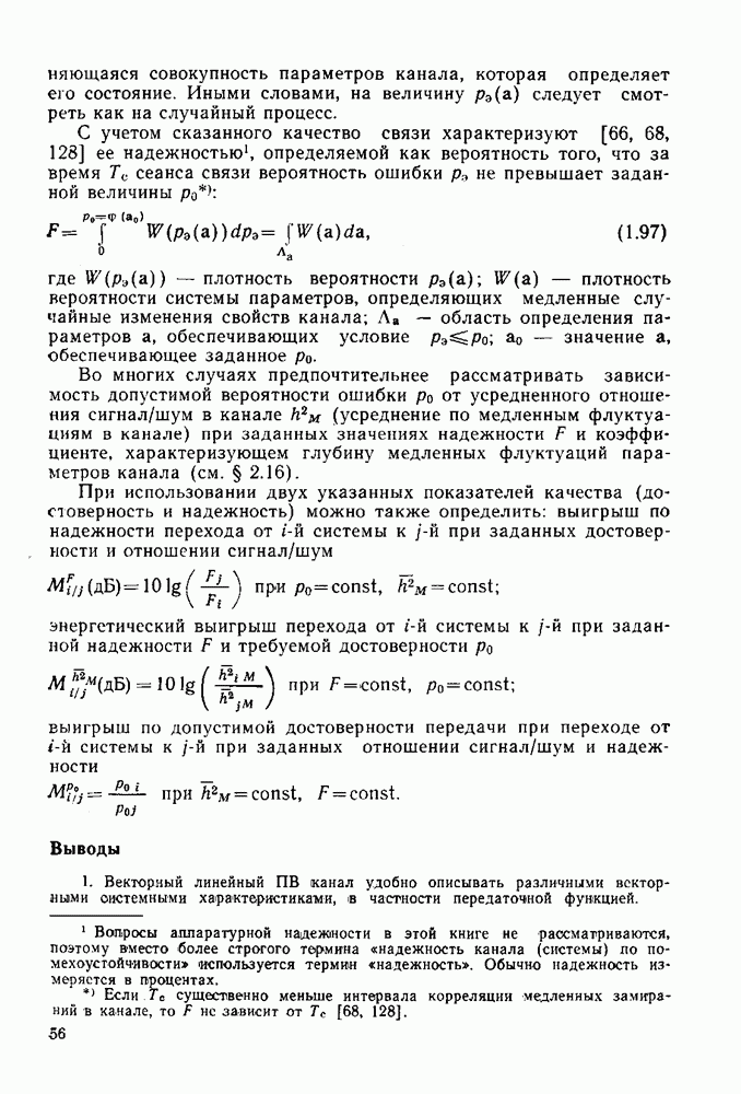 Из сравнения полученных выражений видно, что в каналах с небольшими значениями При Итак, для ортогональной в усиленном смысле системы с активной паузой прием по простому алгоритму квадратичного суммирования (2.132) дает примерно те же результаты, что и более трудная для реализации оптимальная схема. Оценим энергетический проигрыш, связанный с потерей оптимальности (условие Анализ, проведенный в работе [176] для обобщенного рэлеевского канала, показывает, что этот проигрыш монотонно растет с увеличением Таблица 2.7 (см. скан) Из таблицы видно, что если коэффициент взаимной корреляции сигналов по огибающей не превышает 0,5, то энергетический проигрыш не превышает Оценим теперь эффективность простых многопозиционных кодов и одноканальных (по частоте) систем, используемых в четырехпараметрическом канале с гладкими замираниями при независимом приеме элементов сигнала. Для прямой (без канала обратной связи [97, 128]) системы передачи информации с В односторонне-нормальном канале в области малых ошибок с учетом (2.136).