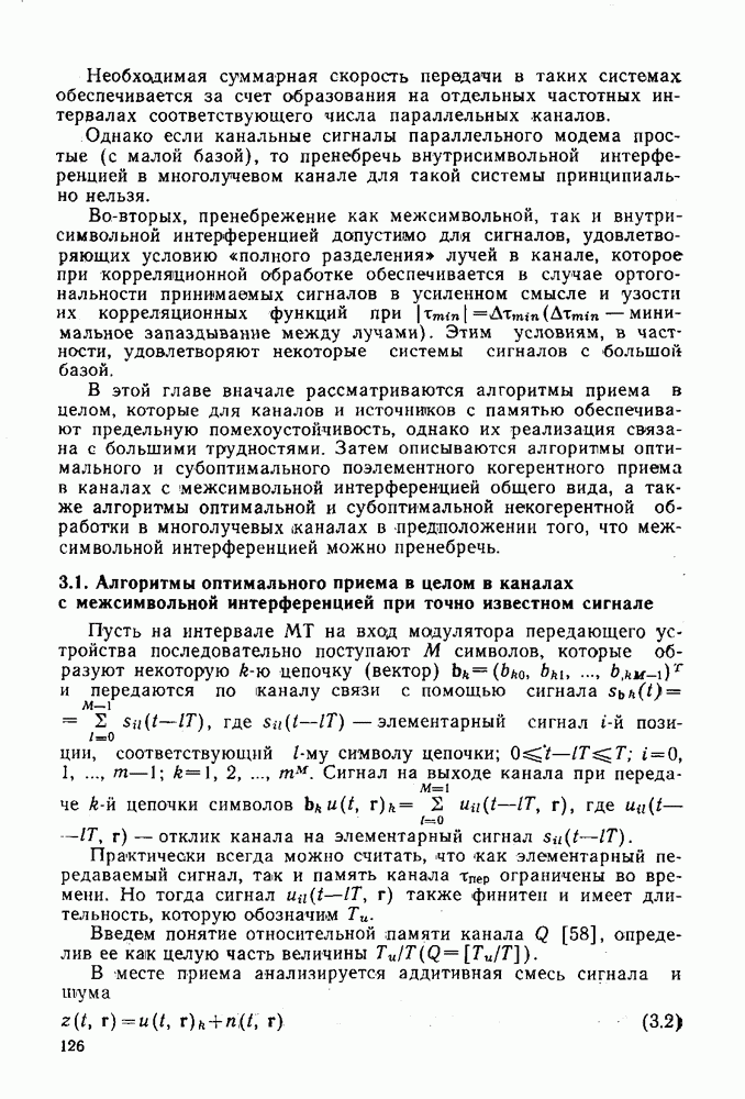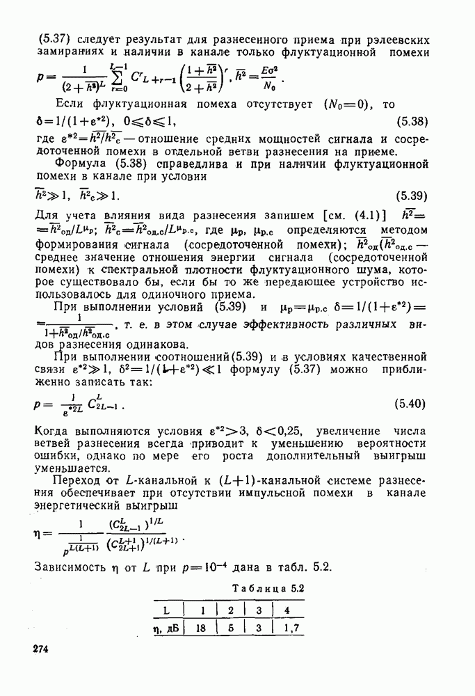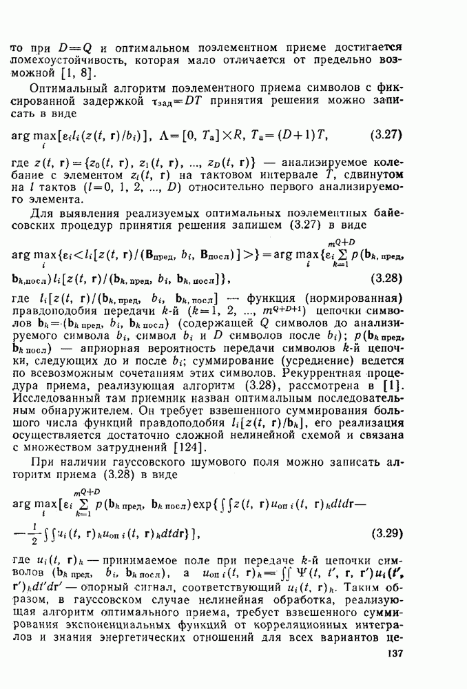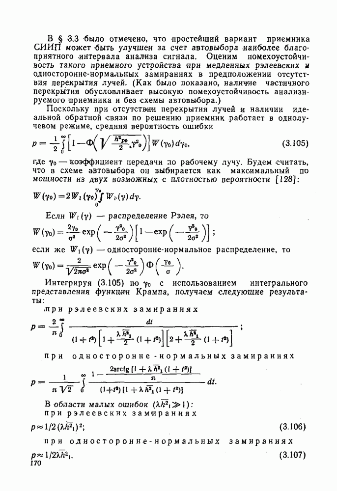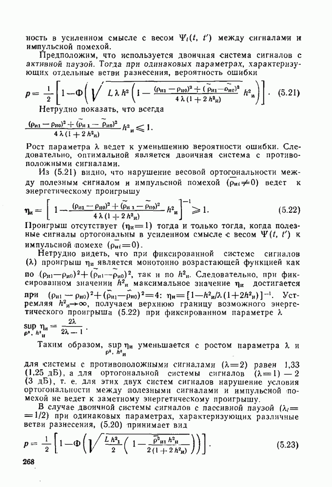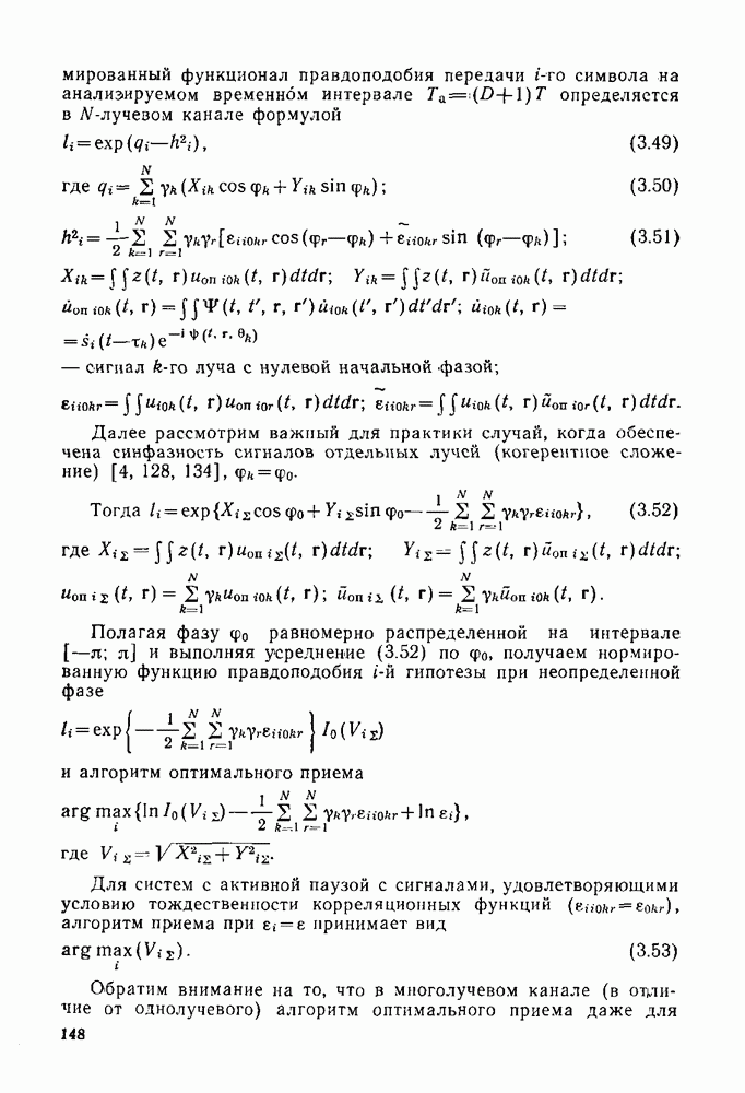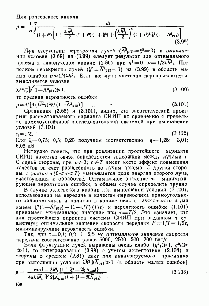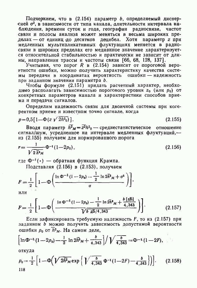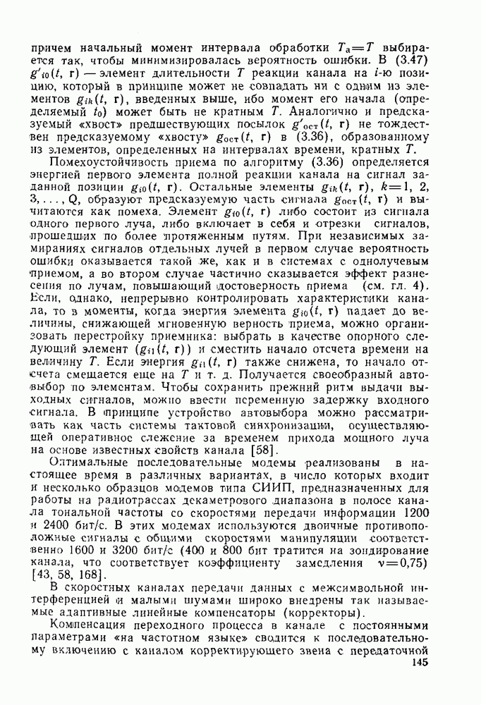 Из сравнения полученных выражений видно, что в каналах с небольшими значениями При Итак, для ортогональной в усиленном смысле системы с активной паузой прием по простому алгоритму квадратичного суммирования (2.132) дает примерно те же результаты, что и более трудная для реализации оптимальная схема. Оценим энергетический проигрыш, связанный с потерей оптимальности (условие Анализ, проведенный в работе [176] для обобщенного рэлеевского канала, показывает, что этот проигрыш монотонно растет с увеличением Таблица 2.7 (см. скан) Из таблицы видно, что если коэффициент взаимной корреляции сигналов по огибающей не превышает 0,5, то энергетический проигрыш не превышает Оценим теперь эффективность простых многопозиционных кодов и одноканальных (по частоте) систем, используемых в четырехпараметрическом канале с гладкими замираниями при независимом приеме элементов сигнала. Для прямой (без канала обратной связи [97, 128]) системы передачи информации с В односторонне-нормальном канале в области малых ошибок с учетом (2.136).