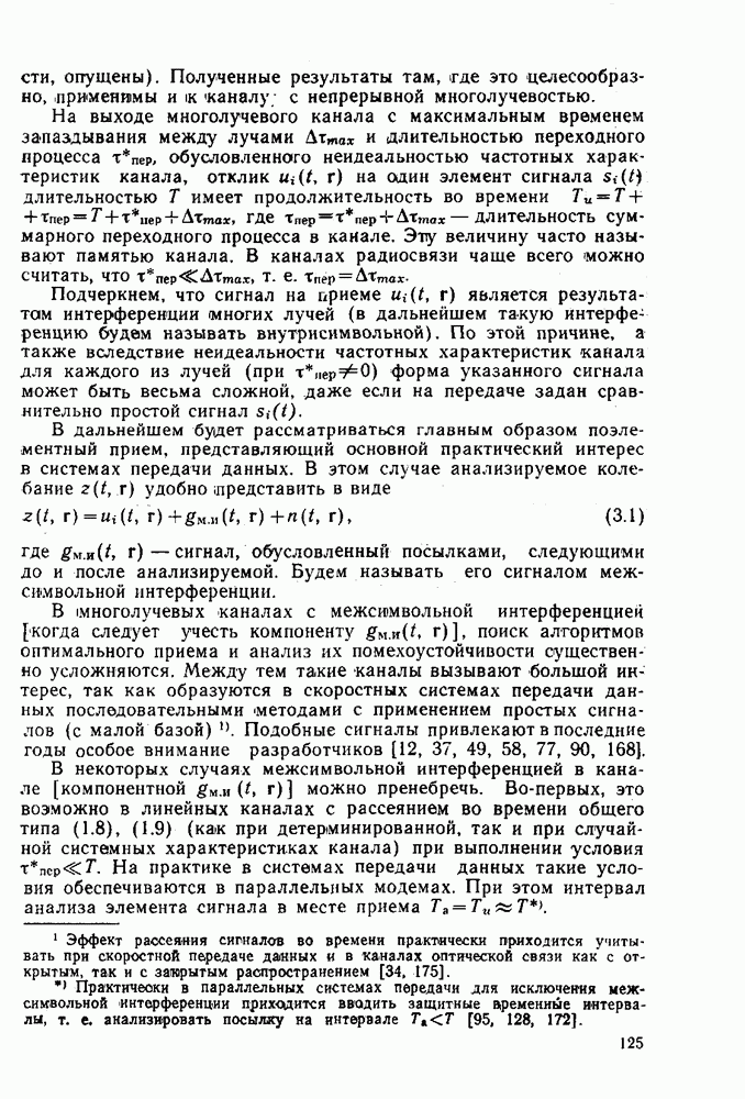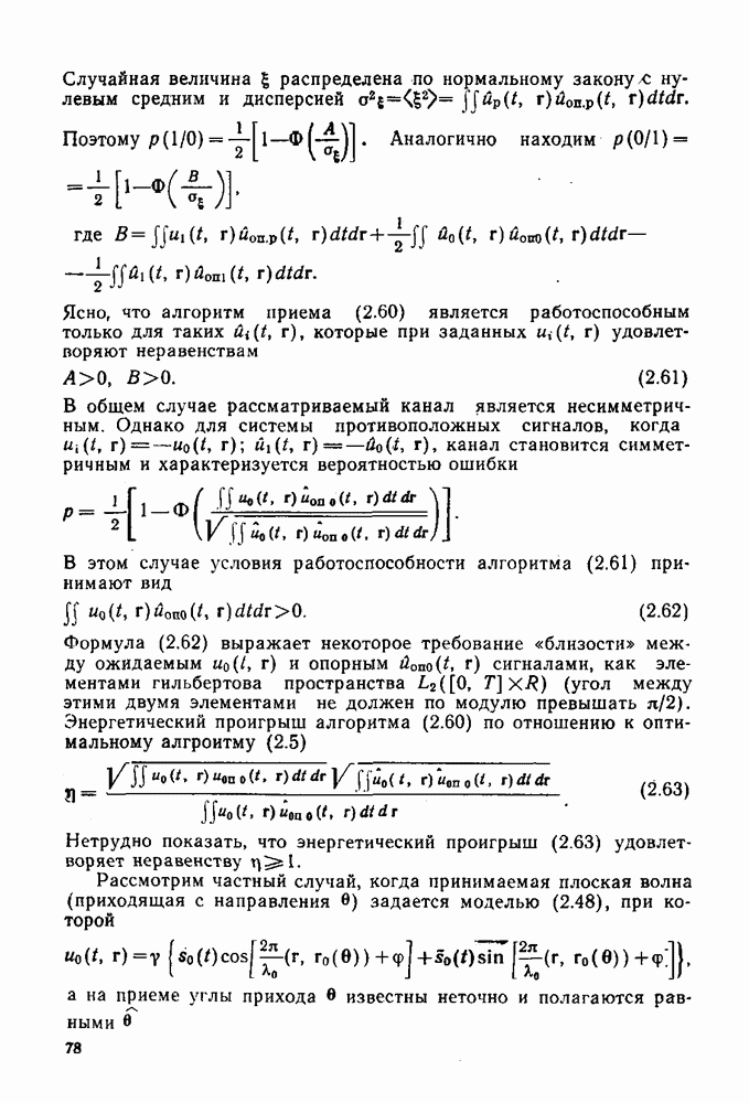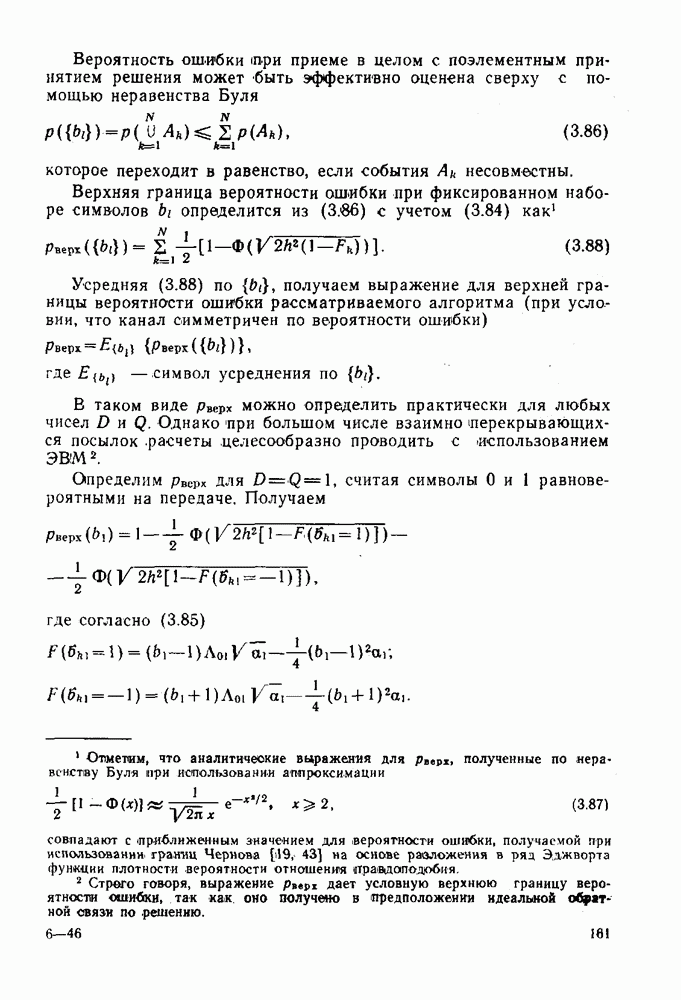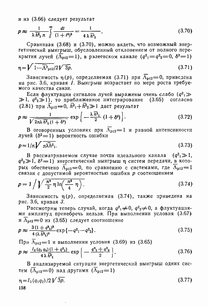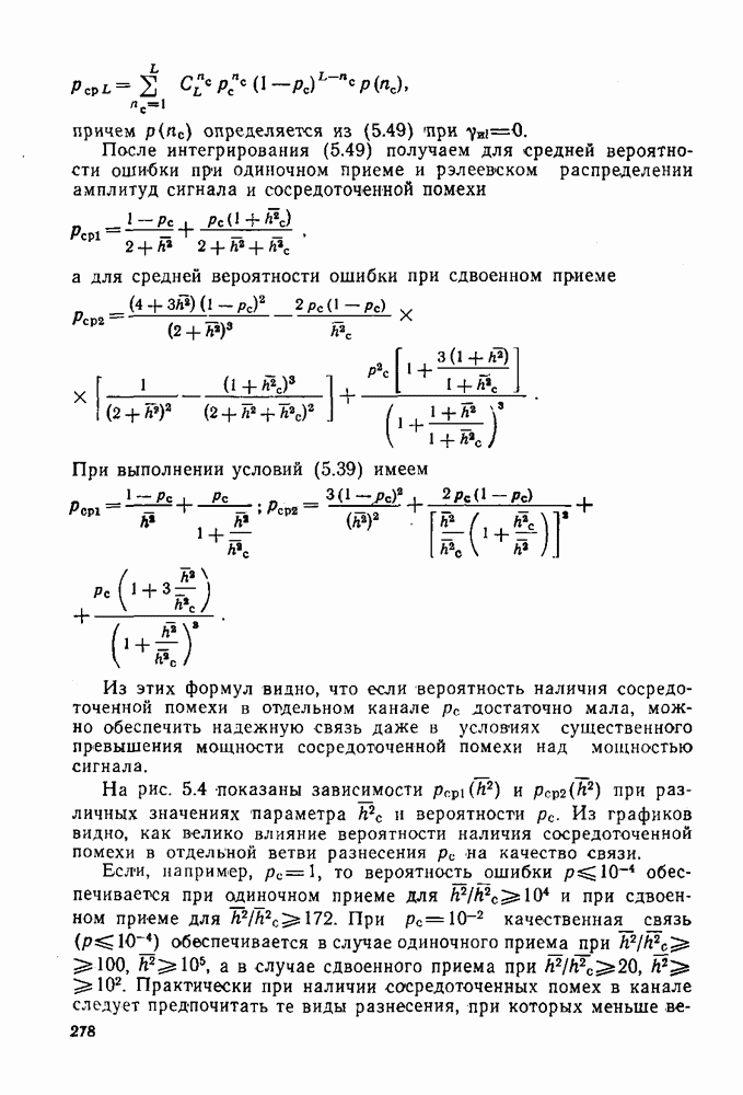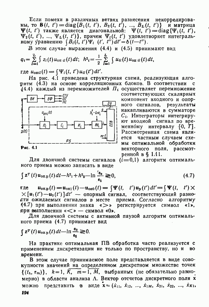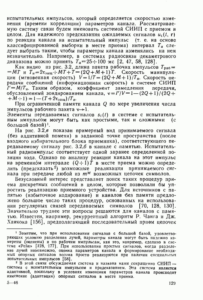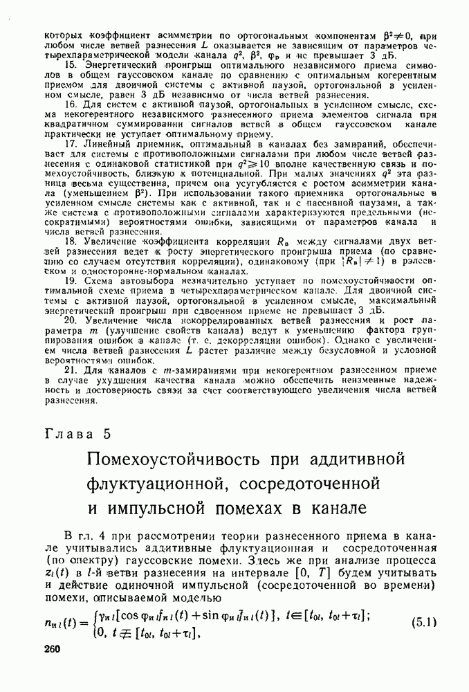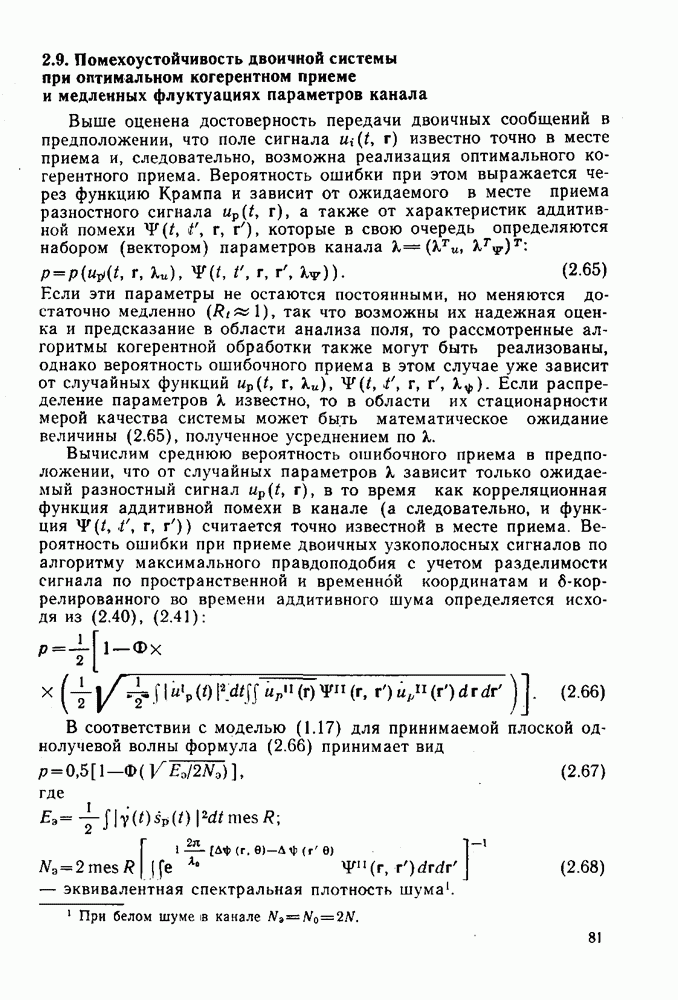 Из сравнения полученных выражений видно, что в каналах с небольшими значениями При Итак, для ортогональной в усиленном смысле системы с активной паузой прием по простому алгоритму квадратичного суммирования (2.132) дает примерно те же результаты, что и более трудная для реализации оптимальная схема. Оценим энергетический проигрыш, связанный с потерей оптимальности (условие Анализ, проведенный в работе [176] для обобщенного рэлеевского канала, показывает, что этот проигрыш монотонно растет с увеличением Таблица 2.7 (см. скан) Из таблицы видно, что если коэффициент взаимной корреляции сигналов по огибающей не превышает 0,5, то энергетический проигрыш не превышает Оценим теперь эффективность простых многопозиционных кодов и одноканальных (по частоте) систем, используемых в четырехпараметрическом канале с гладкими замираниями при независимом приеме элементов сигнала. Для прямой (без канала обратной связи [97, 128]) системы передачи информации с В односторонне-нормальном канале в области малых ошибок с учетом (2.136).