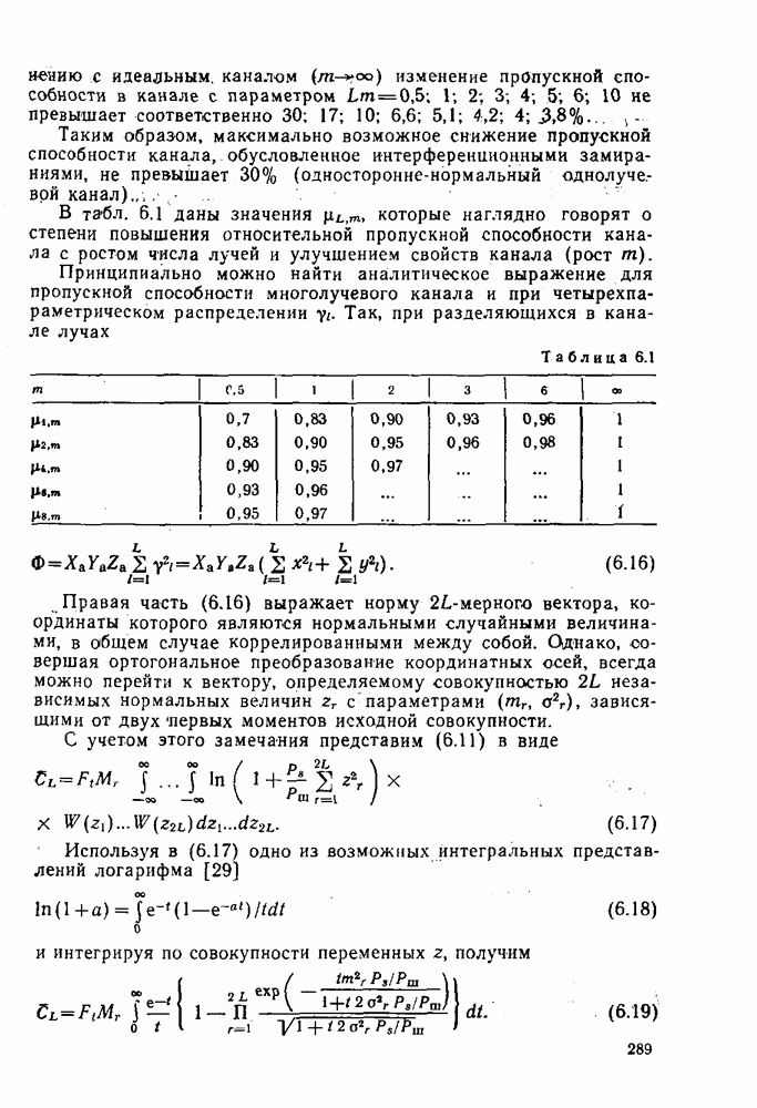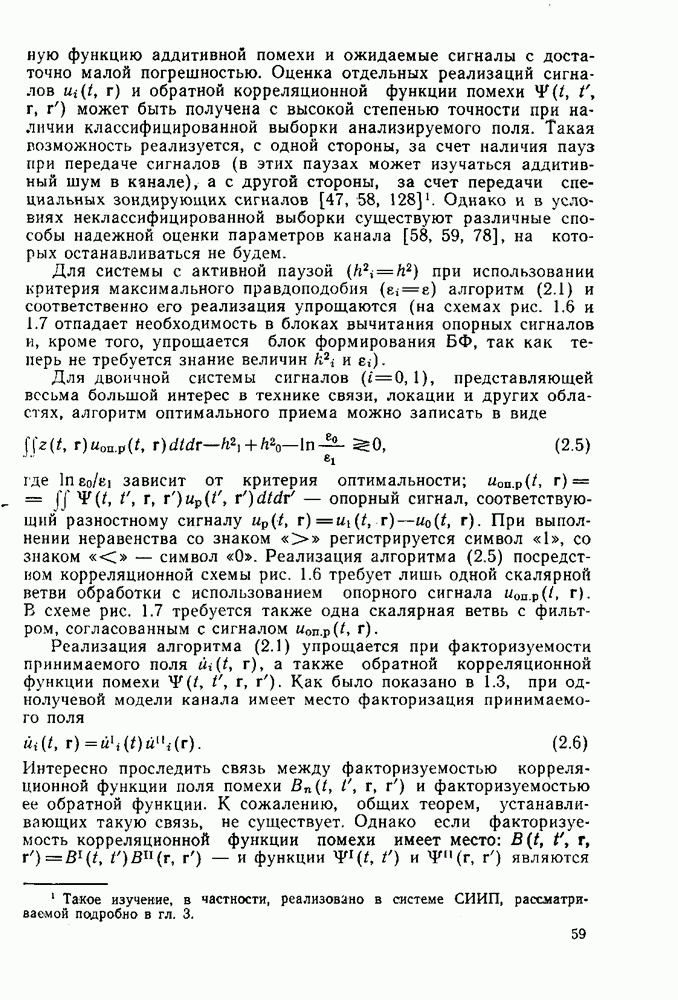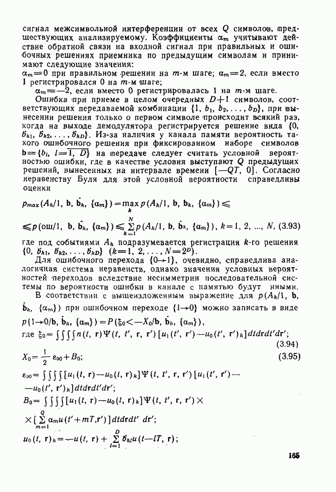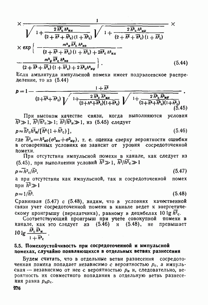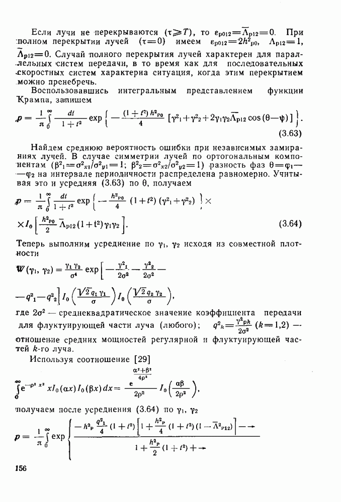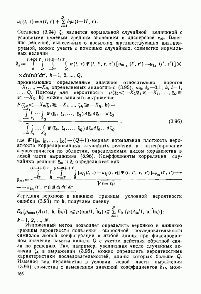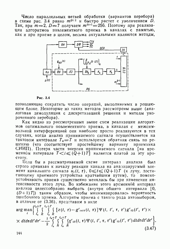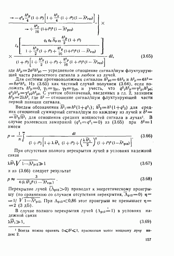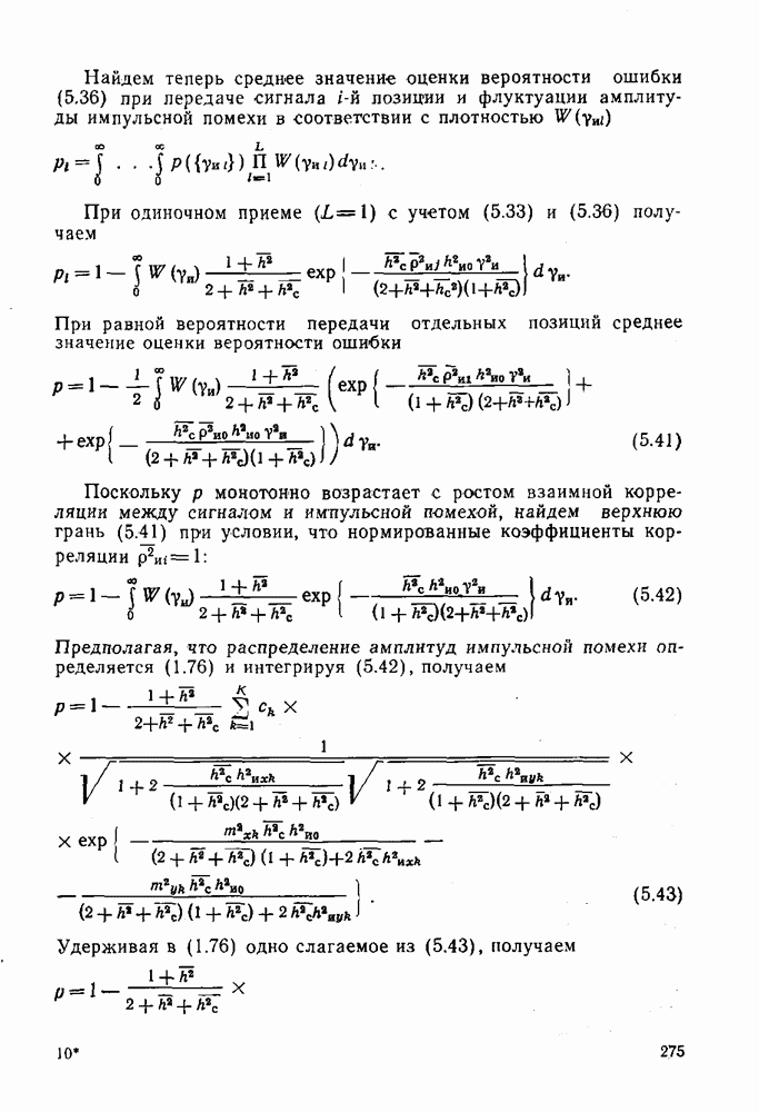 Из сравнения полученных выражений видно, что в каналах с небольшими значениями При Итак, для ортогональной в усиленном смысле системы с активной паузой прием по простому алгоритму квадратичного суммирования (2.132) дает примерно те же результаты, что и более трудная для реализации оптимальная схема. Оценим энергетический проигрыш, связанный с потерей оптимальности (условие Анализ, проведенный в работе [176] для обобщенного рэлеевского канала, показывает, что этот проигрыш монотонно растет с увеличением Таблица 2.7 (см. скан) Из таблицы видно, что если коэффициент взаимной корреляции сигналов по огибающей не превышает 0,5, то энергетический проигрыш не превышает Оценим теперь эффективность простых многопозиционных кодов и одноканальных (по частоте) систем, используемых в четырехпараметрическом канале с гладкими замираниями при независимом приеме элементов сигнала. Для прямой (без канала обратной связи [97, 128]) системы передачи информации с В односторонне-нормальном канале в области малых ошибок с учетом (2.136).