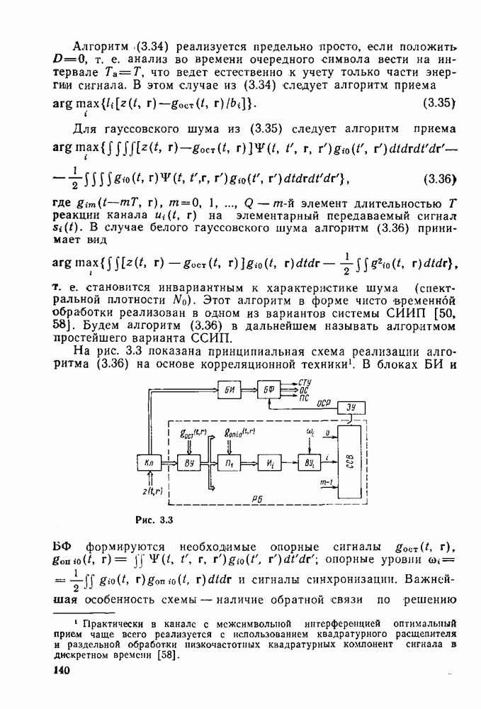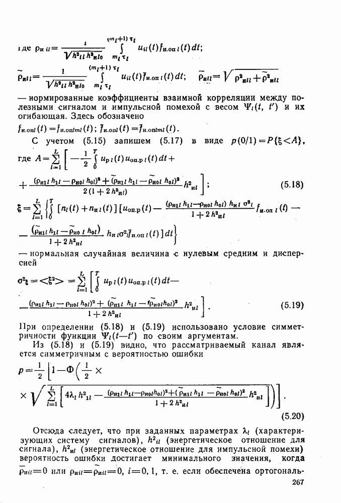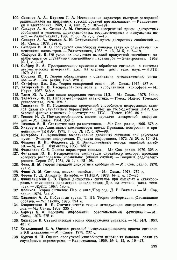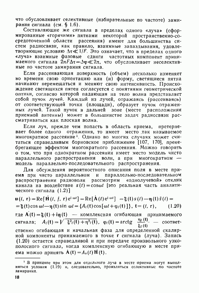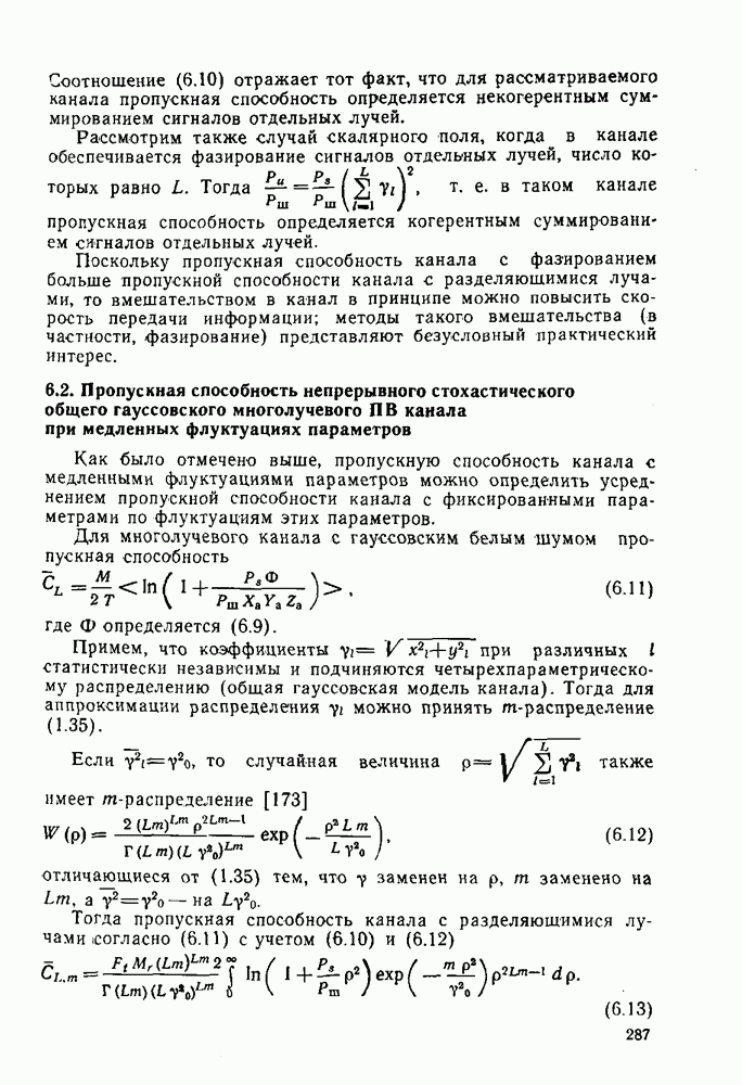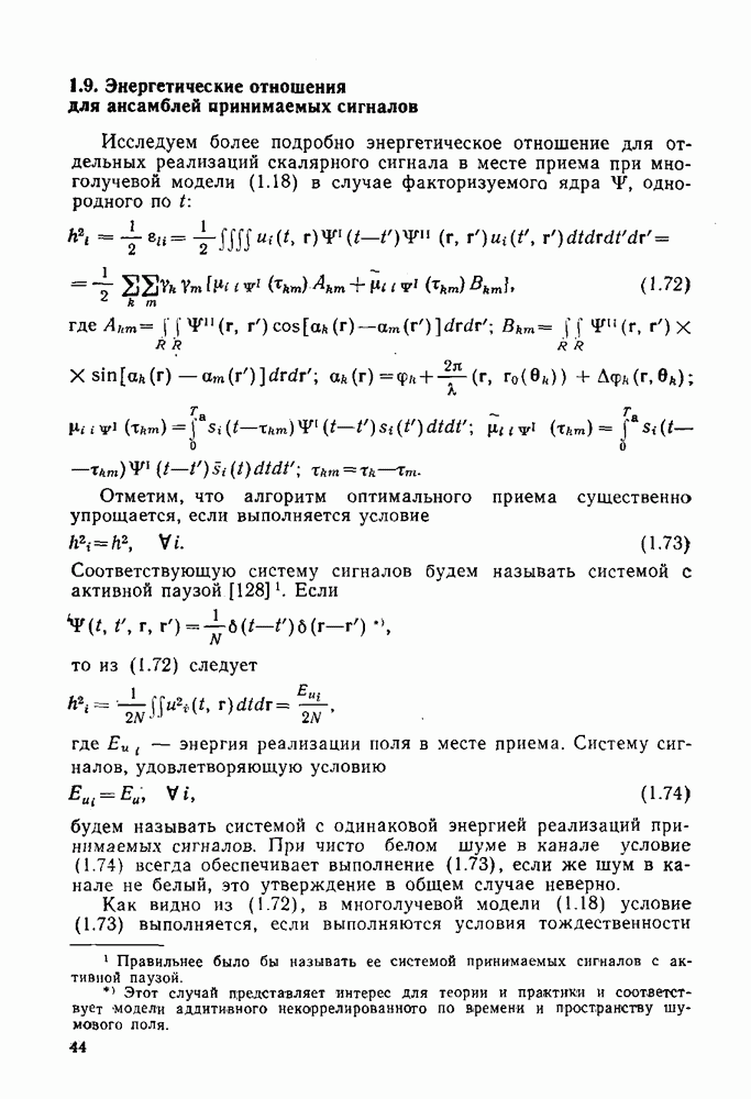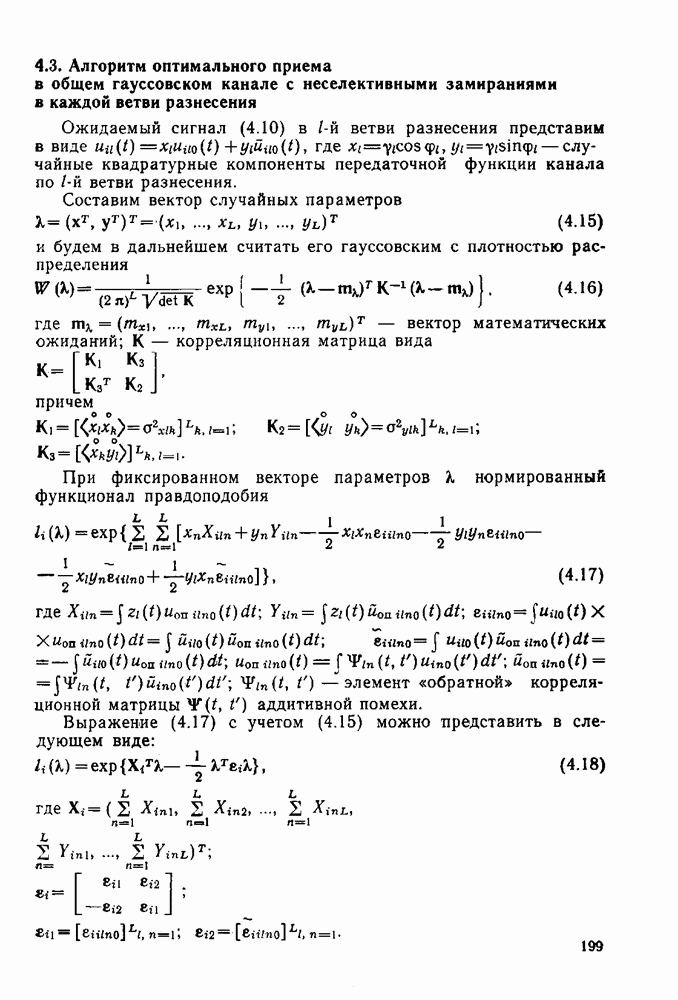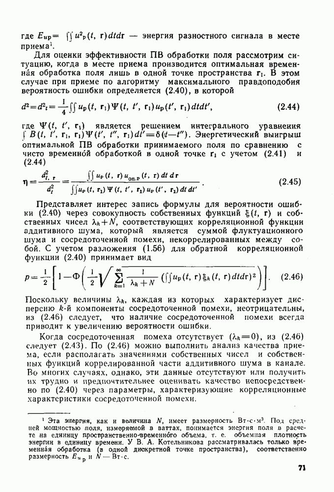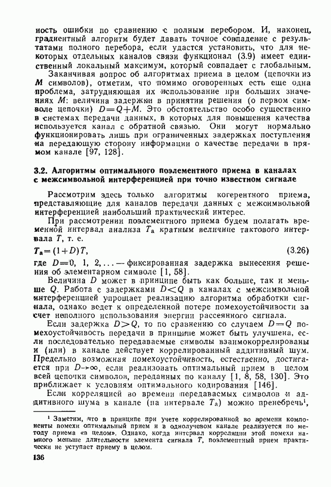 Из сравнения полученных выражений видно, что в каналах с небольшими значениями При Итак, для ортогональной в усиленном смысле системы с активной паузой прием по простому алгоритму квадратичного суммирования (2.132) дает примерно те же результаты, что и более трудная для реализации оптимальная схема. Оценим энергетический проигрыш, связанный с потерей оптимальности (условие Анализ, проведенный в работе [176] для обобщенного рэлеевского канала, показывает, что этот проигрыш монотонно растет с увеличением Таблица 2.7 (см. скан) Из таблицы видно, что если коэффициент взаимной корреляции сигналов по огибающей не превышает 0,5, то энергетический проигрыш не превышает Оценим теперь эффективность простых многопозиционных кодов и одноканальных (по частоте) систем, используемых в четырехпараметрическом канале с гладкими замираниями при независимом приеме элементов сигнала. Для прямой (без канала обратной связи [97, 128]) системы передачи информации с В односторонне-нормальном канале в области малых ошибок с учетом (2.136).