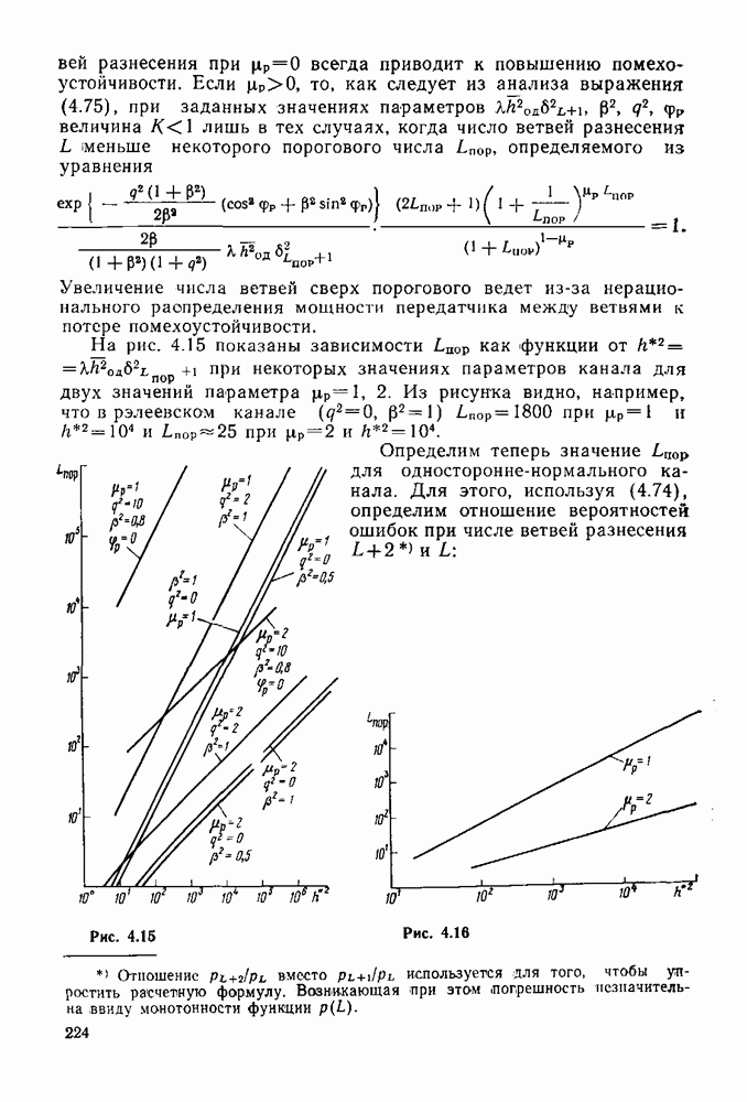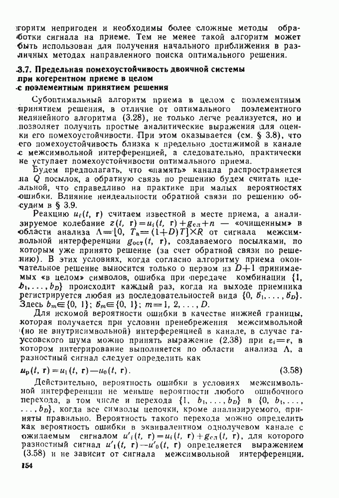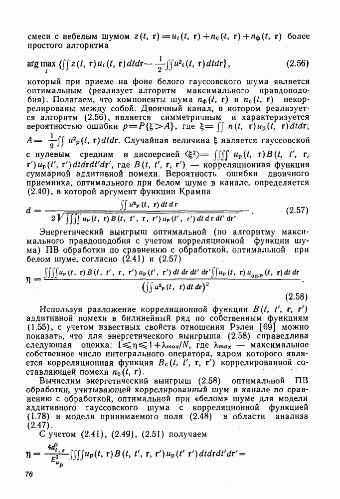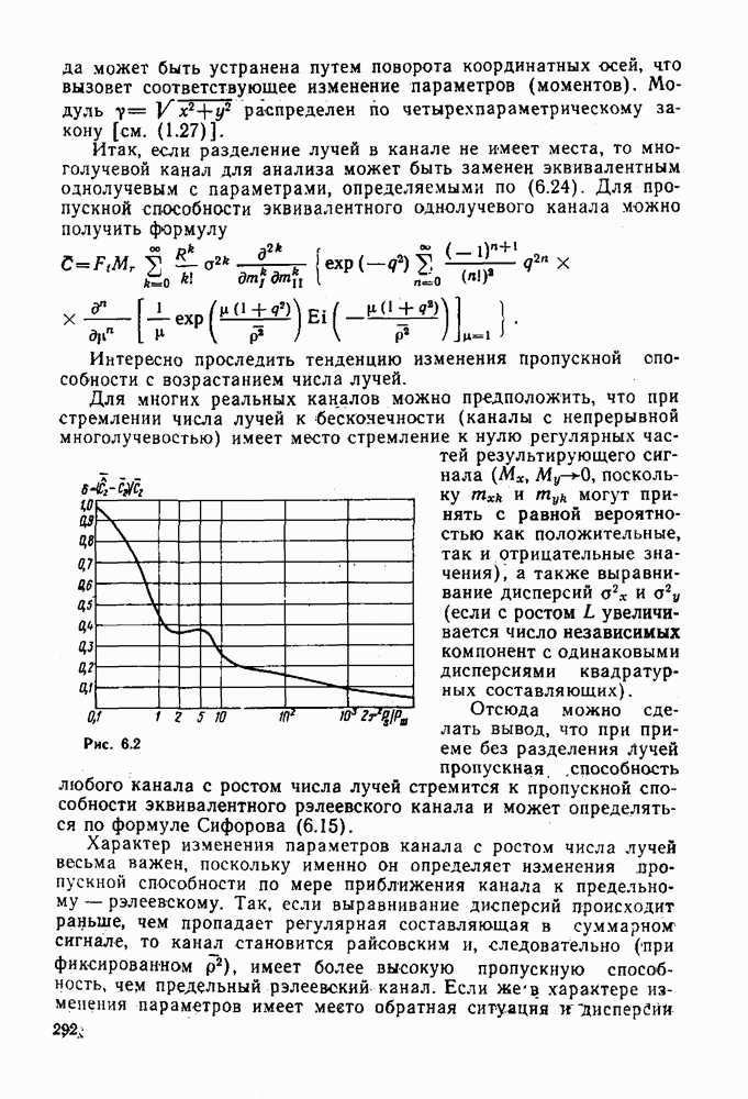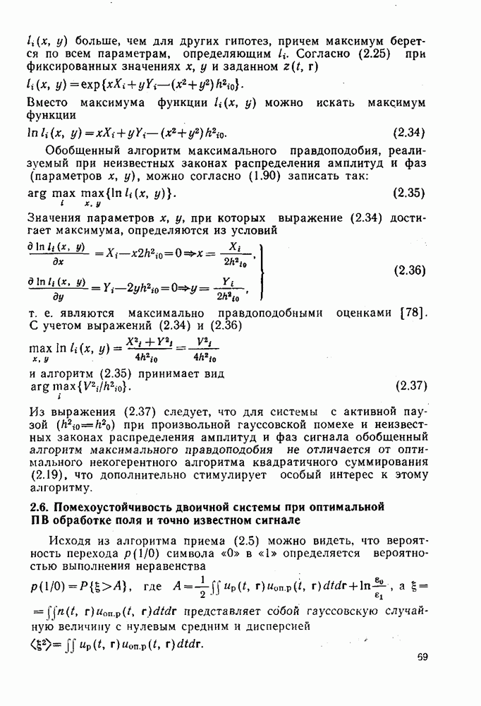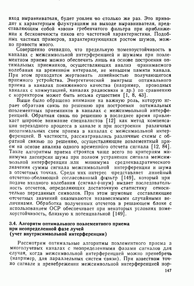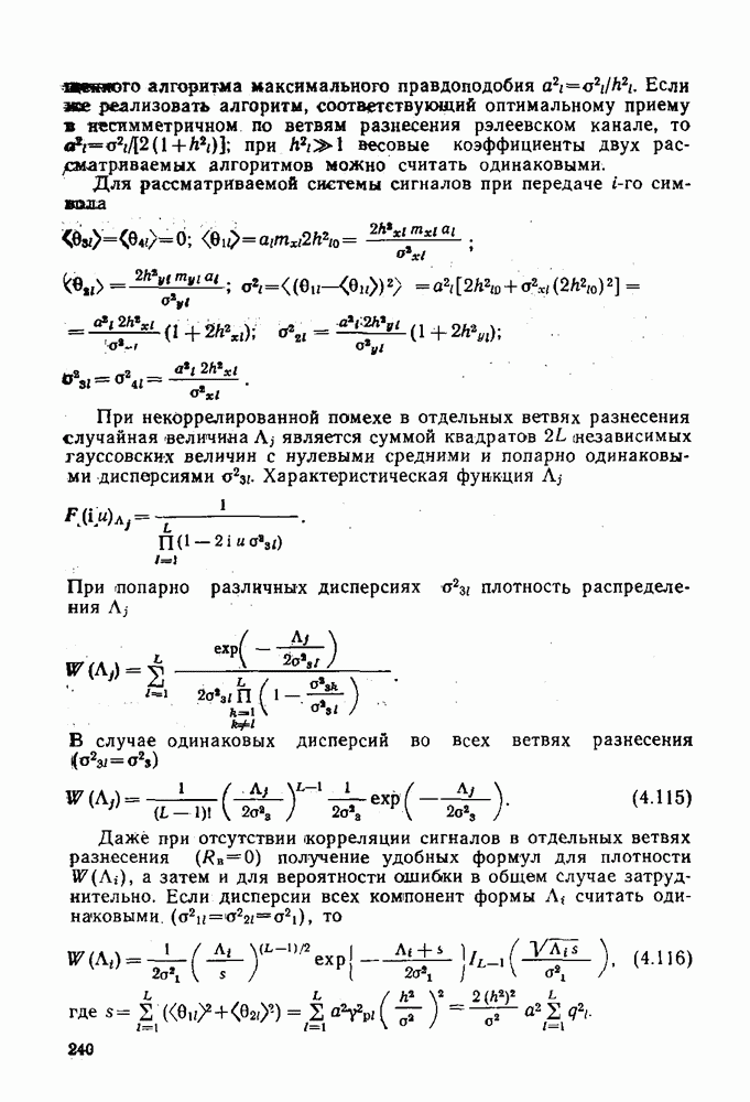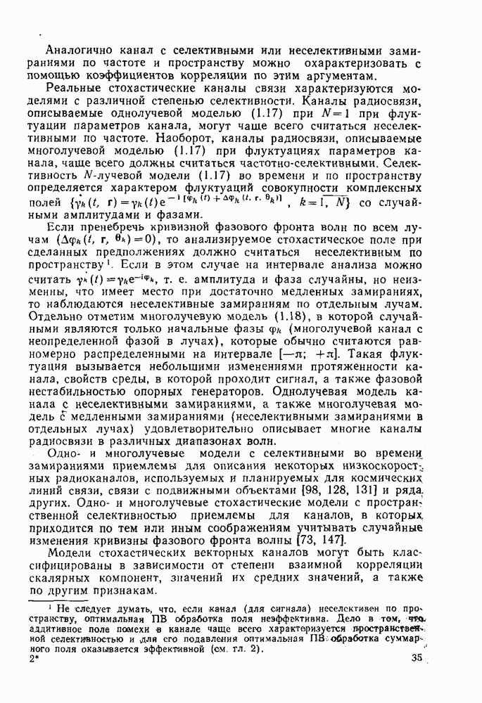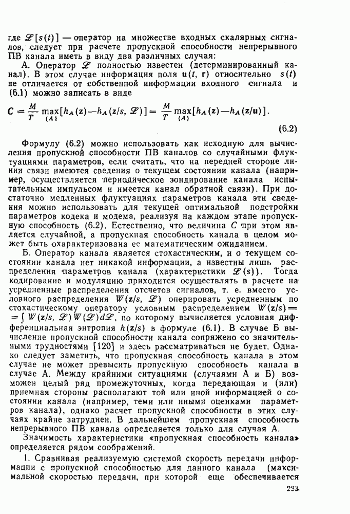 Из сравнения полученных выражений видно, что в каналах с небольшими значениями При Итак, для ортогональной в усиленном смысле системы с активной паузой прием по простому алгоритму квадратичного суммирования (2.132) дает примерно те же результаты, что и более трудная для реализации оптимальная схема. Оценим энергетический проигрыш, связанный с потерей оптимальности (условие Анализ, проведенный в работе [176] для обобщенного рэлеевского канала, показывает, что этот проигрыш монотонно растет с увеличением Таблица 2.7 (см. скан) Из таблицы видно, что если коэффициент взаимной корреляции сигналов по огибающей не превышает 0,5, то энергетический проигрыш не превышает Оценим теперь эффективность простых многопозиционных кодов и одноканальных (по частоте) систем, используемых в четырехпараметрическом канале с гладкими замираниями при независимом приеме элементов сигнала. Для прямой (без канала обратной связи [97, 128]) системы передачи информации с В односторонне-нормальном канале в области малых ошибок с учетом (2.136).