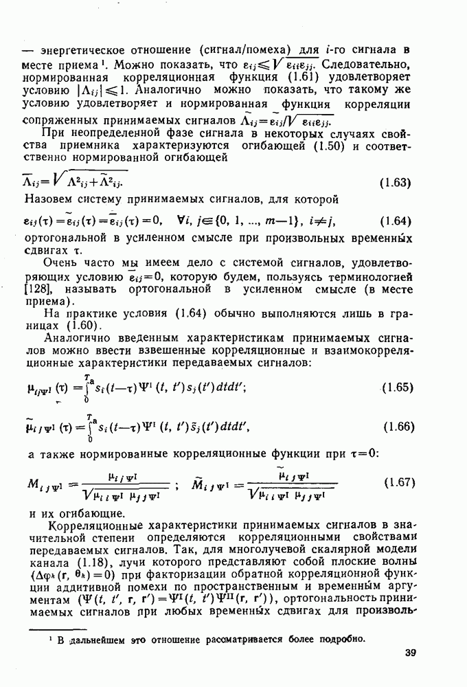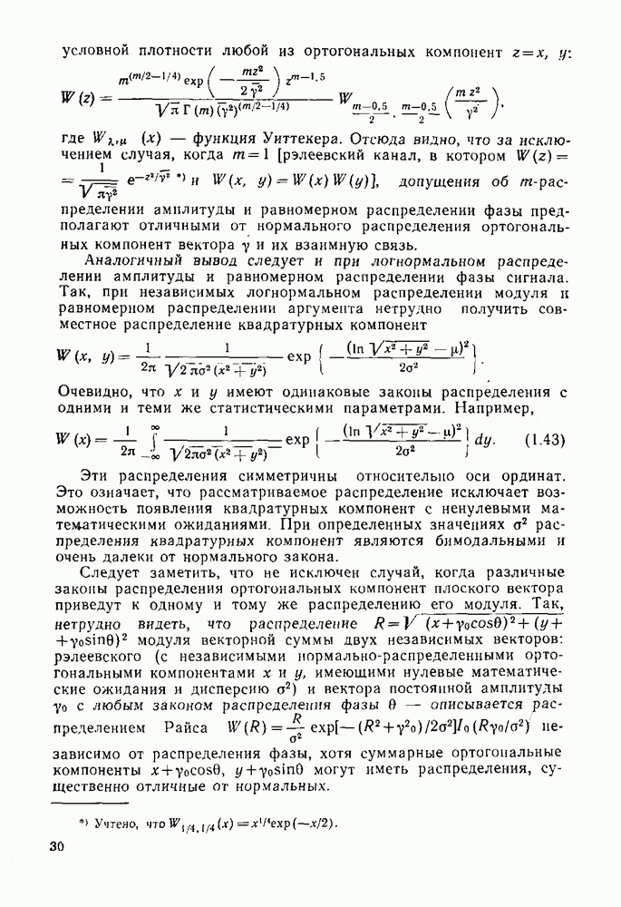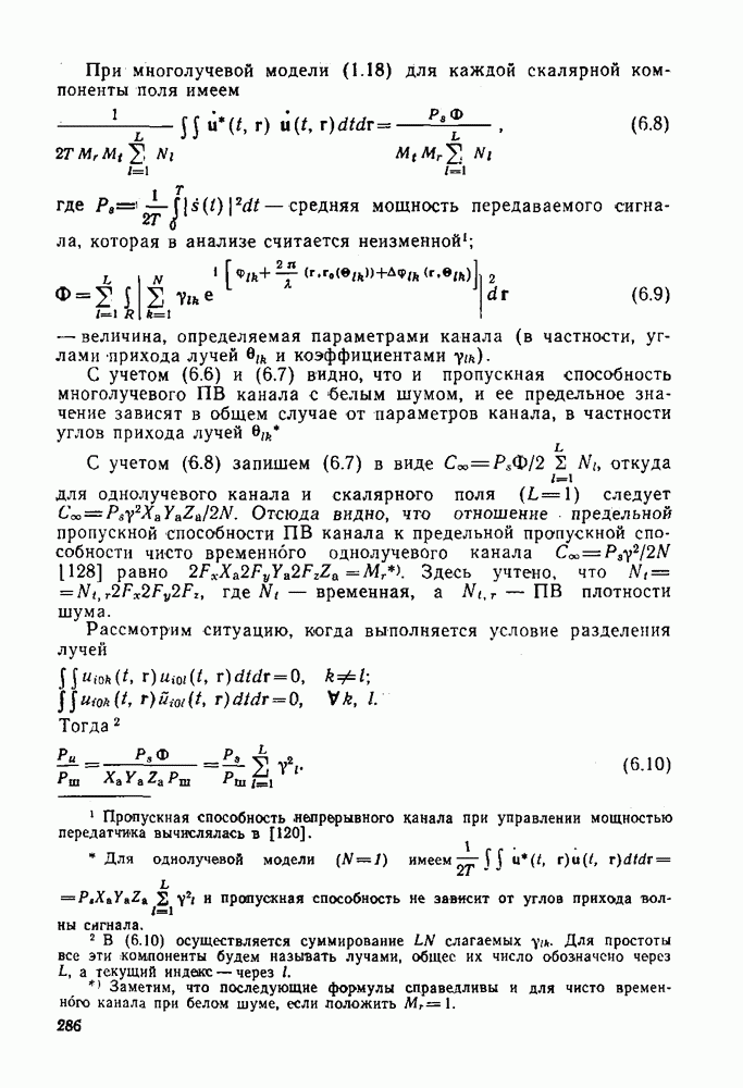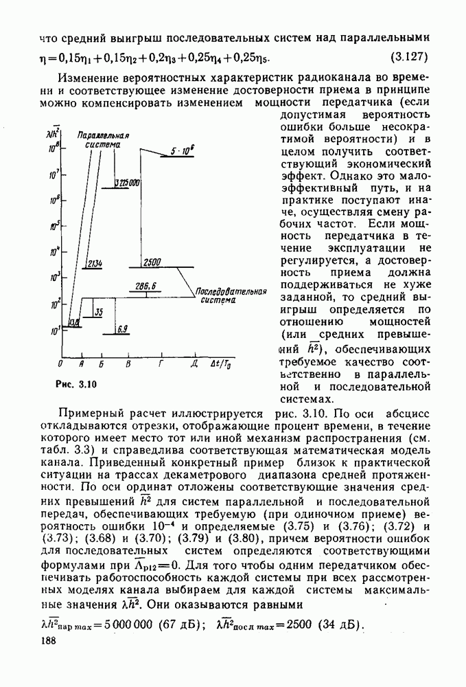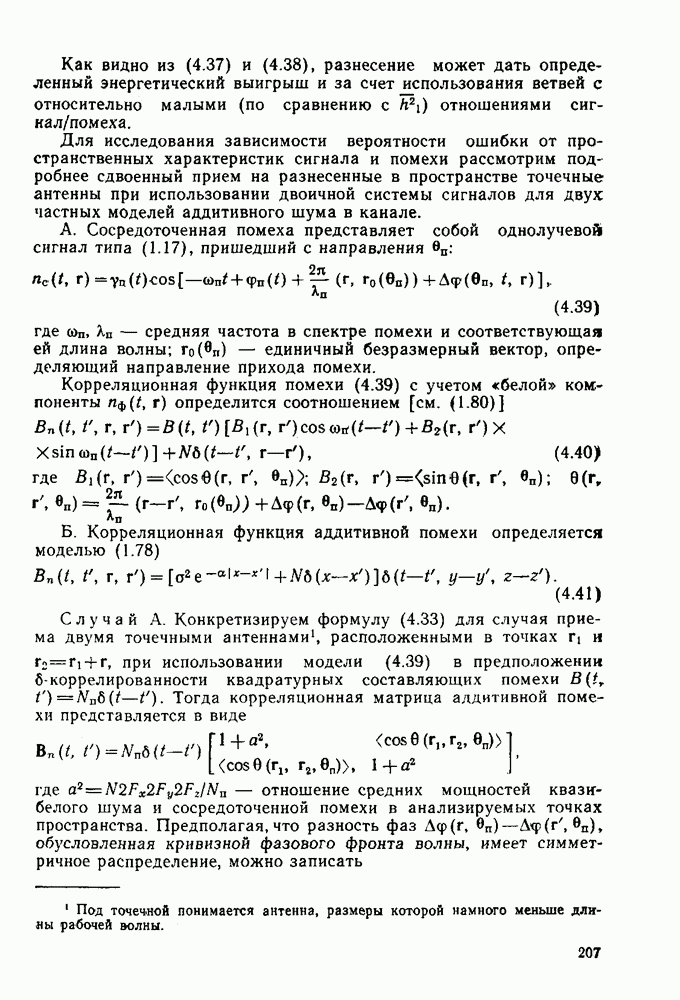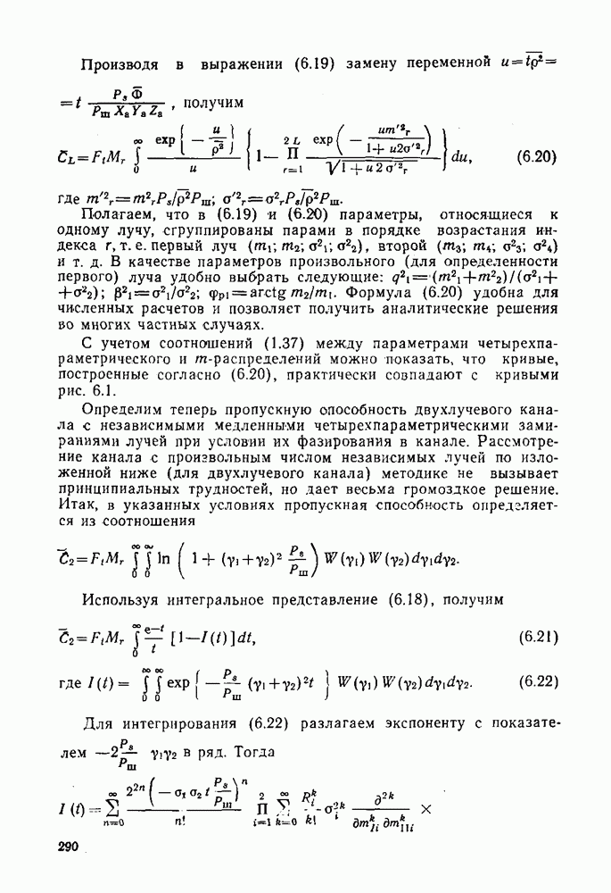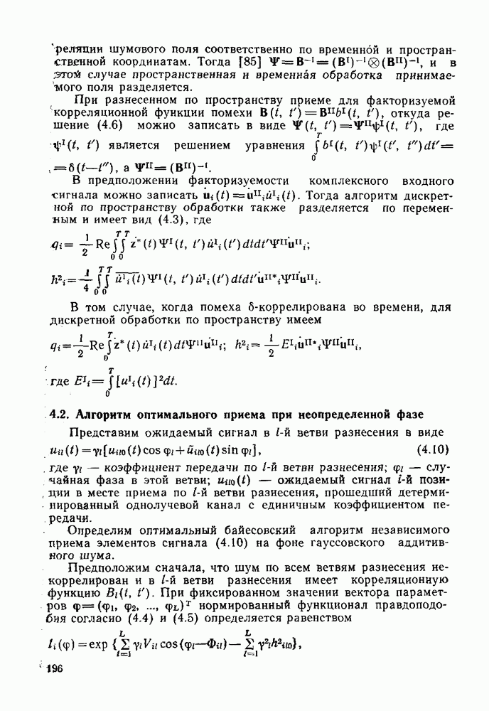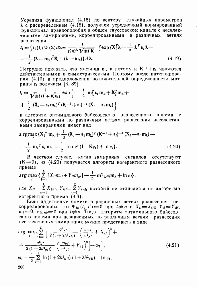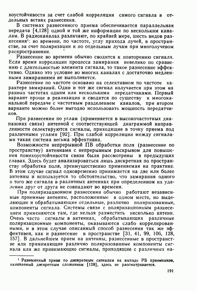 Из сравнения полученных выражений видно, что в каналах с небольшими значениями При Итак, для ортогональной в усиленном смысле системы с активной паузой прием по простому алгоритму квадратичного суммирования (2.132) дает примерно те же результаты, что и более трудная для реализации оптимальная схема. Оценим энергетический проигрыш, связанный с потерей оптимальности (условие Анализ, проведенный в работе [176] для обобщенного рэлеевского канала, показывает, что этот проигрыш монотонно растет с увеличением Таблица 2.7 (см. скан) Из таблицы видно, что если коэффициент взаимной корреляции сигналов по огибающей не превышает 0,5, то энергетический проигрыш не превышает Оценим теперь эффективность простых многопозиционных кодов и одноканальных (по частоте) систем, используемых в четырехпараметрическом канале с гладкими замираниями при независимом приеме элементов сигнала. Для прямой (без канала обратной связи [97, 128]) системы передачи информации с В односторонне-нормальном канале в области малых ошибок с учетом (2.136).