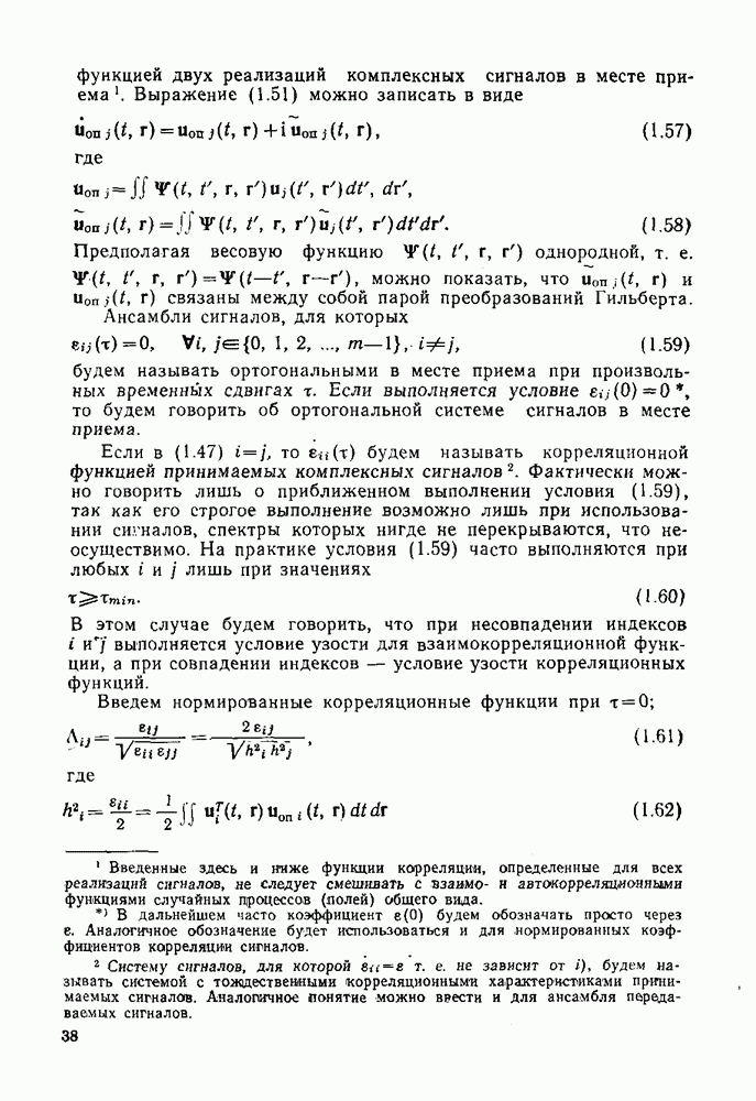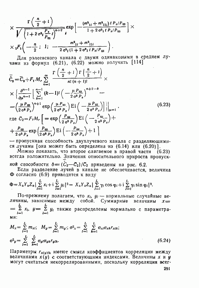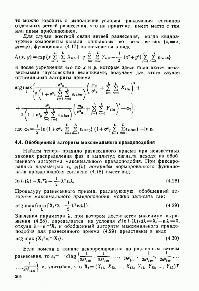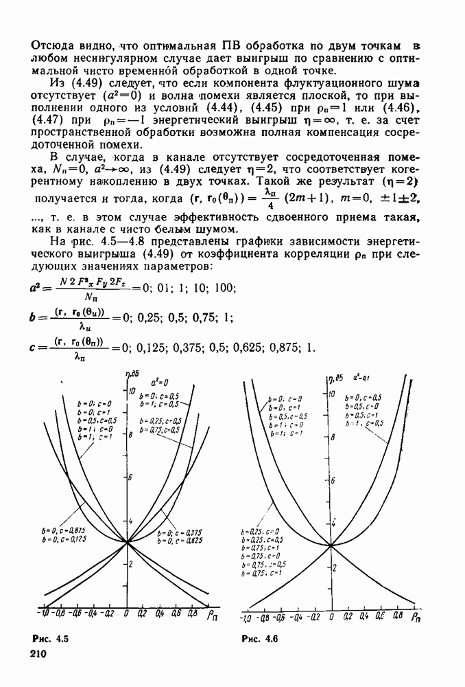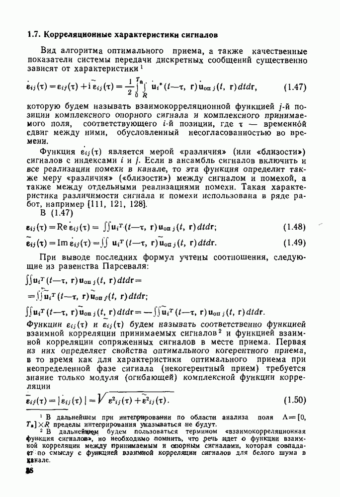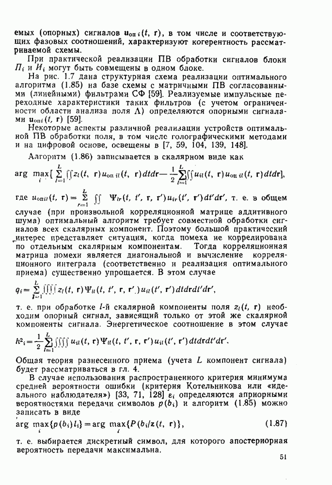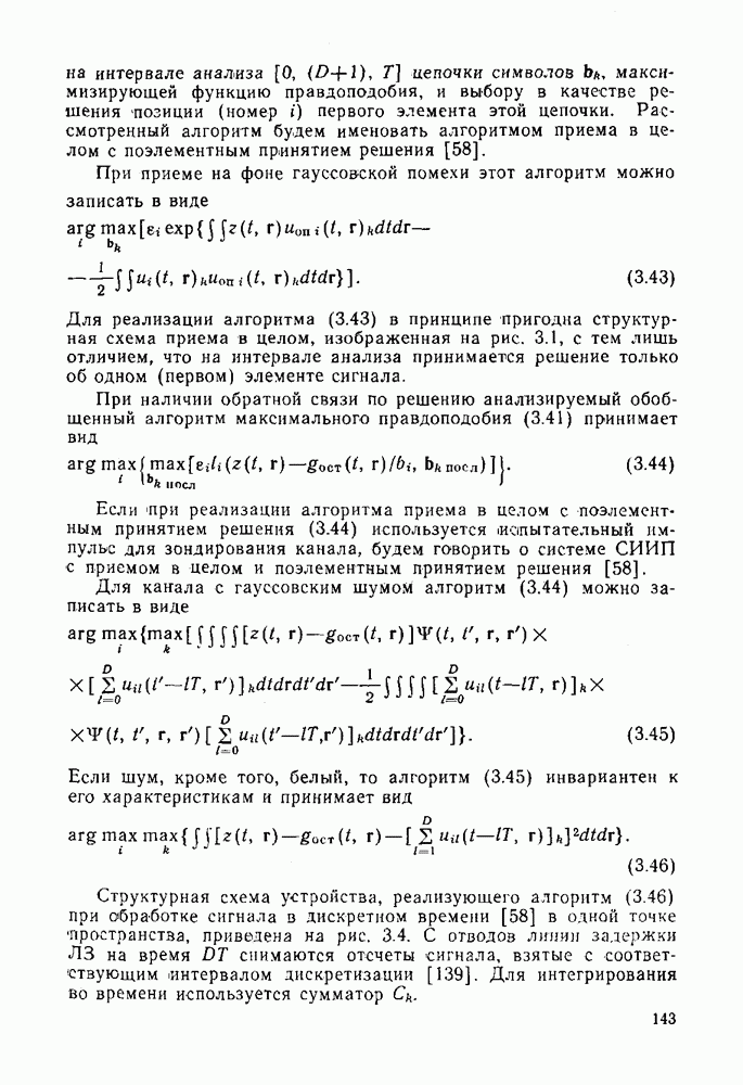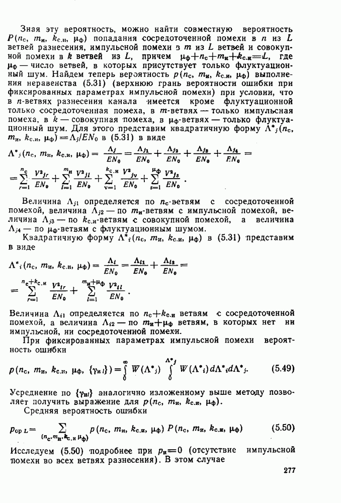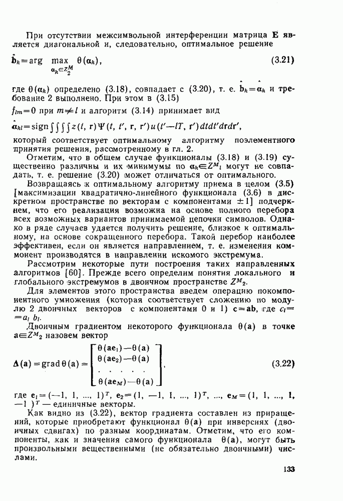 Из сравнения полученных выражений видно, что в каналах с небольшими значениями При Итак, для ортогональной в усиленном смысле системы с активной паузой прием по простому алгоритму квадратичного суммирования (2.132) дает примерно те же результаты, что и более трудная для реализации оптимальная схема. Оценим энергетический проигрыш, связанный с потерей оптимальности (условие Анализ, проведенный в работе [176] для обобщенного рэлеевского канала, показывает, что этот проигрыш монотонно растет с увеличением Таблица 2.7 (см. скан) Из таблицы видно, что если коэффициент взаимной корреляции сигналов по огибающей не превышает 0,5, то энергетический проигрыш не превышает Оценим теперь эффективность простых многопозиционных кодов и одноканальных (по частоте) систем, используемых в четырехпараметрическом канале с гладкими замираниями при независимом приеме элементов сигнала. Для прямой (без канала обратной связи [97, 128]) системы передачи информации с В односторонне-нормальном канале в области малых ошибок с учетом (2.136).