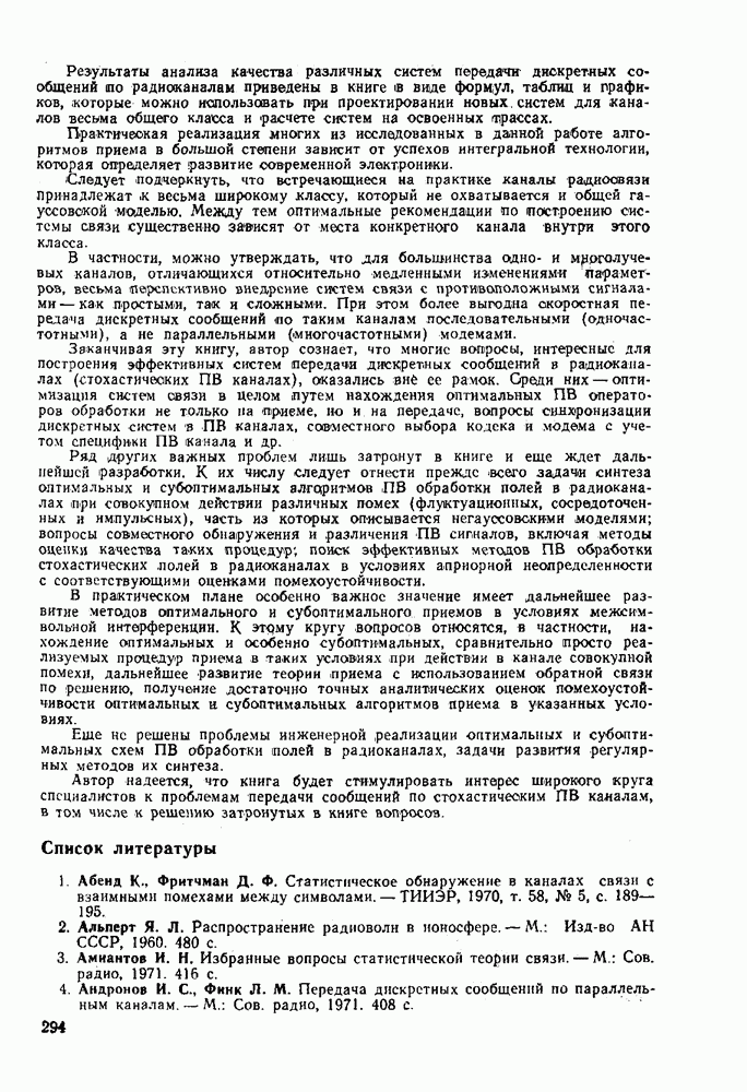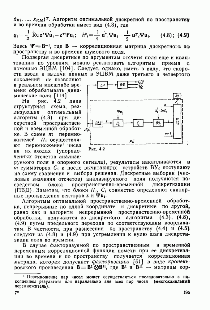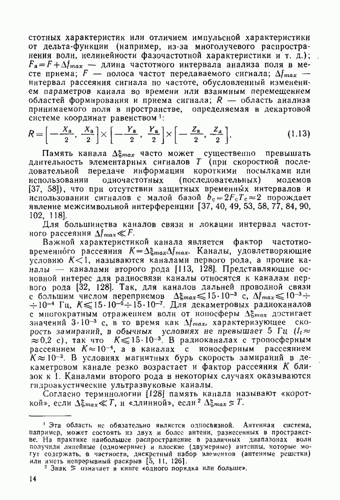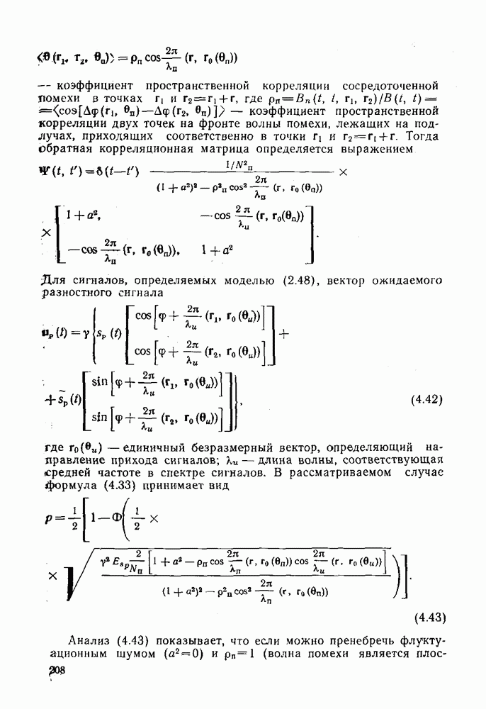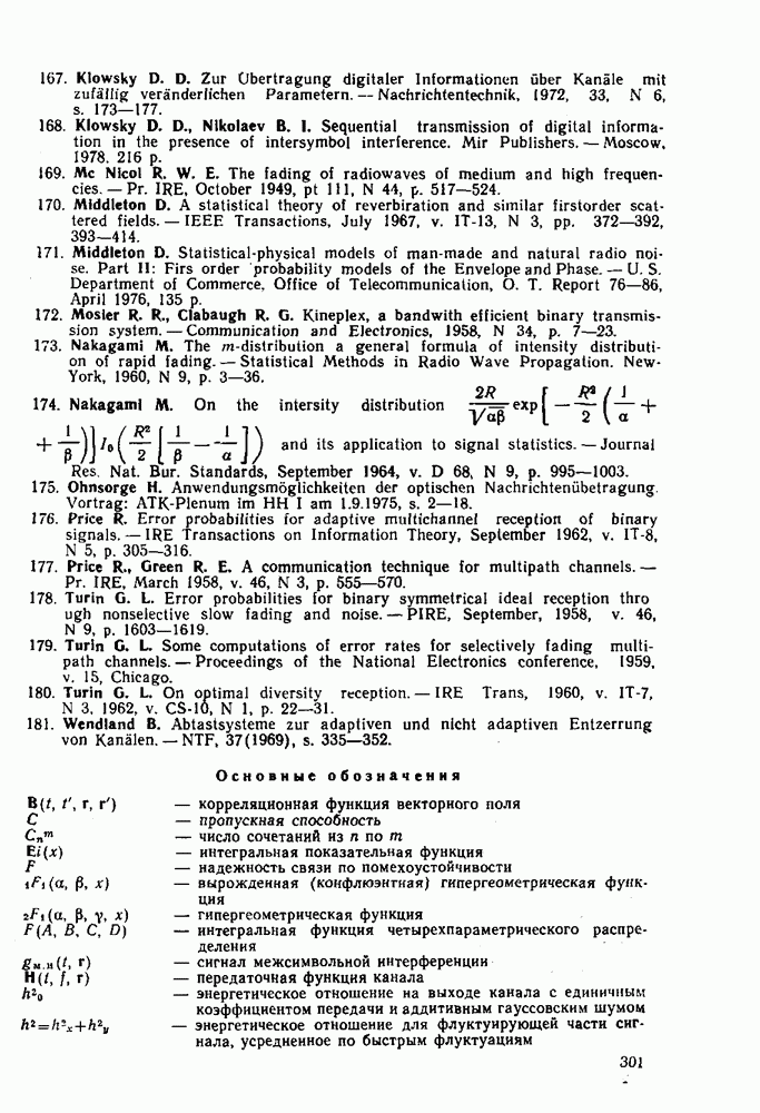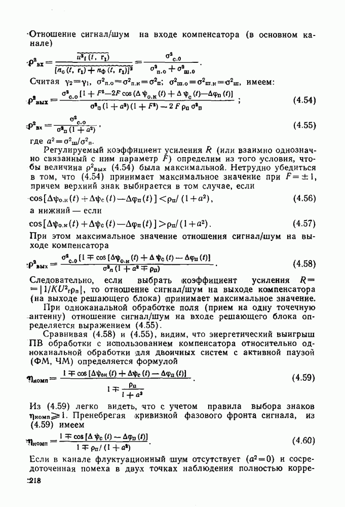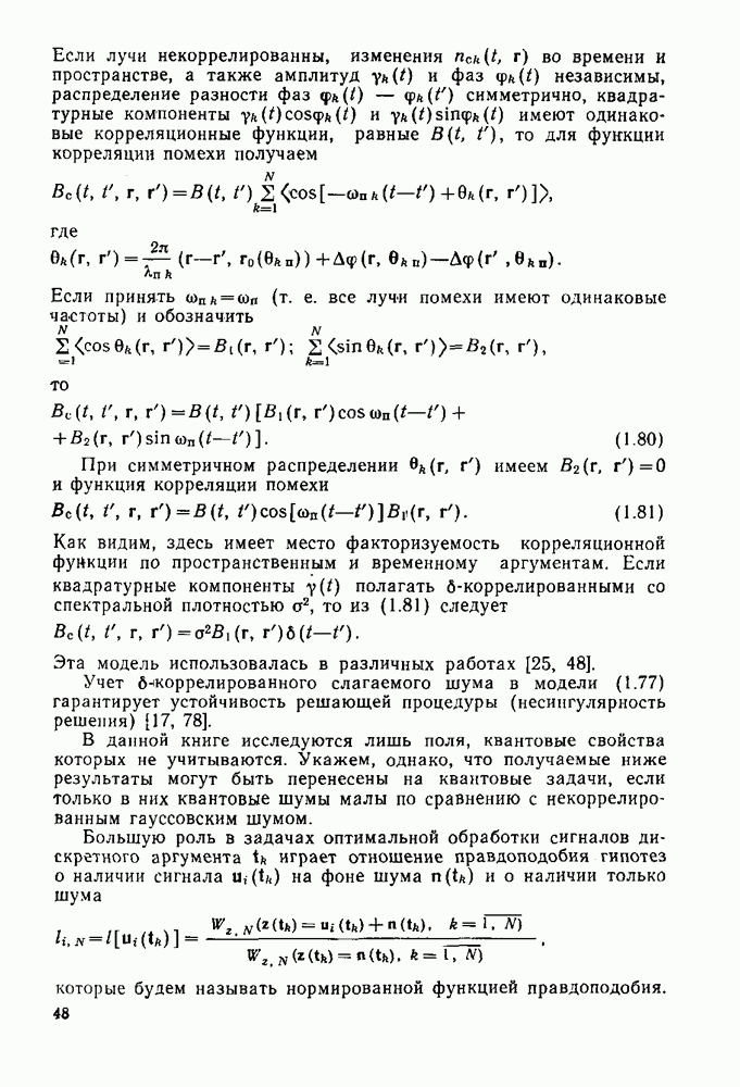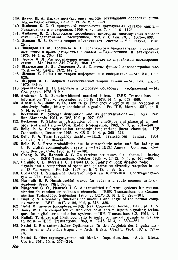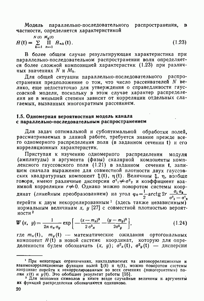 Из сравнения полученных выражений видно, что в каналах с небольшими значениями При Итак, для ортогональной в усиленном смысле системы с активной паузой прием по простому алгоритму квадратичного суммирования (2.132) дает примерно те же результаты, что и более трудная для реализации оптимальная схема. Оценим энергетический проигрыш, связанный с потерей оптимальности (условие Анализ, проведенный в работе [176] для обобщенного рэлеевского канала, показывает, что этот проигрыш монотонно растет с увеличением Таблица 2.7 (см. скан) Из таблицы видно, что если коэффициент взаимной корреляции сигналов по огибающей не превышает 0,5, то энергетический проигрыш не превышает Оценим теперь эффективность простых многопозиционных кодов и одноканальных (по частоте) систем, используемых в четырехпараметрическом канале с гладкими замираниями при независимом приеме элементов сигнала. Для прямой (без канала обратной связи [97, 128]) системы передачи информации с В односторонне-нормальном канале в области малых ошибок с учетом (2.136).