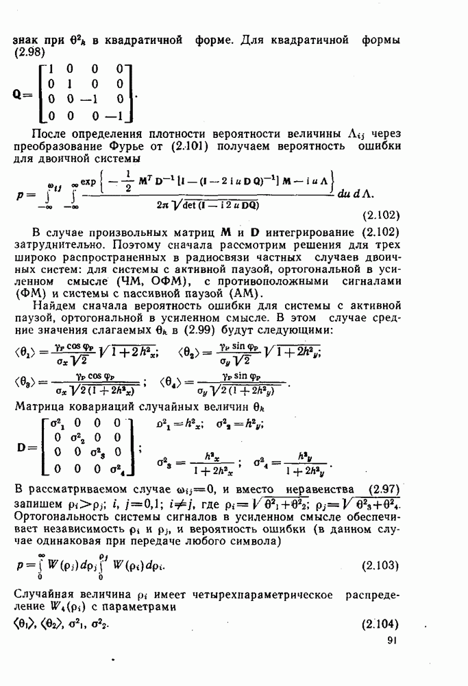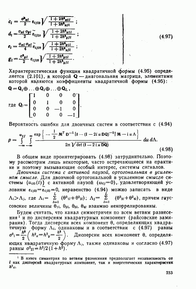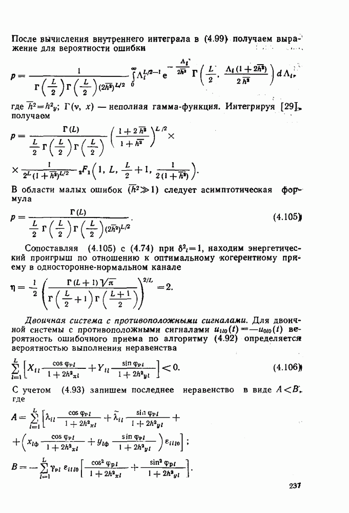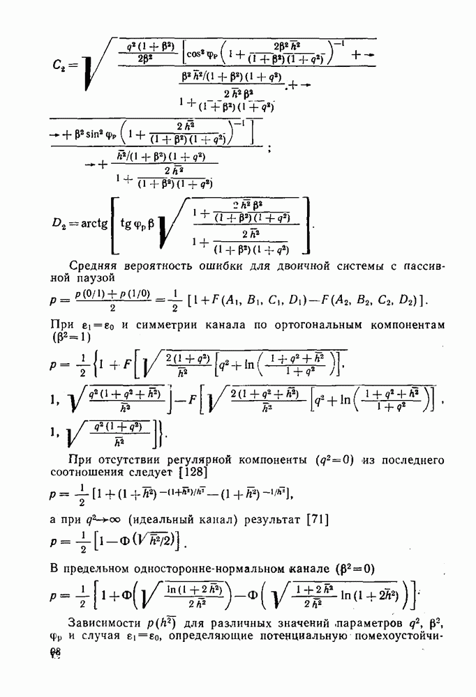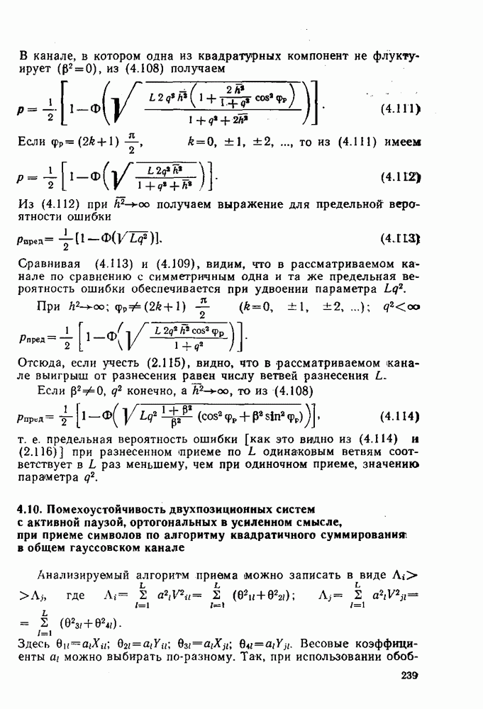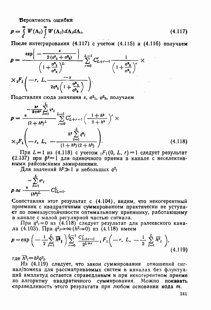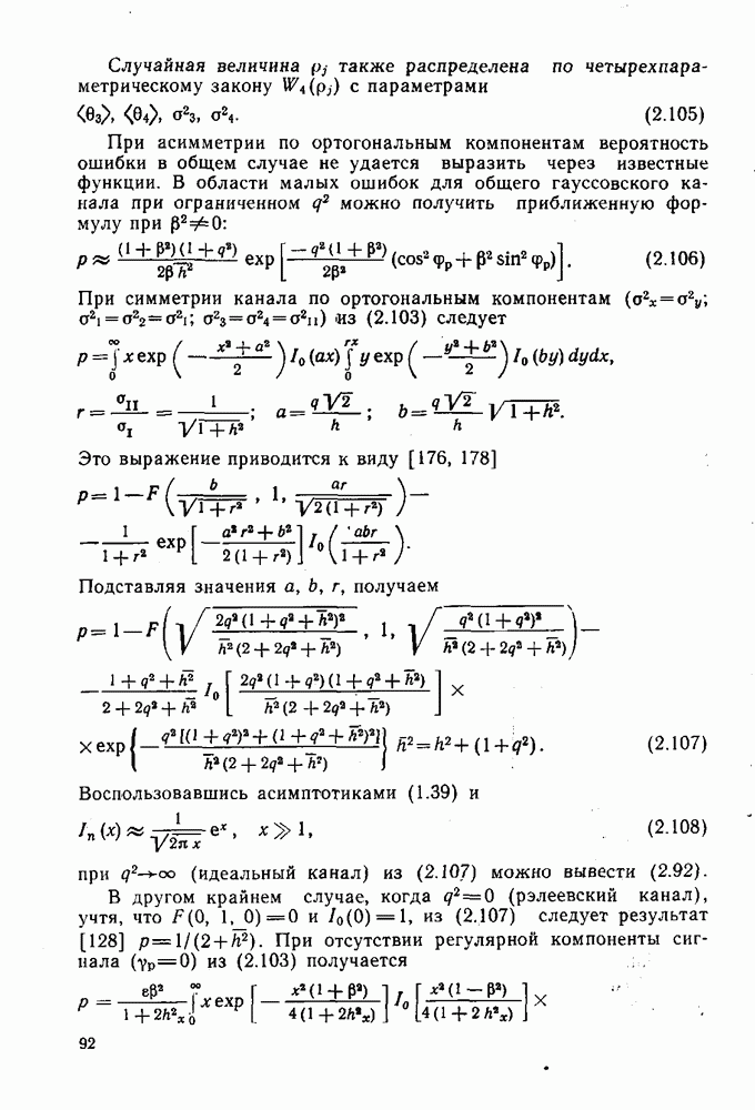 Если амплитуда сигнала не флуктуирует, то из соотношения (2.135) следует результат (2.93). Для двухпозиционной системы, ортогональной в усиленном смысле, при щриеме по алгоритму квадратичного суммирования а четырехпараметрическом канале вероятность ошибки
