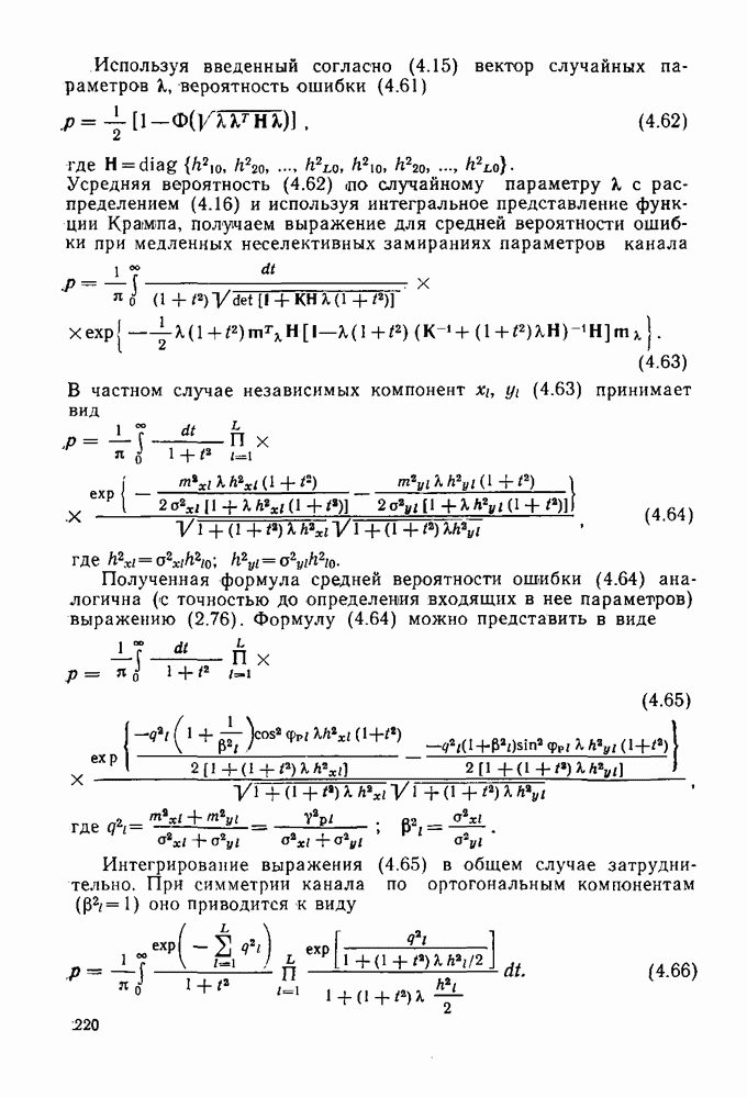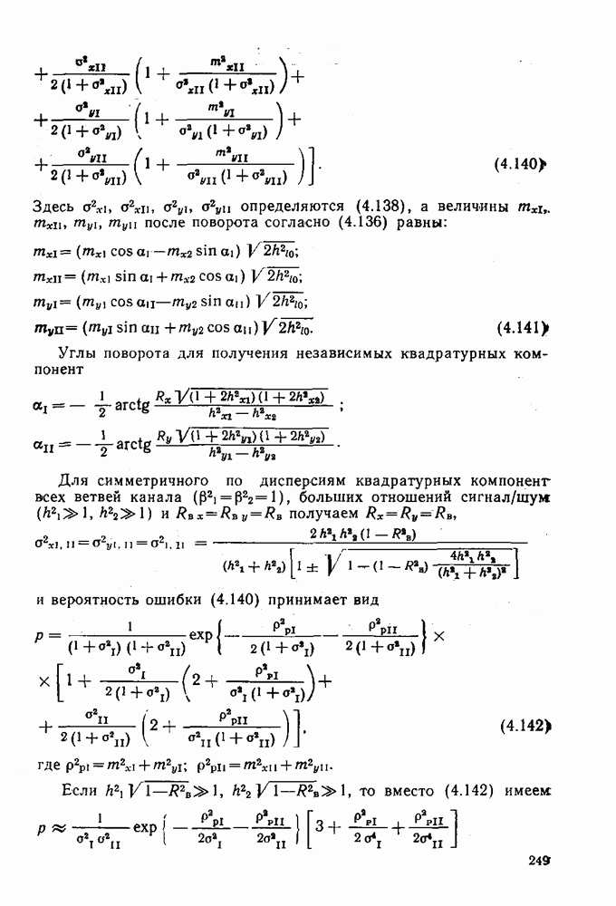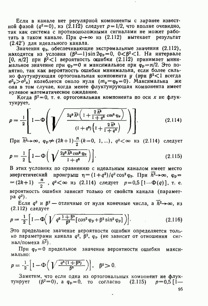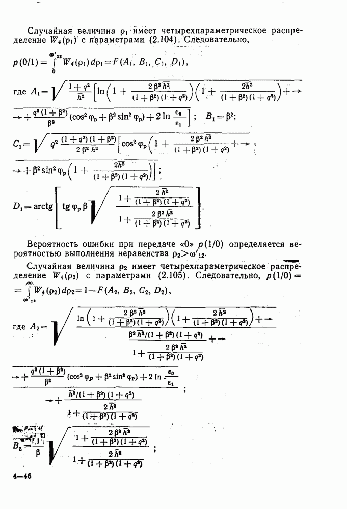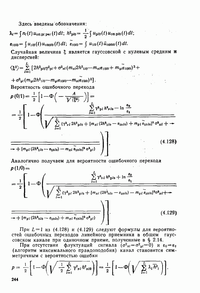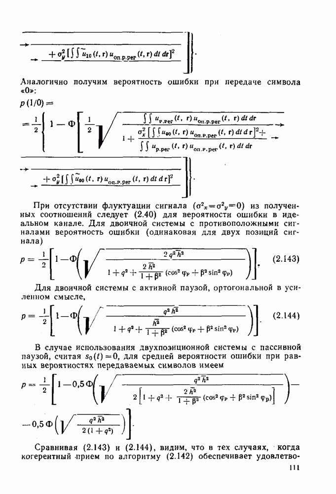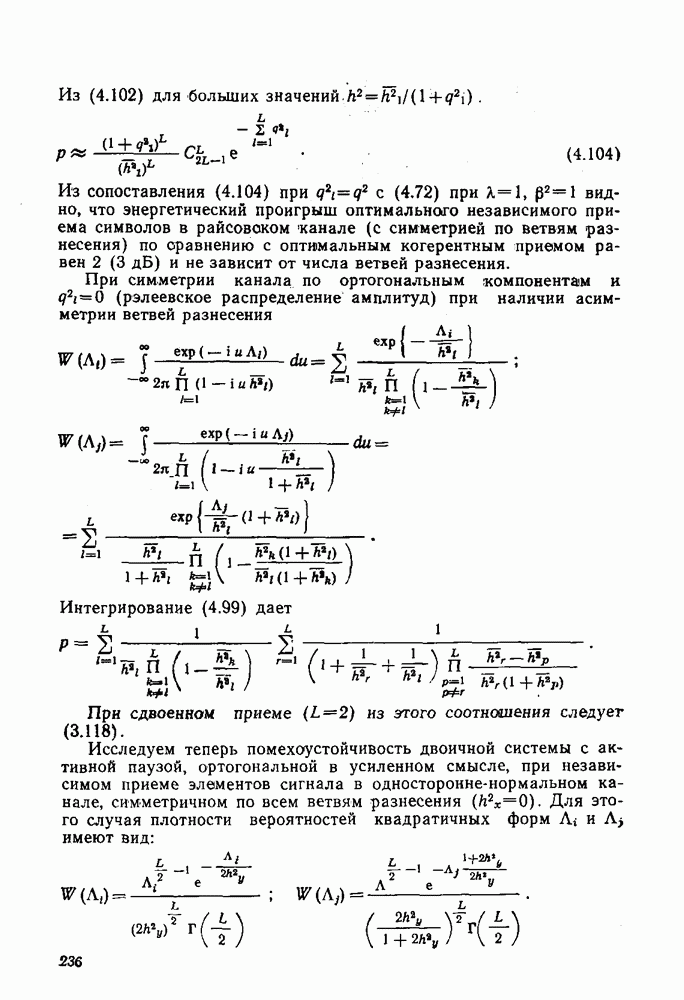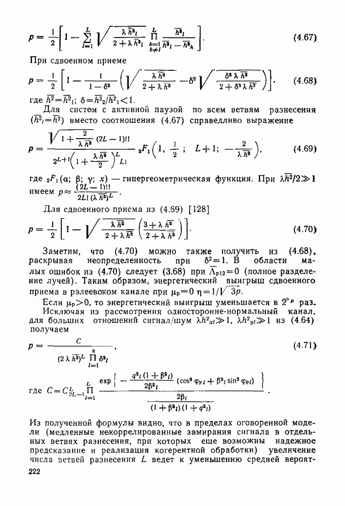Если амплитуда сигнала не флуктуирует, то из соотношения (2.135) следует результат (2.93). Для двухпозиционной системы, ортогональной в усиленном смысле, при щриеме по алгоритму квадратичного суммирования а четырехпараметрическом канале вероятность ошибки