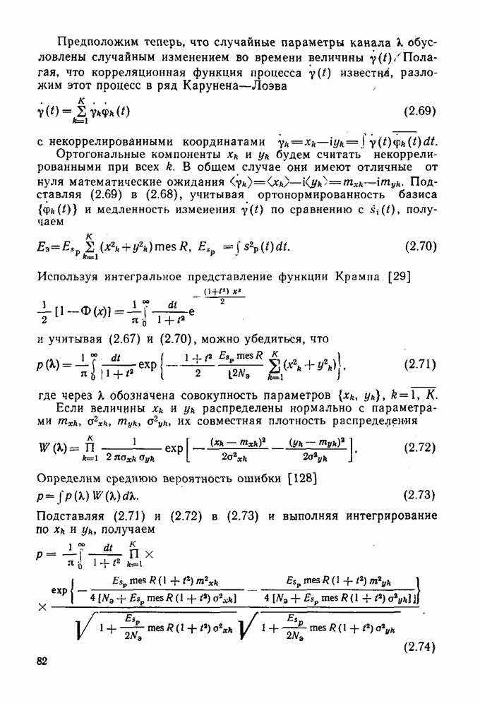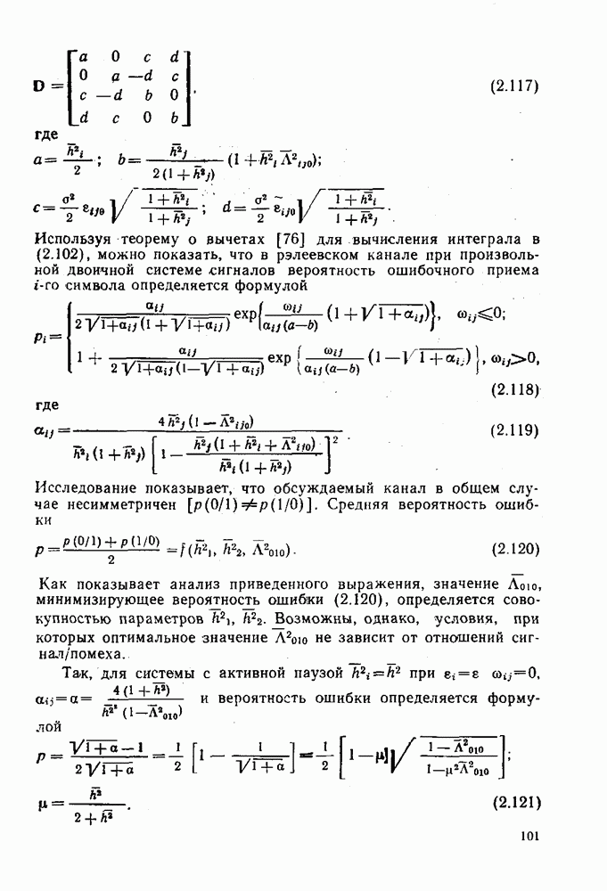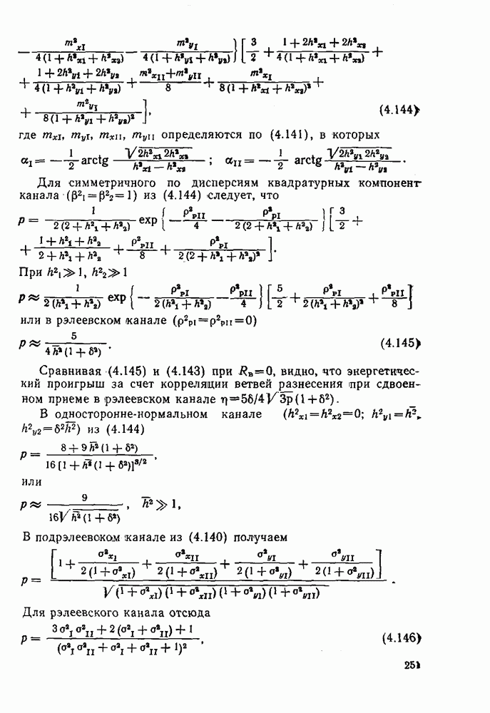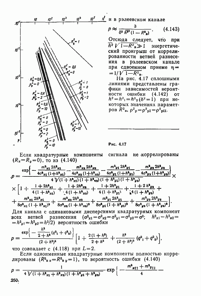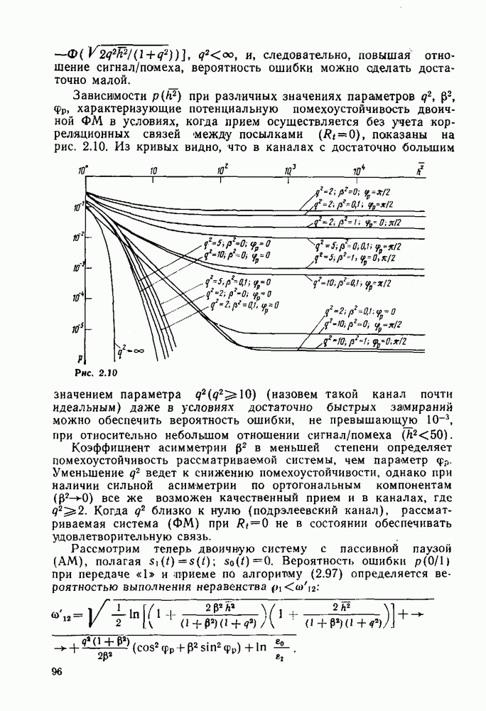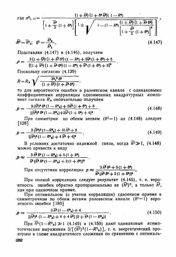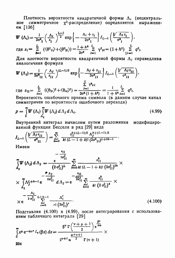 Если амплитуда сигнала не флуктуирует, то из соотношения (2.135) следует результат (2.93). Для двухпозиционной системы, ортогональной в усиленном смысле, при щриеме по алгоритму квадратичного суммирования а четырехпараметрическом канале вероятность ошибки