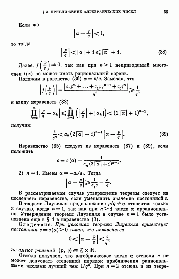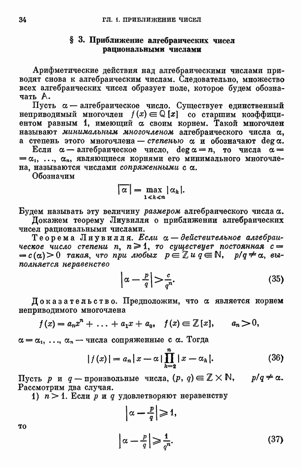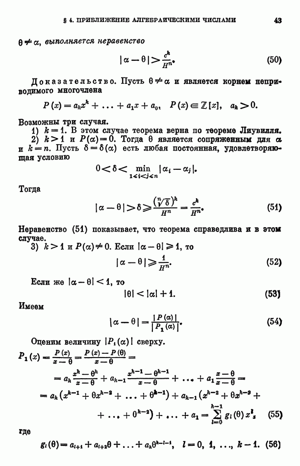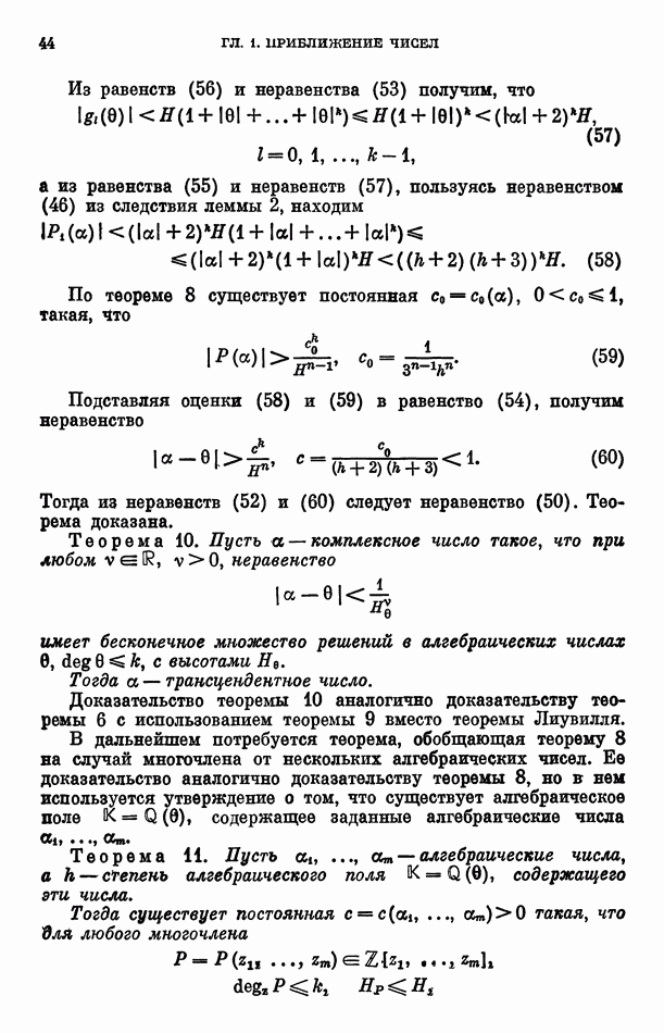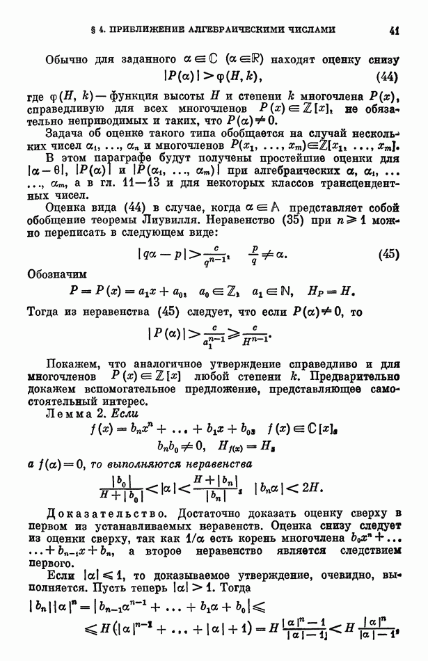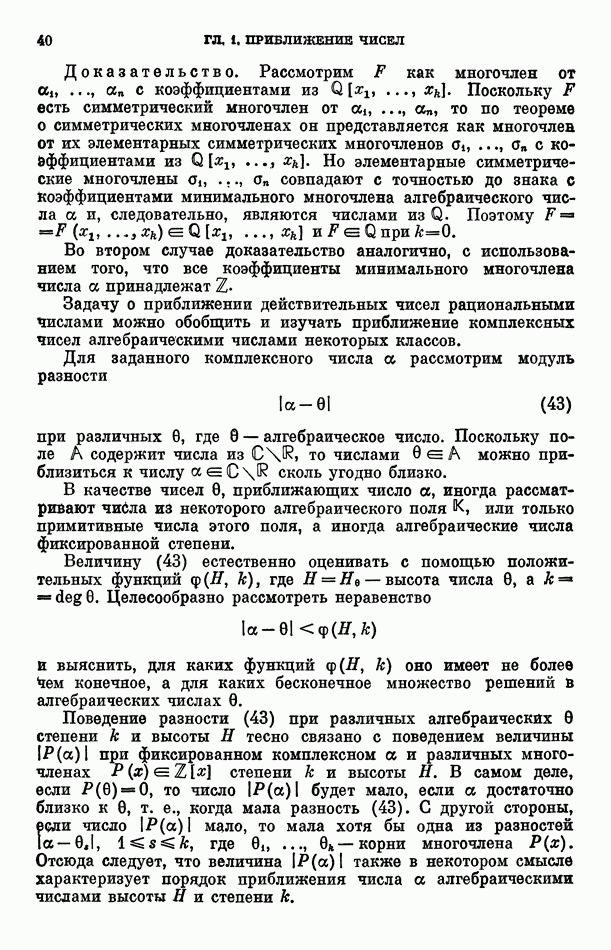 Доказательство. Рассмотрим Во втором случае доказательство аналогично, с использованием того, что все коэффициенты минимального многочлена числа а принадлежат Задачу о приближении действительных чисел рациональными числами можно обобщить и изучать приближение комплексных чисел алгебраическими числами некоторых классов. Для заданного комплексного числа а рассмотрим модуль разности