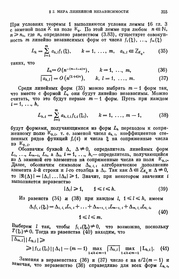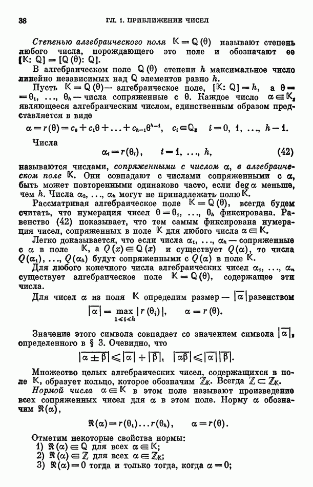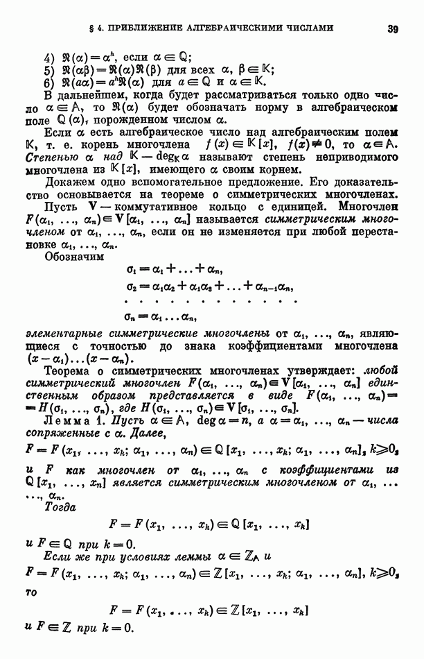§ 4. Приближение алгебраических чисел алгебраическими числамиВысотой Пусть Высотой Алгебраическое число а называют целым алгебраическим числом, если в его минимальном многочлене Доказывается, что если а — корень многочлена Сумма, разность и произведение двух целых алгебраических чисел снова являются целыми алгебраическими числами. Следовательно, множество всех целых алгебраических чисел образует кольцо, которое будем обозначать Если Алгебраическим полем называют расширение поля Так определенное алгебраическое поле обозначают Степенью алгебраического поля В алгебраическом поле Пусть
