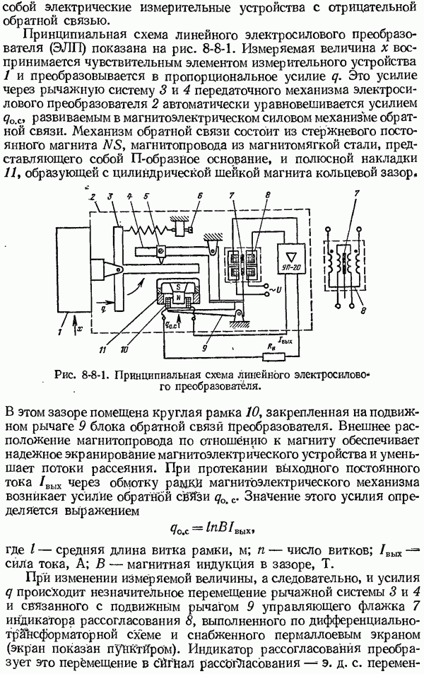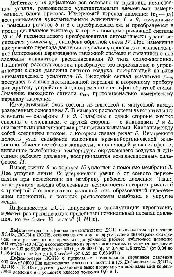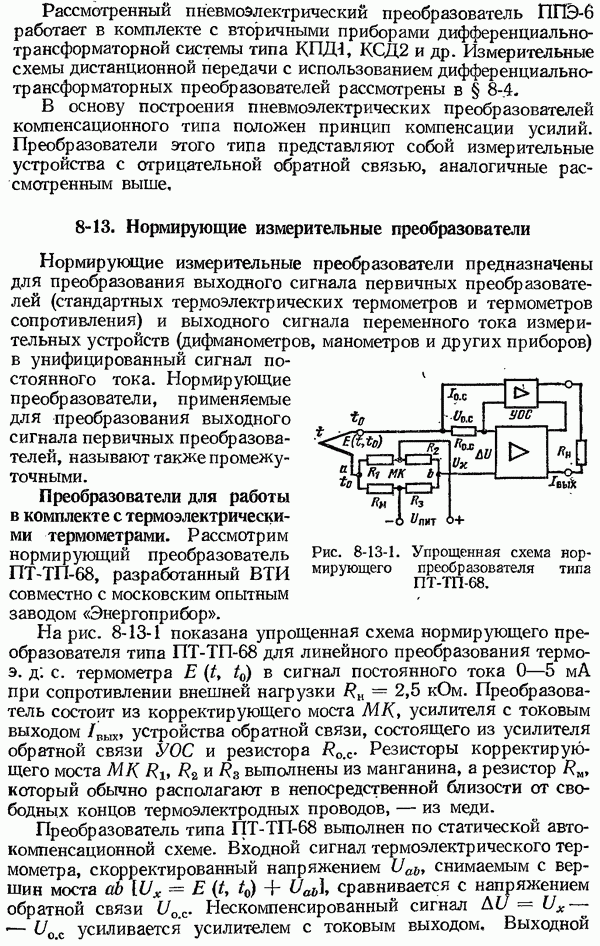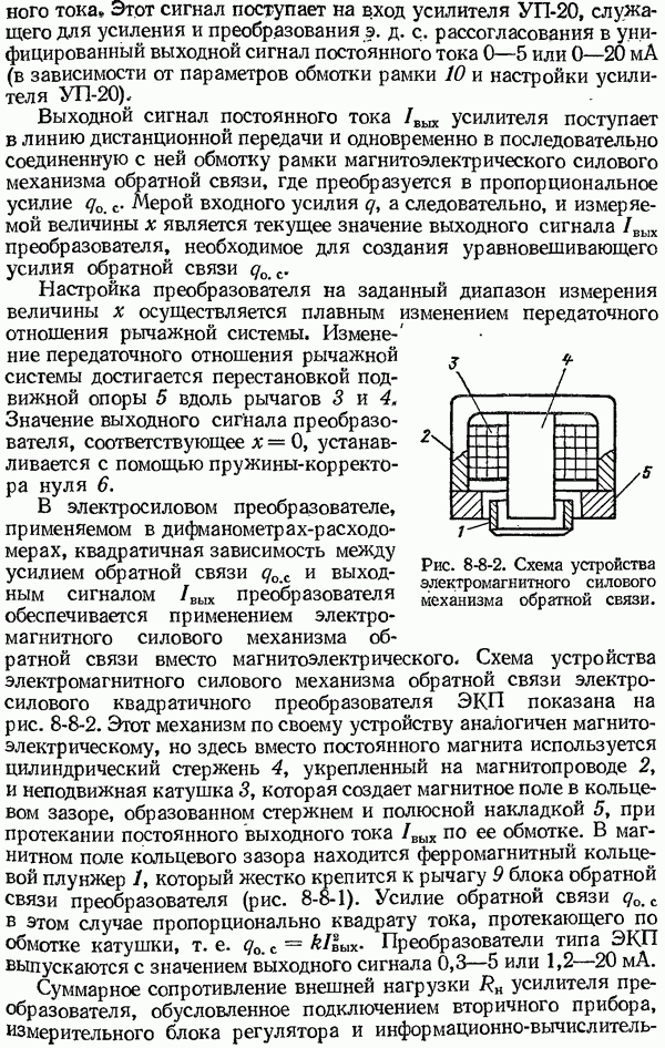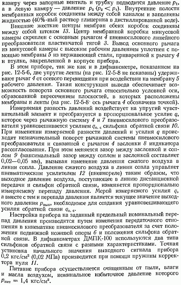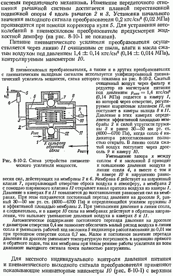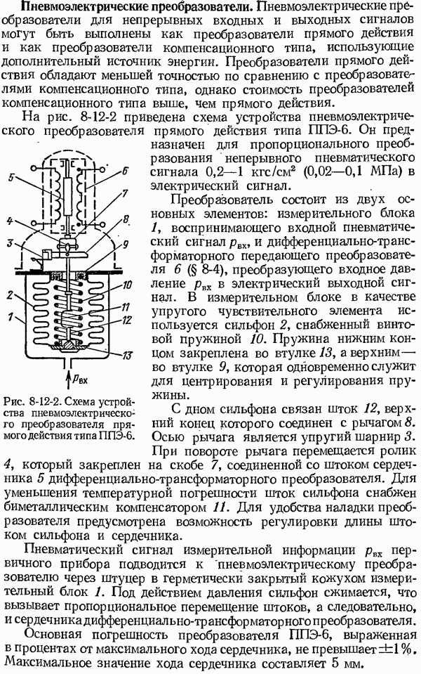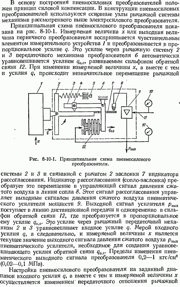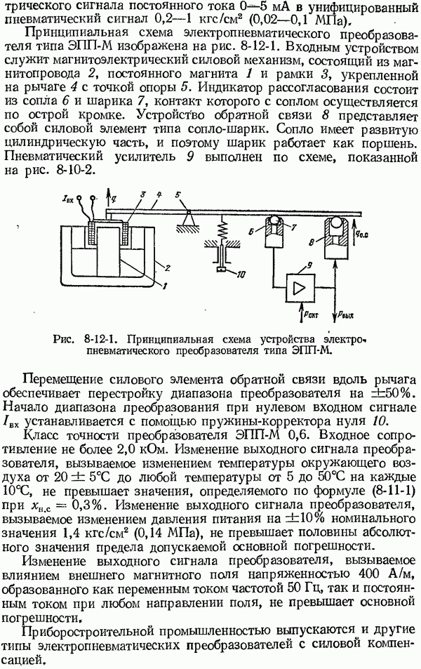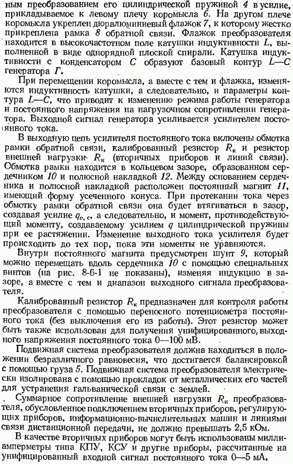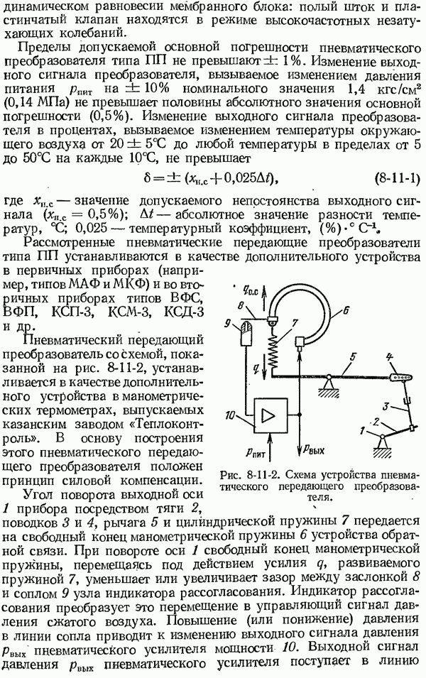 Рис. 8-11-2. Схема устройства пневматического передающего преобразователя. Пневматический передающий преобразователь со схемой, показанной на рис. 8-11-2, устанавливается в качестве дополнительного устройства в манометрических термометрах, выпускаемых казанским заводом «Теплоконт-роль». В основу построения этого пневматического передающего преобразователя положен принцип силовой компенсации. Угол поворота выходной оси 1 прибора посредством тяги 2, поводков 3 и 4, рычага 5 и цилиндрической пружины 7 передается на свободный конец манометрической пружины 6 устройства обратной связи. При повороте оси 1 свободный конец манометрической пружины, перемещаясь под действием усилия дистанционнои передачи и одновременно в манометрическую пружину устройства обратной связи, где преобразуется в пропорциональное усилие обратной связи Мерой усилия Заслонка индикатора рассогласования имеет максимальный рабочий ход примерно Пневматический преобразователь снабжен корректором нуля, с помощью которого устанавливается начальное значение выходного сигнала Пределы допускаемых основной и дополнительных погрешностей пневматических передающих преобразователей нормируются в зависимости от типа и класса точности манометрического термометра. В основу построения пневматических передающих преобразователей для преобразования угла поворота оси манометров, дифманометров типа