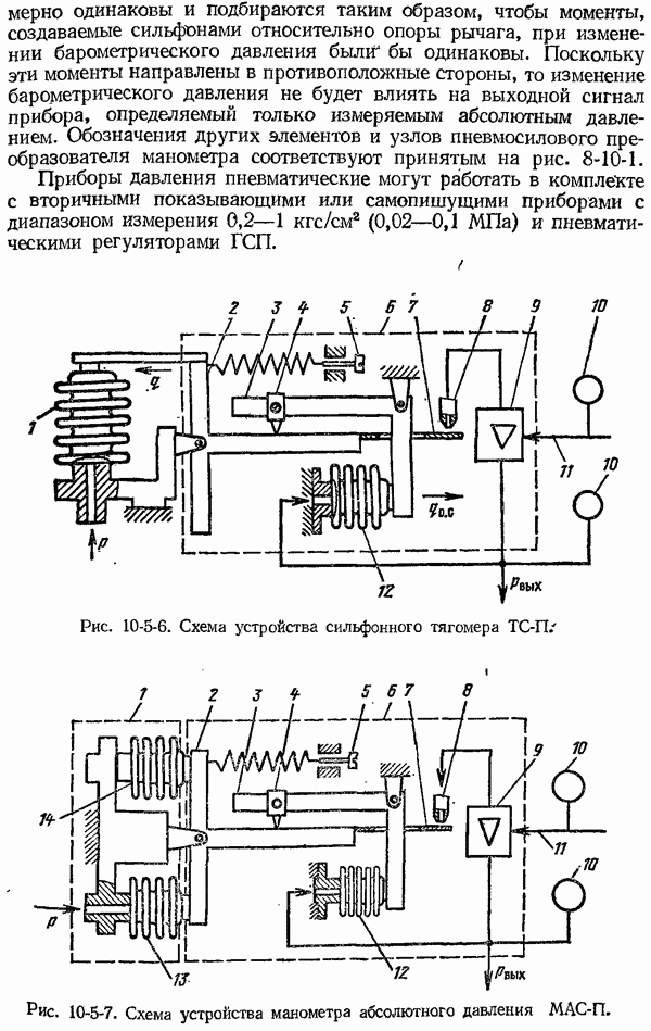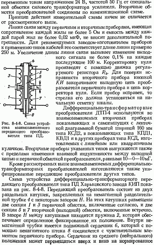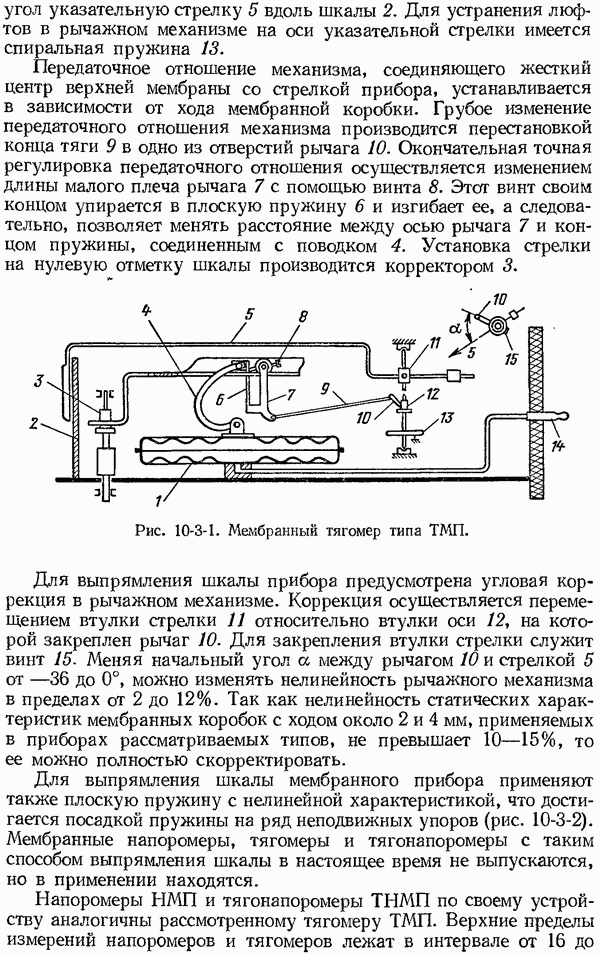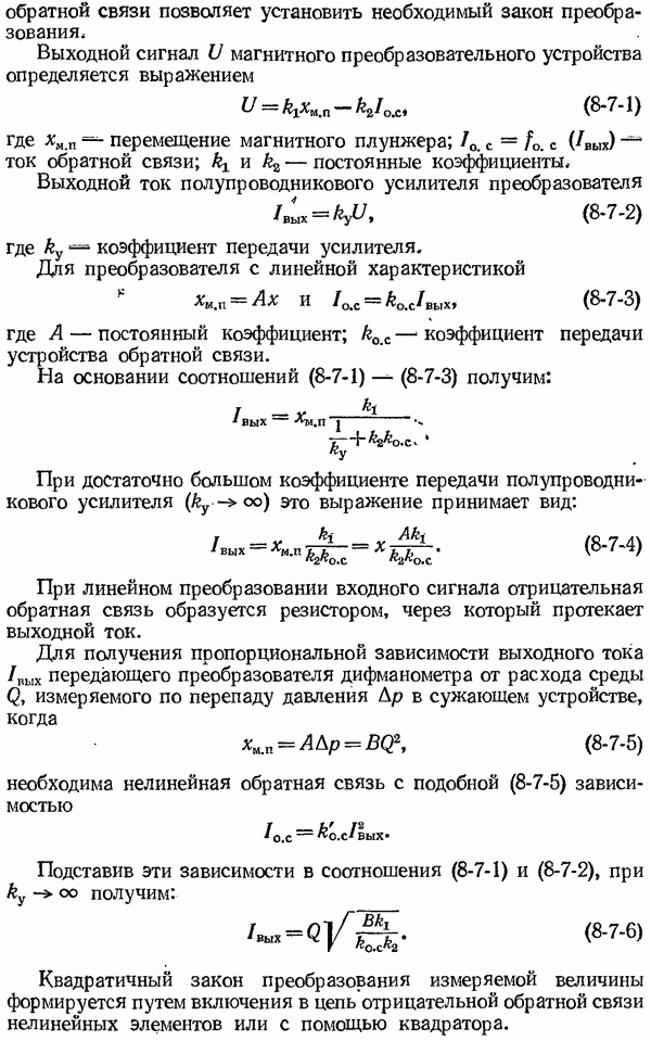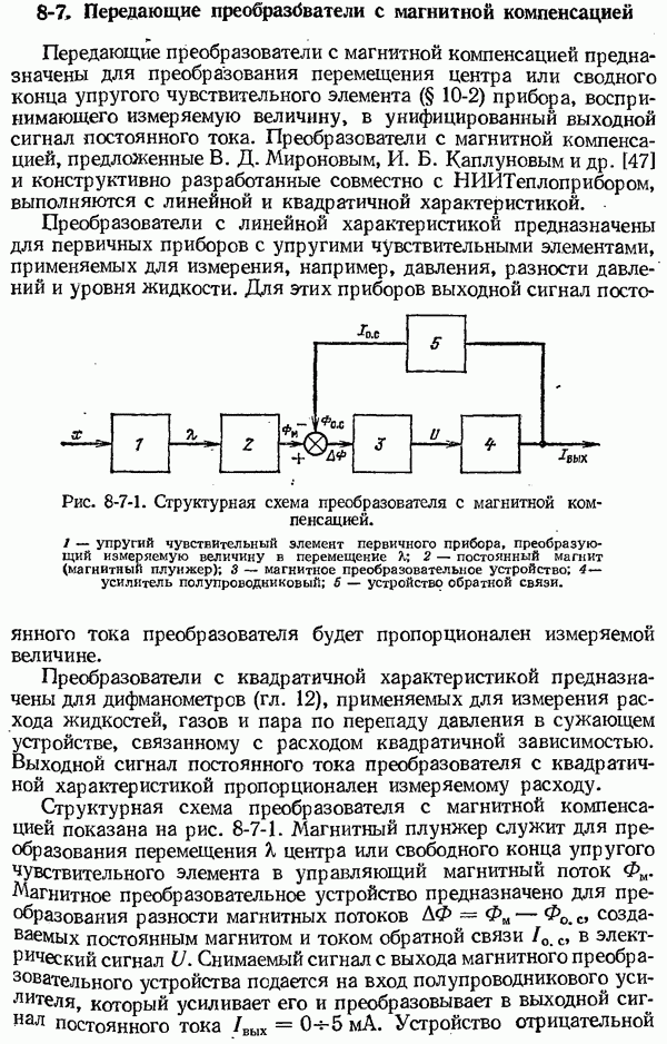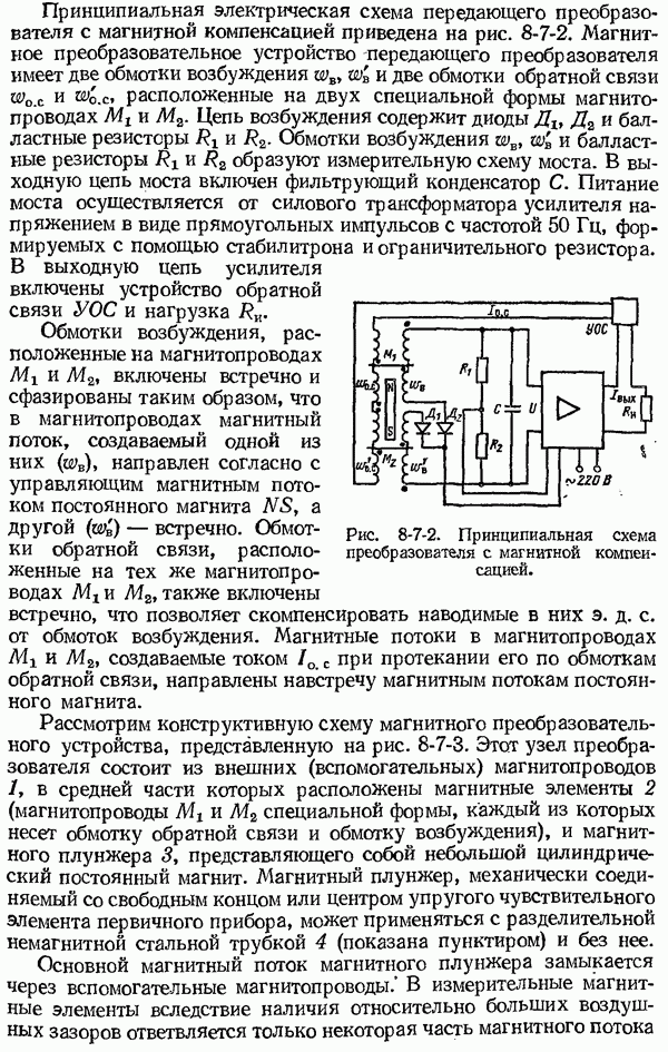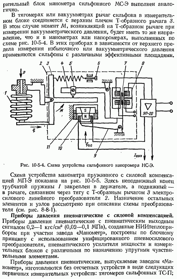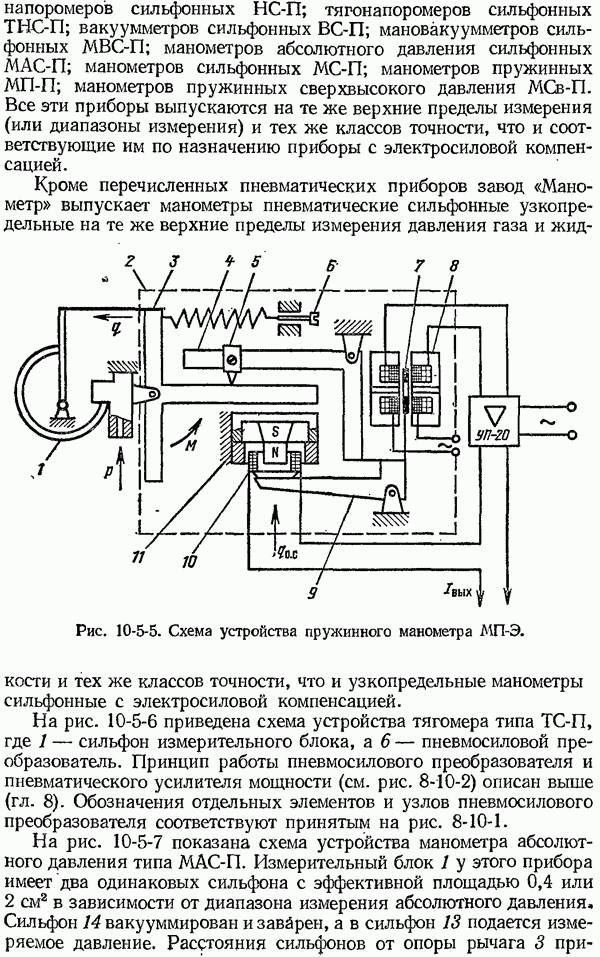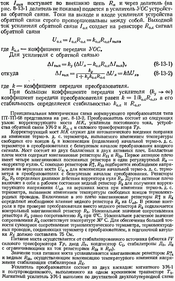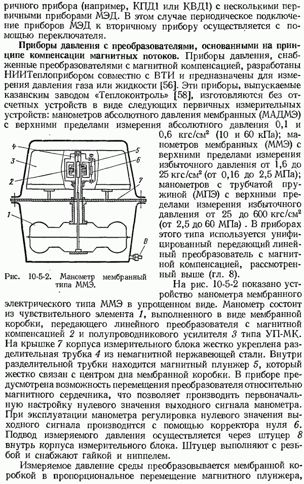 Рис. 8-11-2. Схема устройства пневматического передающего преобразователя. Пневматический передающий преобразователь со схемой, показанной на рис. 8-11-2, устанавливается в качестве дополнительного устройства в манометрических термометрах, выпускаемых казанским заводом «Теплоконт-роль». В основу построения этого пневматического передающего преобразователя положен принцип силовой компенсации. Угол поворота выходной оси 1 прибора посредством тяги 2, поводков 3 и 4, рычага 5 и цилиндрической пружины 7 передается на свободный конец манометрической пружины 6 устройства обратной связи. При повороте оси 1 свободный конец манометрической пружины, перемещаясь под действием усилия дистанционнои передачи и одновременно в манометрическую пружину устройства обратной связи, где преобразуется в пропорциональное усилие обратной связи Мерой усилия Заслонка индикатора рассогласования имеет максимальный рабочий ход примерно Пневматический преобразователь снабжен корректором нуля, с помощью которого устанавливается начальное значение выходного сигнала Пределы допускаемых основной и дополнительных погрешностей пневматических передающих преобразователей нормируются в зависимости от типа и класса точности манометрического термометра. В основу построения пневматических передающих преобразователей для преобразования угла поворота оси манометров, дифманометров типа