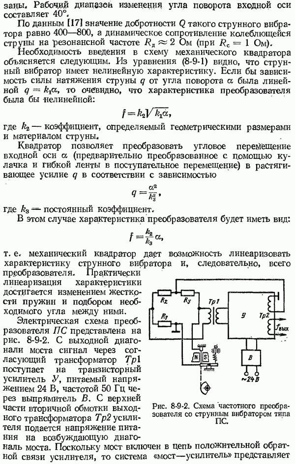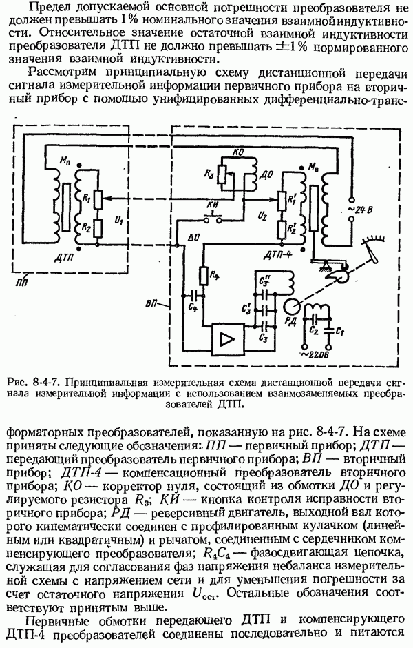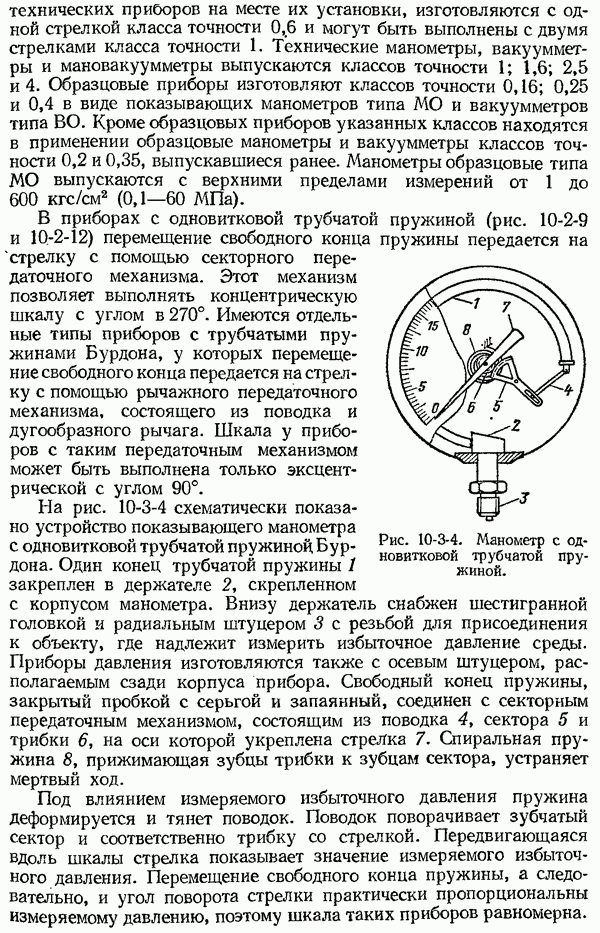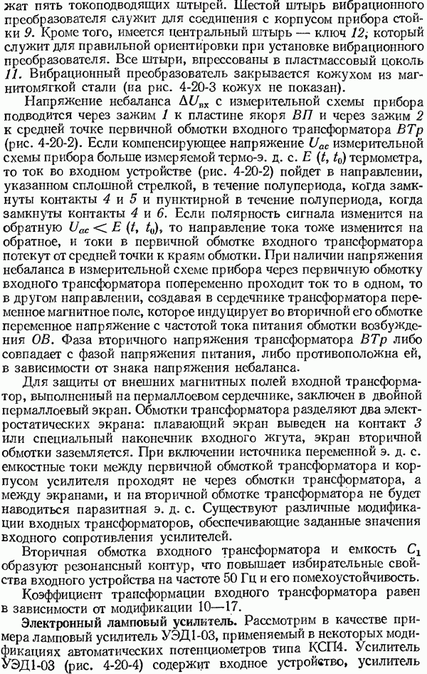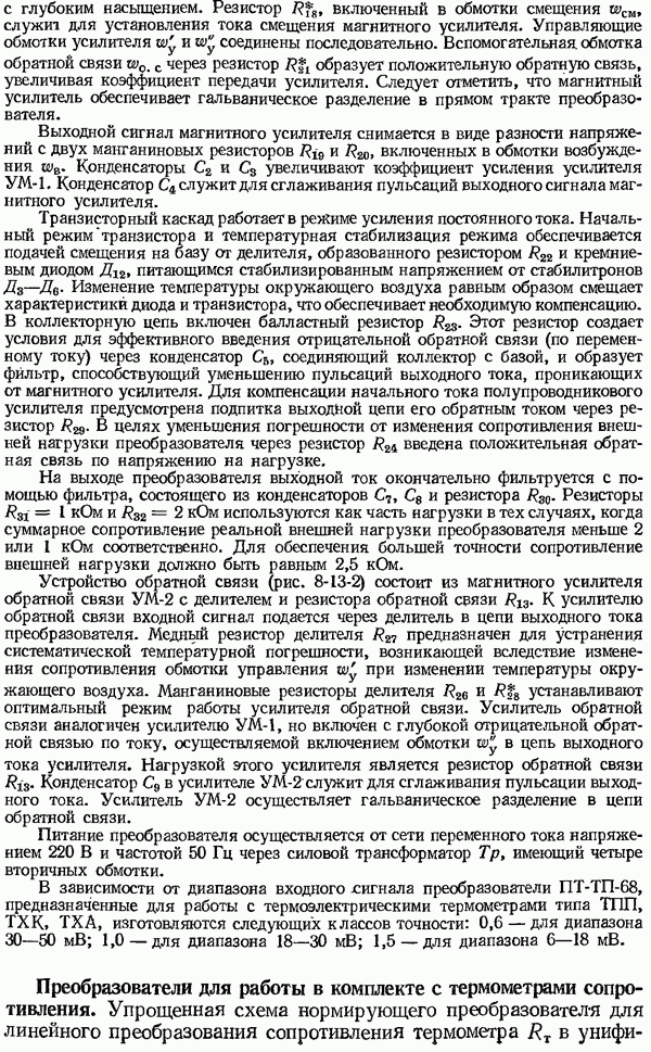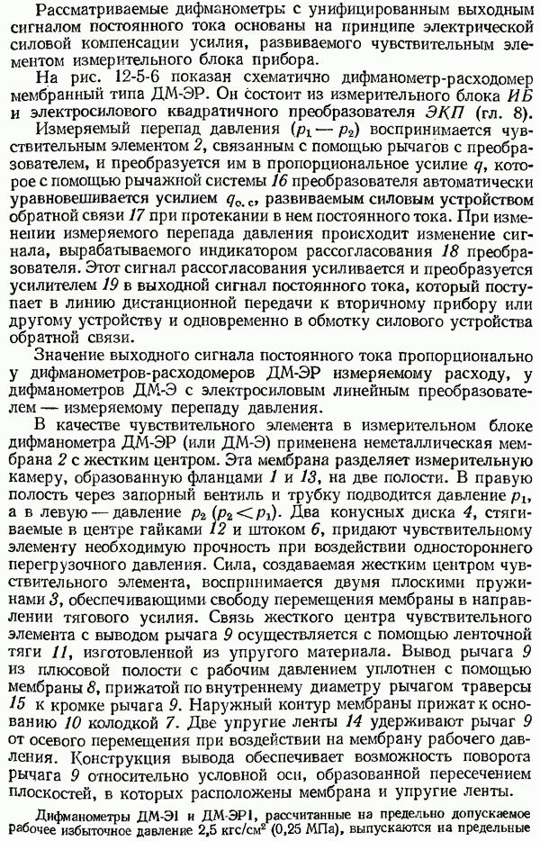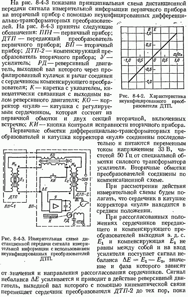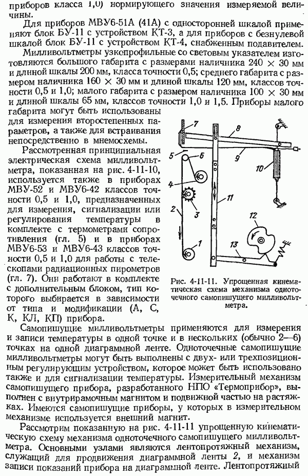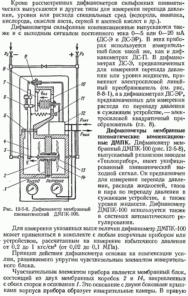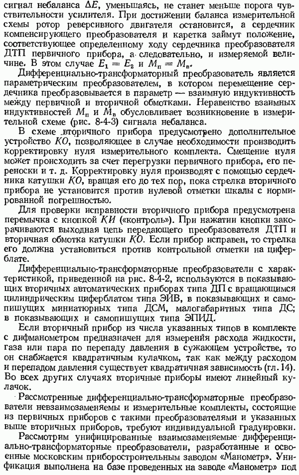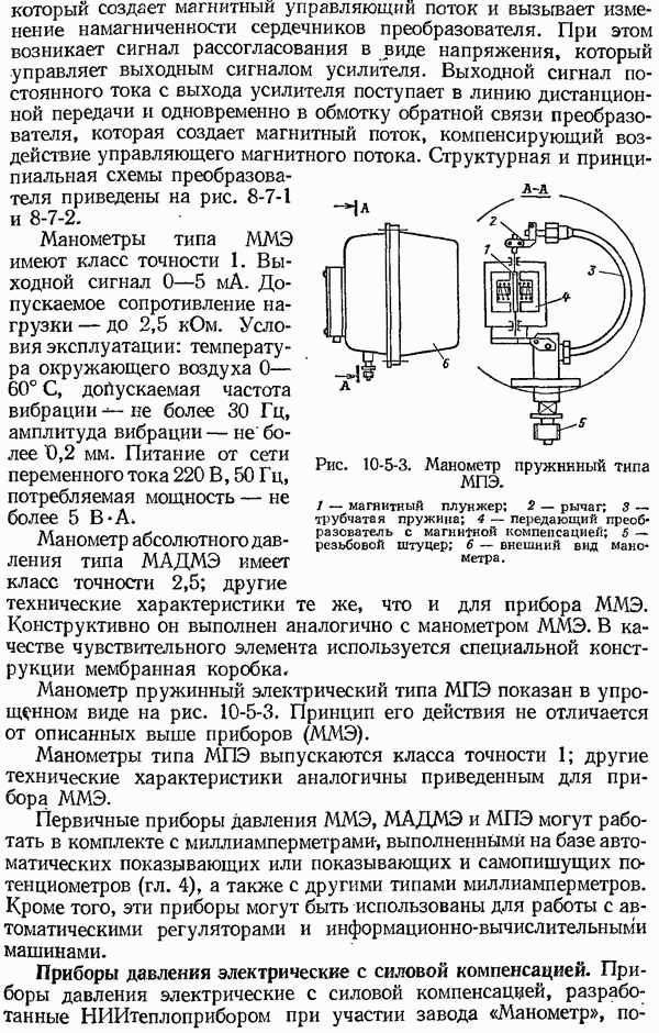 Рис. 8-11-2. Схема устройства пневматического передающего преобразователя. Пневматический передающий преобразователь со схемой, показанной на рис. 8-11-2, устанавливается в качестве дополнительного устройства в манометрических термометрах, выпускаемых казанским заводом «Теплоконт-роль». В основу построения этого пневматического передающего преобразователя положен принцип силовой компенсации. Угол поворота выходной оси 1 прибора посредством тяги 2, поводков 3 и 4, рычага 5 и цилиндрической пружины 7 передается на свободный конец манометрической пружины 6 устройства обратной связи. При повороте оси 1 свободный конец манометрической пружины, перемещаясь под действием усилия дистанционнои передачи и одновременно в манометрическую пружину устройства обратной связи, где преобразуется в пропорциональное усилие обратной связи Мерой усилия Заслонка индикатора рассогласования имеет максимальный рабочий ход примерно Пневматический преобразователь снабжен корректором нуля, с помощью которого устанавливается начальное значение выходного сигнала Пределы допускаемых основной и дополнительных погрешностей пневматических передающих преобразователей нормируются в зависимости от типа и класса точности манометрического термометра. В основу построения пневматических передающих преобразователей для преобразования угла поворота оси манометров, дифманометров типа