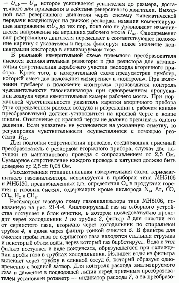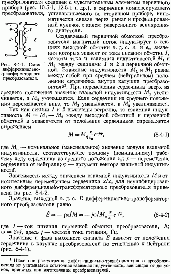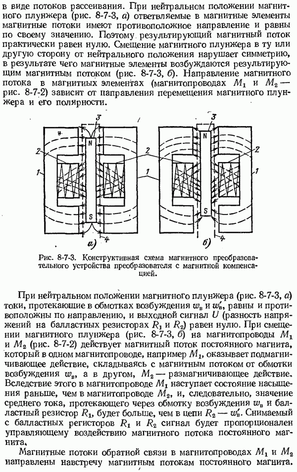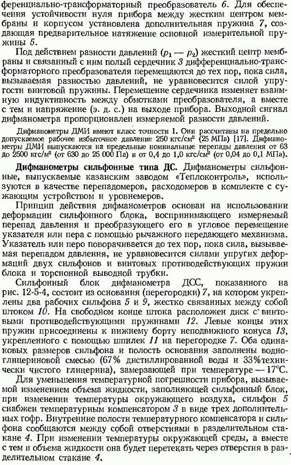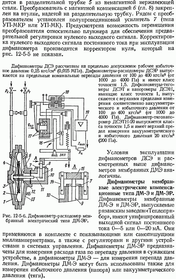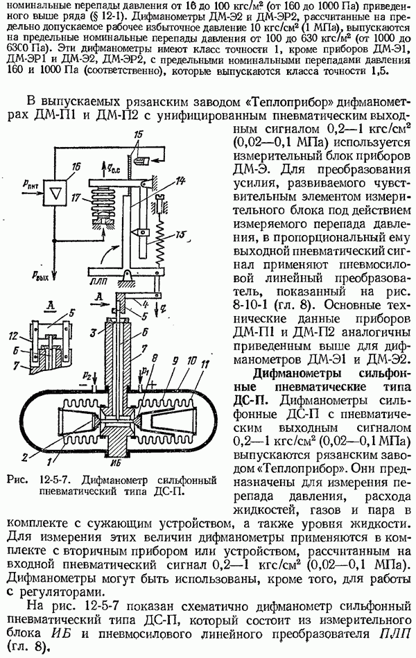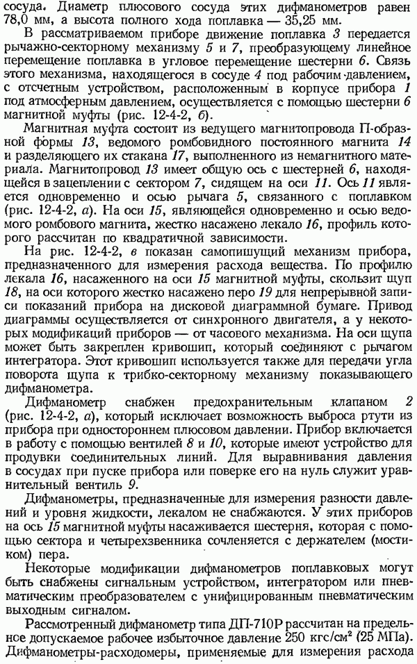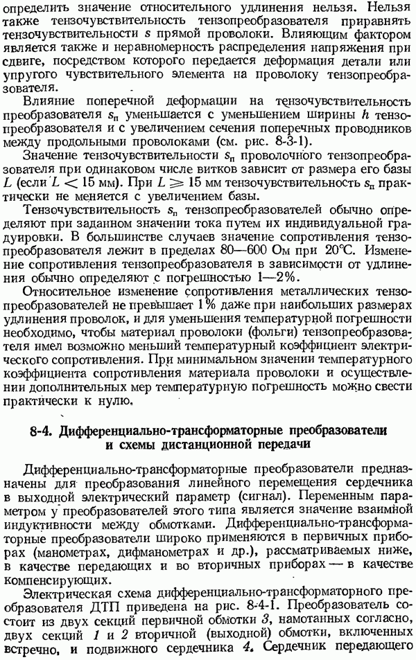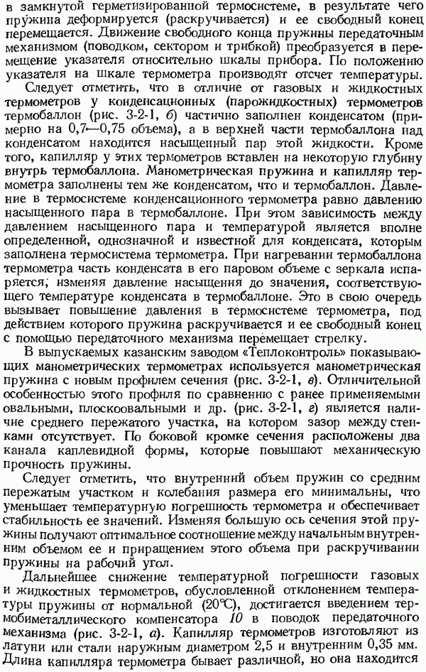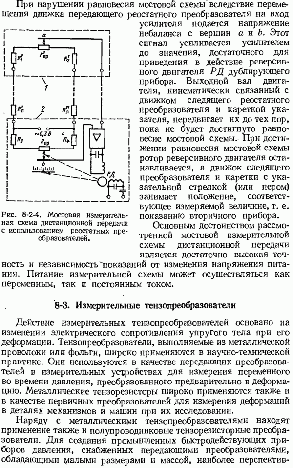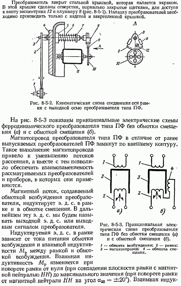 Рис. 8-11-2. Схема устройства пневматического передающего преобразователя. Пневматический передающий преобразователь со схемой, показанной на рис. 8-11-2, устанавливается в качестве дополнительного устройства в манометрических термометрах, выпускаемых казанским заводом «Теплоконт-роль». В основу построения этого пневматического передающего преобразователя положен принцип силовой компенсации. Угол поворота выходной оси 1 прибора посредством тяги 2, поводков 3 и 4, рычага 5 и цилиндрической пружины 7 передается на свободный конец манометрической пружины 6 устройства обратной связи. При повороте оси 1 свободный конец манометрической пружины, перемещаясь под действием усилия дистанционнои передачи и одновременно в манометрическую пружину устройства обратной связи, где преобразуется в пропорциональное усилие обратной связи Мерой усилия Заслонка индикатора рассогласования имеет максимальный рабочий ход примерно Пневматический преобразователь снабжен корректором нуля, с помощью которого устанавливается начальное значение выходного сигнала Пределы допускаемых основной и дополнительных погрешностей пневматических передающих преобразователей нормируются в зависимости от типа и класса точности манометрического термометра. В основу построения пневматических передающих преобразователей для преобразования угла поворота оси манометров, дифманометров типа