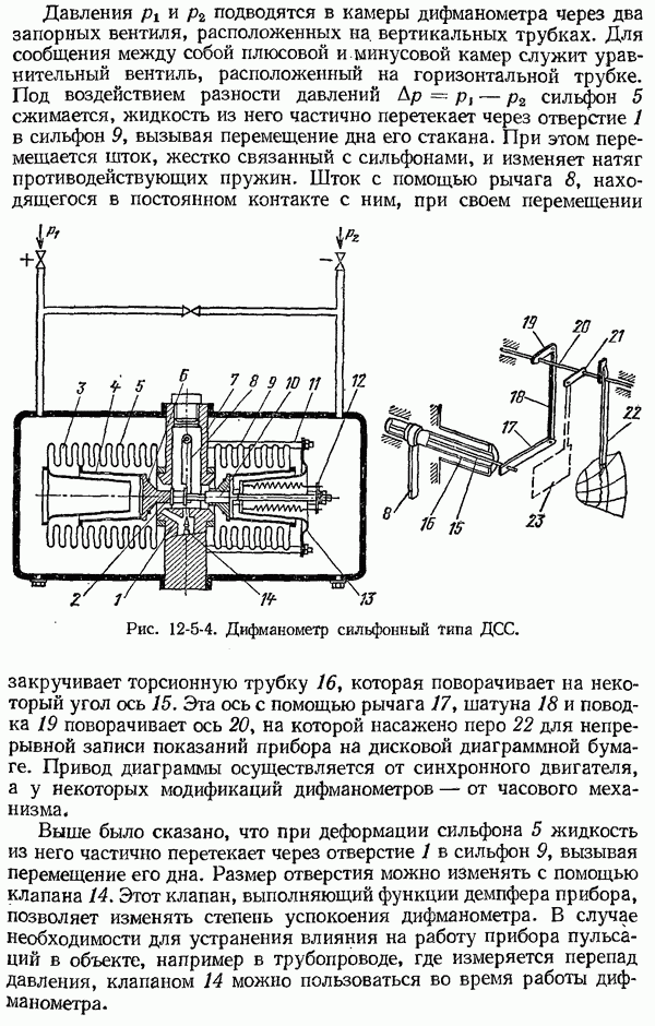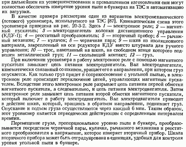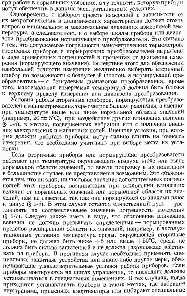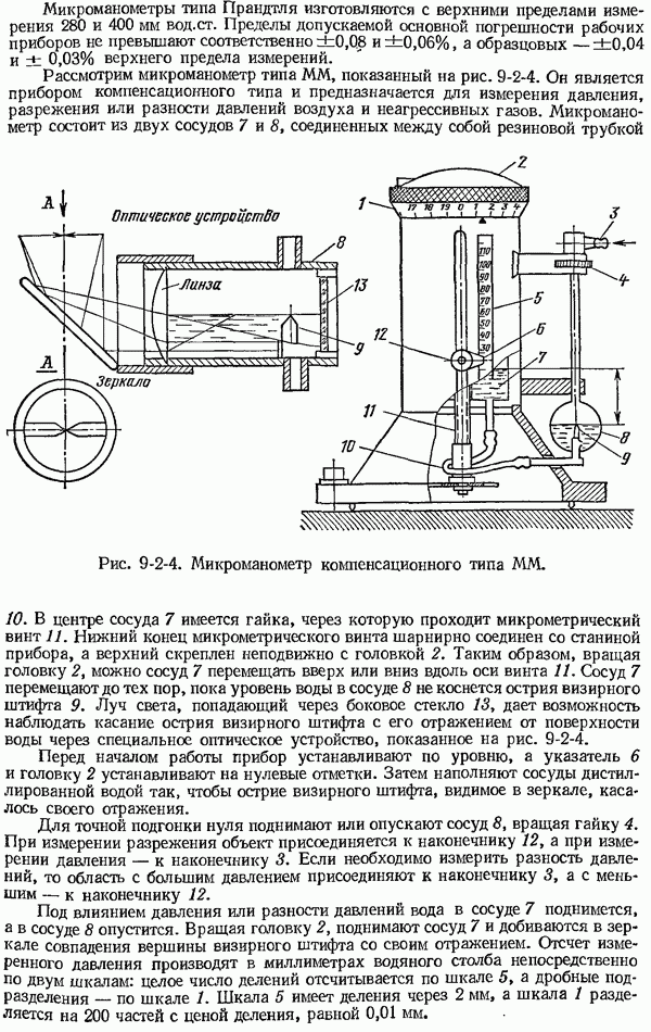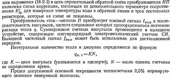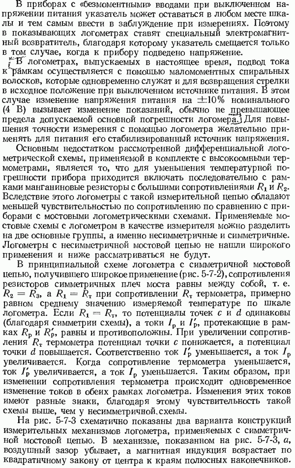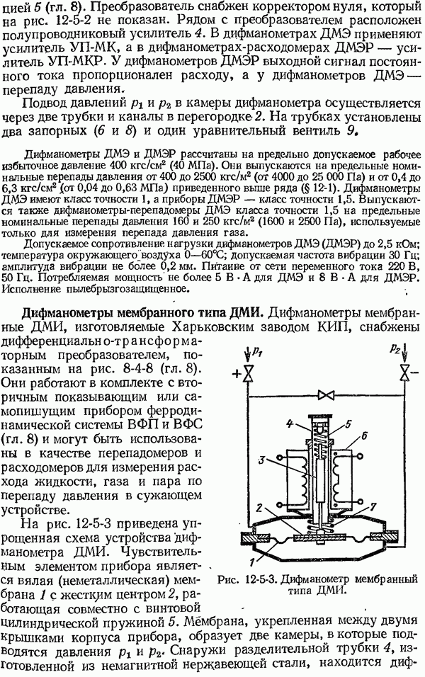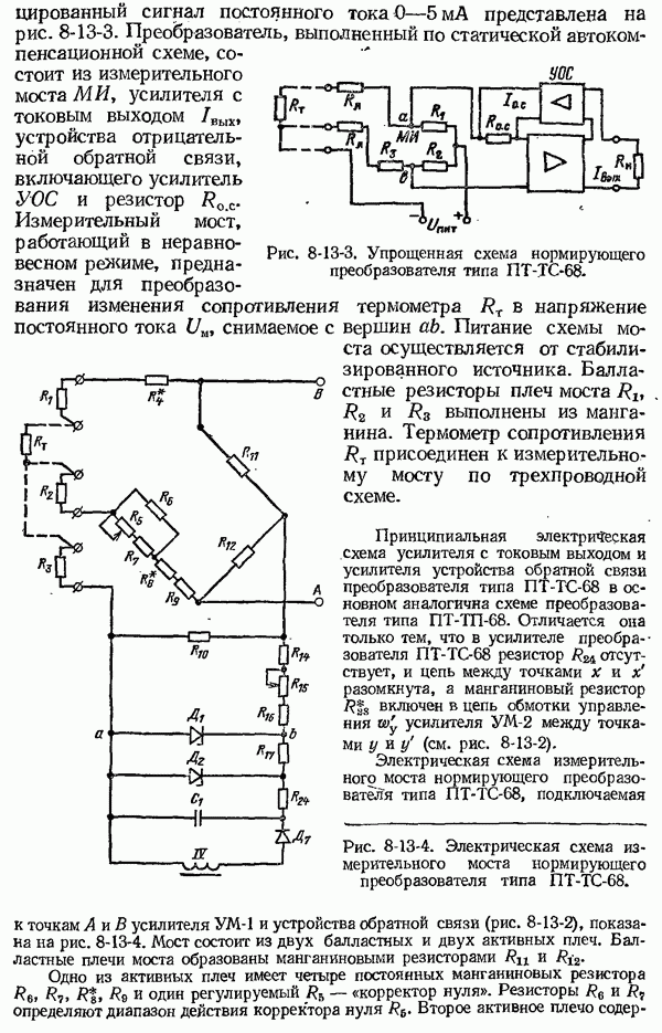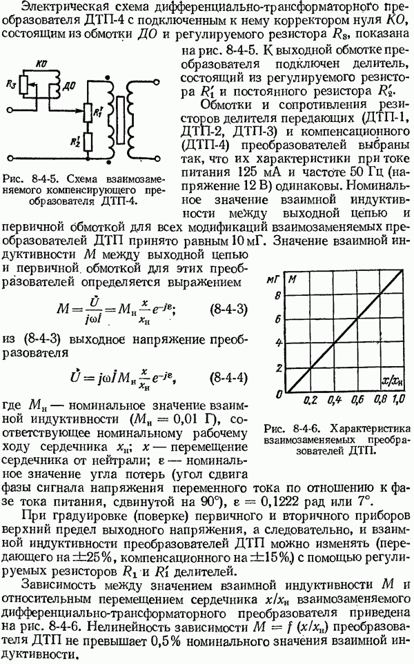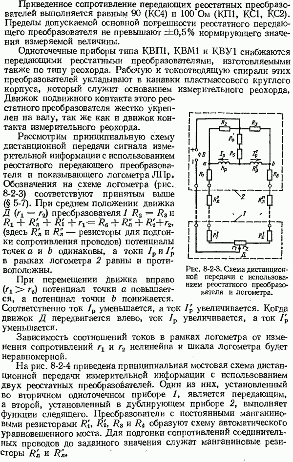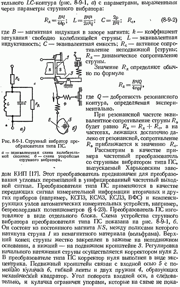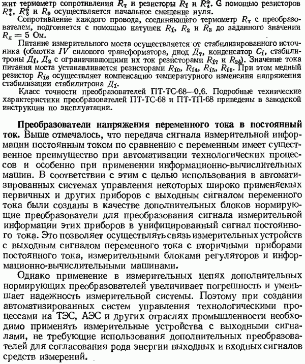Рис. 8-11-2. Схема устройства пневматического передающего преобразователя. Пневматический передающий преобразователь со схемой, показанной на рис. 8-11-2, устанавливается в качестве дополнительного устройства в манометрических термометрах, выпускаемых казанским заводом «Теплоконт-роль». В основу построения этого пневматического передающего преобразователя положен принцип силовой компенсации. Угол поворота выходной оси 1 прибора посредством тяги 2, поводков 3 и 4, рычага 5 и цилиндрической пружины 7 передается на свободный конец манометрической пружины 6 устройства обратной связи. При повороте оси 1 свободный конец манометрической пружины, перемещаясь под действием усилия дистанционнои передачи и одновременно в манометрическую пружину устройства обратной связи, где преобразуется в пропорциональное усилие обратной связи Мерой усилия Заслонка индикатора рассогласования имеет максимальный рабочий ход примерно Пневматический преобразователь снабжен корректором нуля, с помощью которого устанавливается начальное значение выходного сигнала Пределы допускаемых основной и дополнительных погрешностей пневматических передающих преобразователей нормируются в зависимости от типа и класса точности манометрического термометра. В основу построения пневматических передающих преобразователей для преобразования угла поворота оси манометров, дифманометров типа