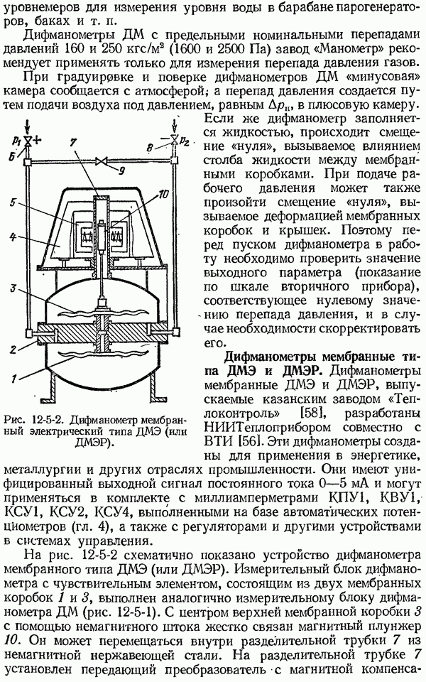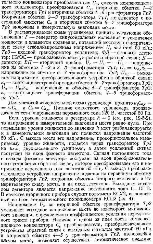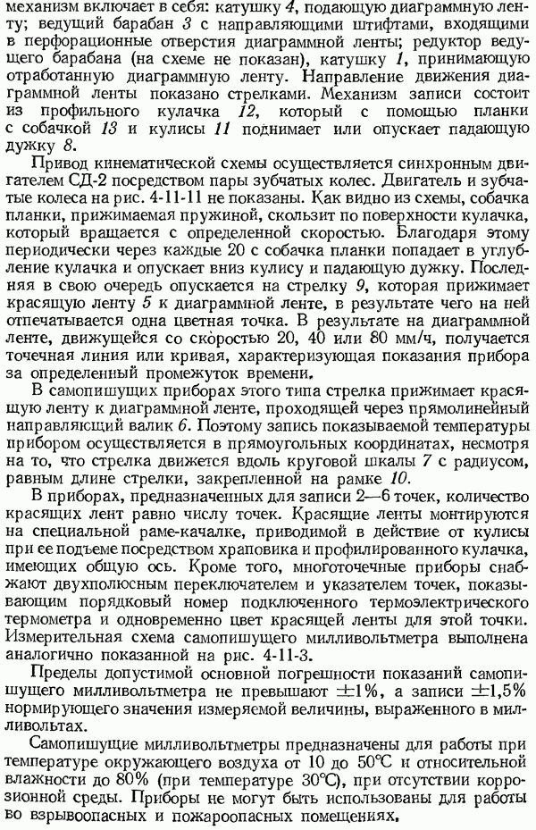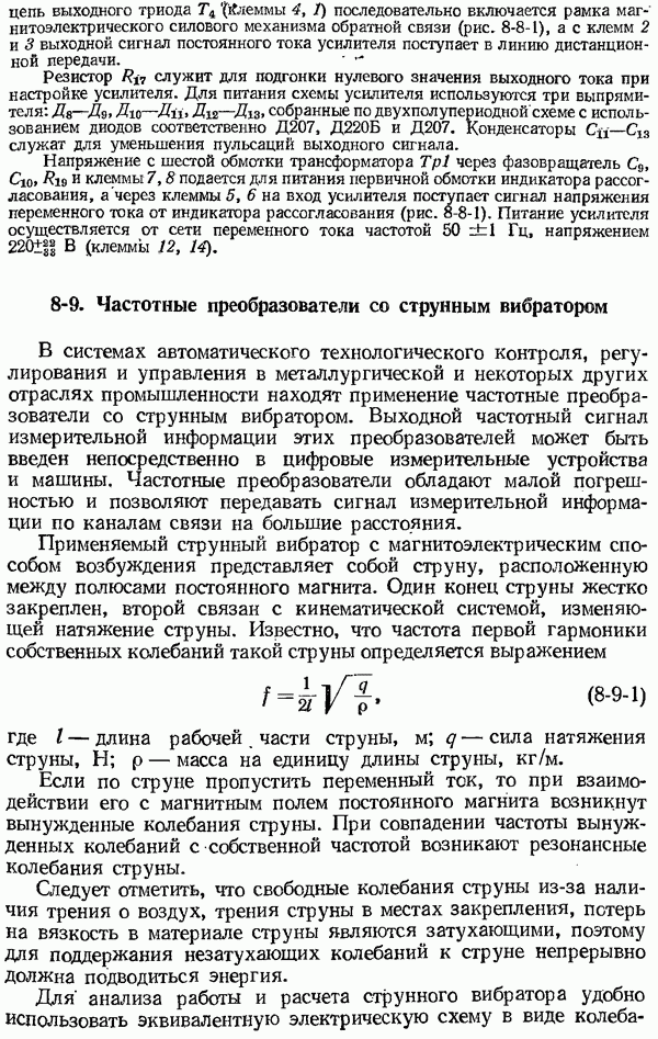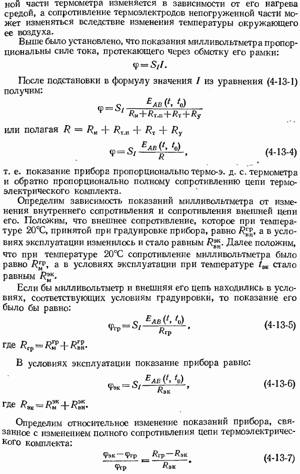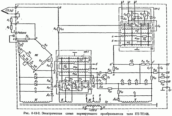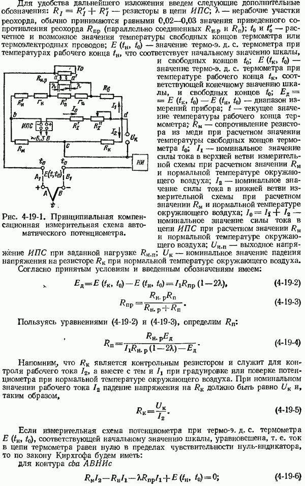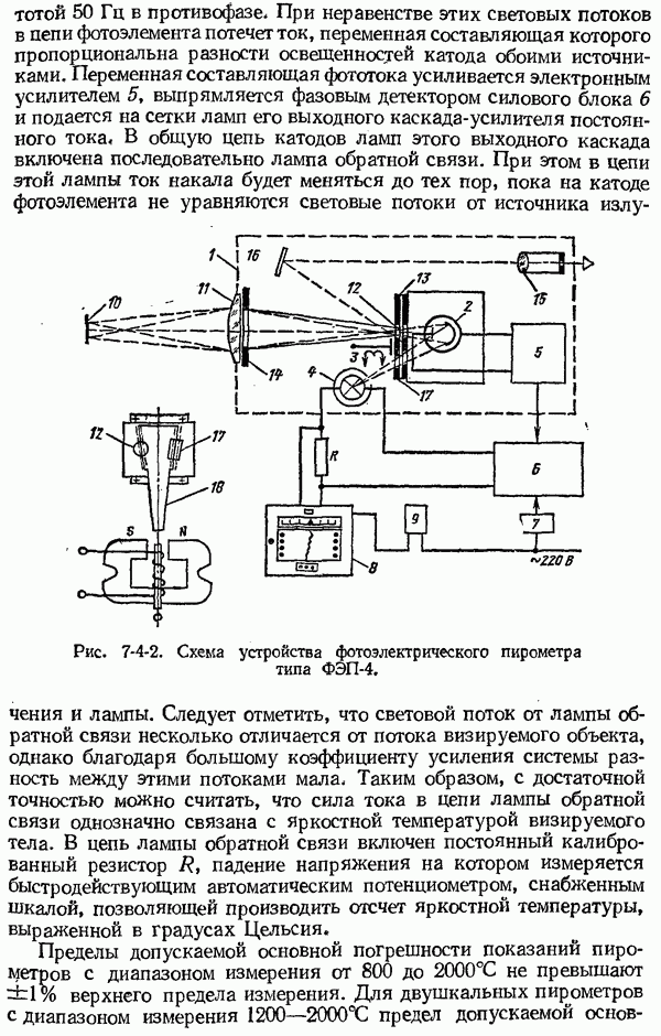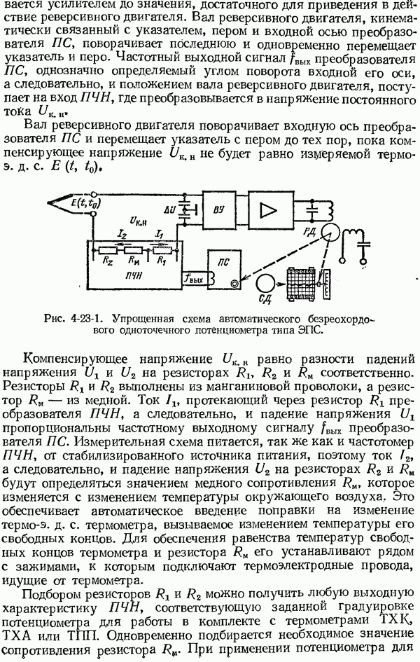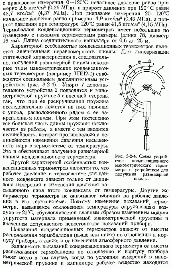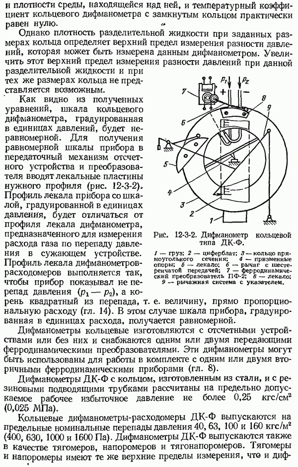 Рис. 8-11-2. Схема устройства пневматического передающего преобразователя. Пневматический передающий преобразователь со схемой, показанной на рис. 8-11-2, устанавливается в качестве дополнительного устройства в манометрических термометрах, выпускаемых казанским заводом «Теплоконт-роль». В основу построения этого пневматического передающего преобразователя положен принцип силовой компенсации. Угол поворота выходной оси 1 прибора посредством тяги 2, поводков 3 и 4, рычага 5 и цилиндрической пружины 7 передается на свободный конец манометрической пружины 6 устройства обратной связи. При повороте оси 1 свободный конец манометрической пружины, перемещаясь под действием усилия дистанционнои передачи и одновременно в манометрическую пружину устройства обратной связи, где преобразуется в пропорциональное усилие обратной связи Мерой усилия Заслонка индикатора рассогласования имеет максимальный рабочий ход примерно Пневматический преобразователь снабжен корректором нуля, с помощью которого устанавливается начальное значение выходного сигнала Пределы допускаемых основной и дополнительных погрешностей пневматических передающих преобразователей нормируются в зависимости от типа и класса точности манометрического термометра. В основу построения пневматических передающих преобразователей для преобразования угла поворота оси манометров, дифманометров типа