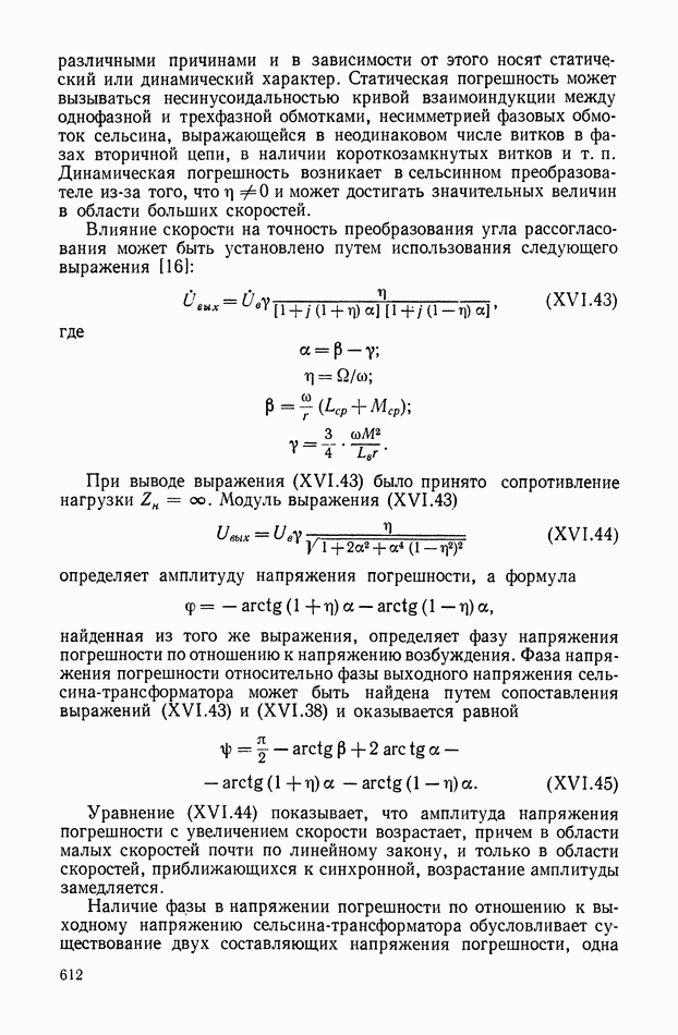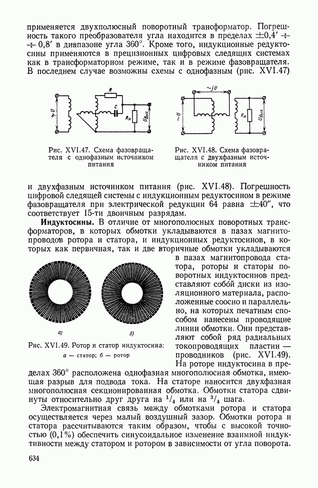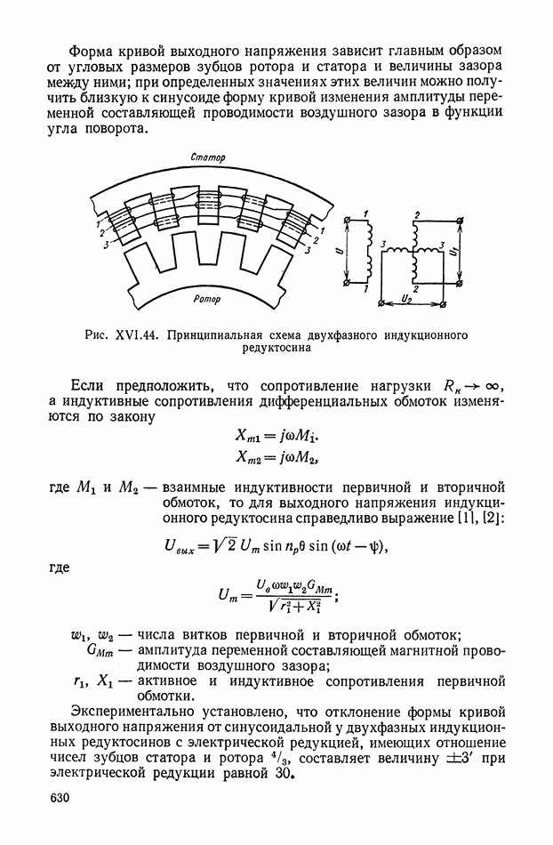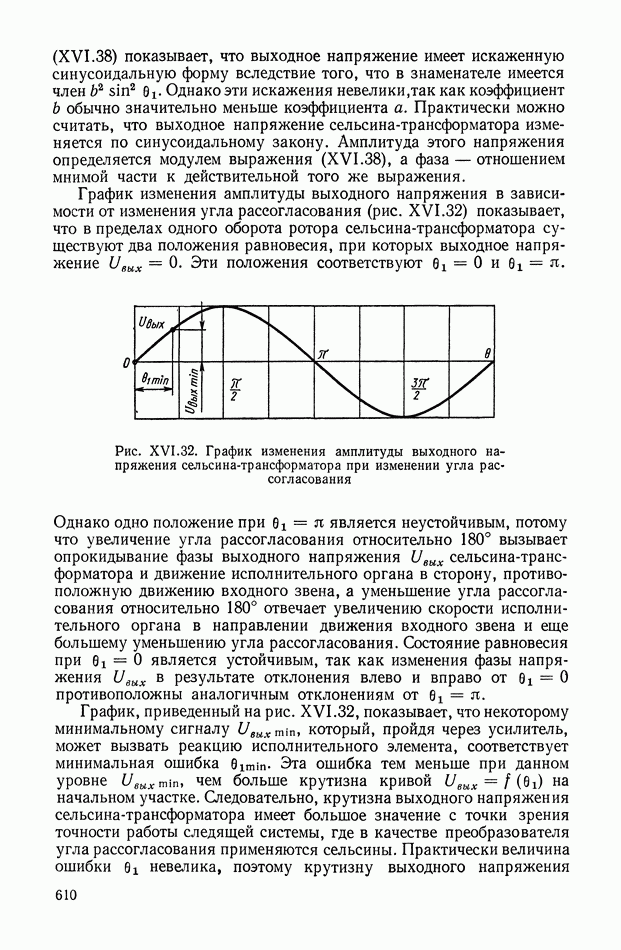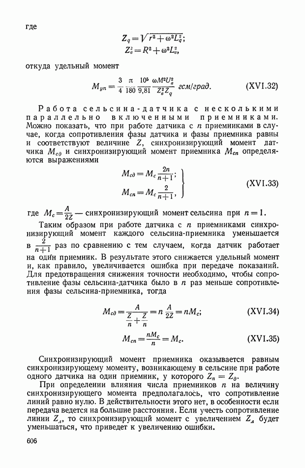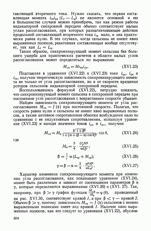 Выражение (XVI.22) показывает, что синхронизирующий момент сельсина имеет две составляющие, одна из которых носит реактивный характер и обусловлена наличием явно выраженных полюсов, а вторая — взаимодействием потока возбуждения с поперечной составляющей вторичного тока. Нужно сказать, что первая составляющая момента Таким образом, синхронизирующий момент сельсина без большого ущерба для практических расчетов в области малых углов рассогласования может определяться по выражению