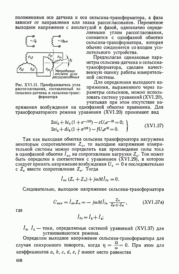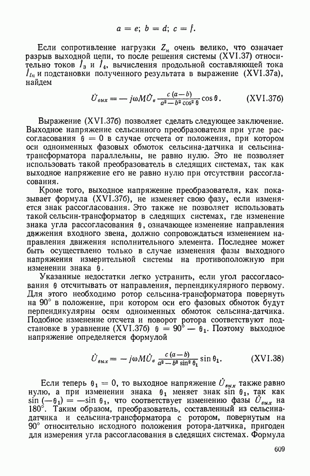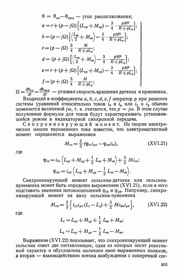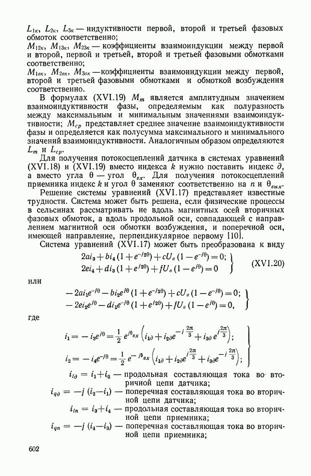 В формулах (XVI. 19) Для получения потокосцеплений датчика в системах уравнений (XVI. 18) и (XVI. 19) вместо индекса Решение системы уравнений (XVI. 17) представляет известные трудности. Система может быть решена, если физические процессы в сельсинах рассматривать не вдоль магнитных осей вторичных фазовых обмоток, а вдоль продольной оси, совпадающей с направлением магнитной оси обмотки возбуждения, и поперечной оси, имеющей направление, перпендикулярное первому [10]. Система уравнений (XVI. 17) может быть преобразована к виду