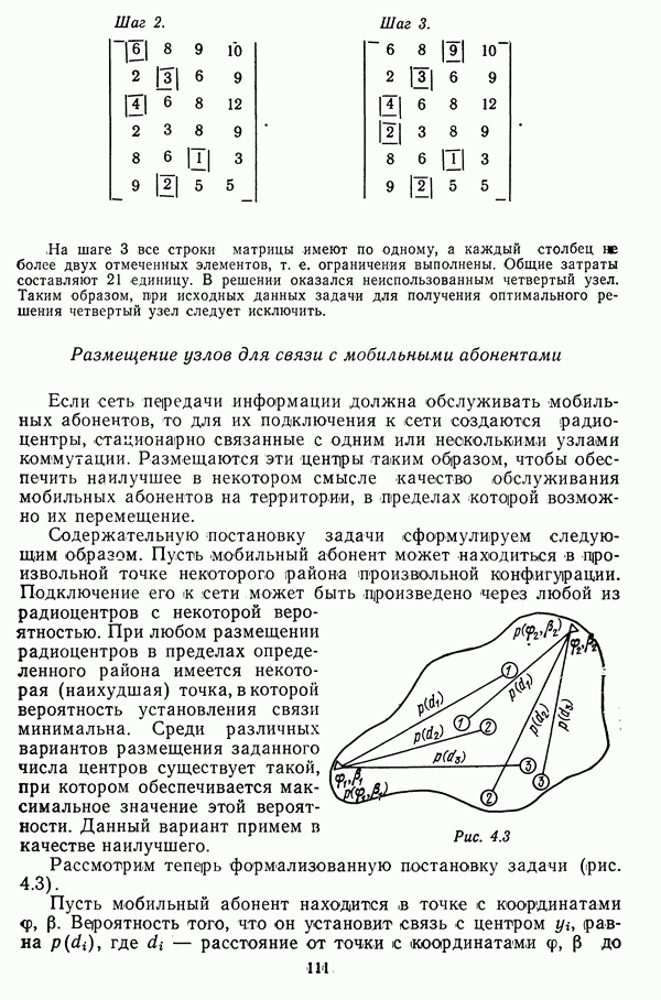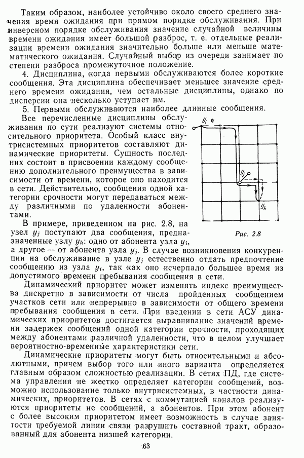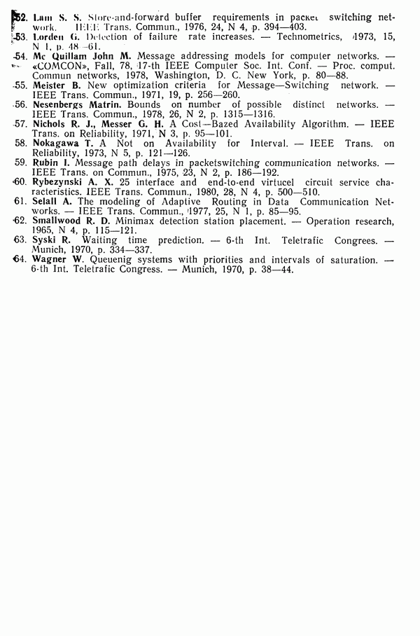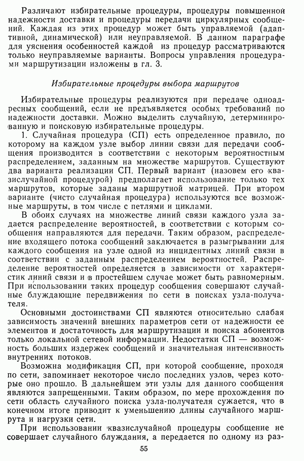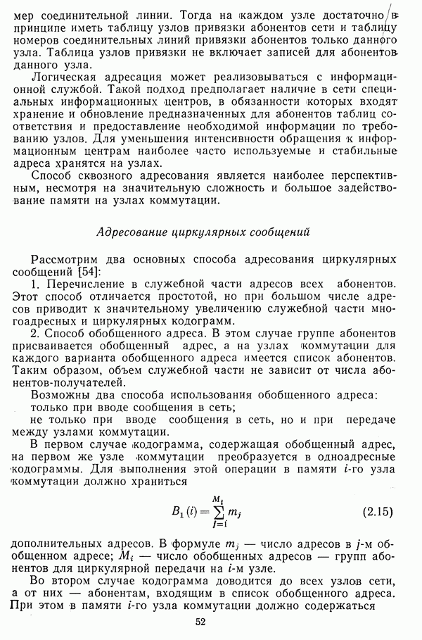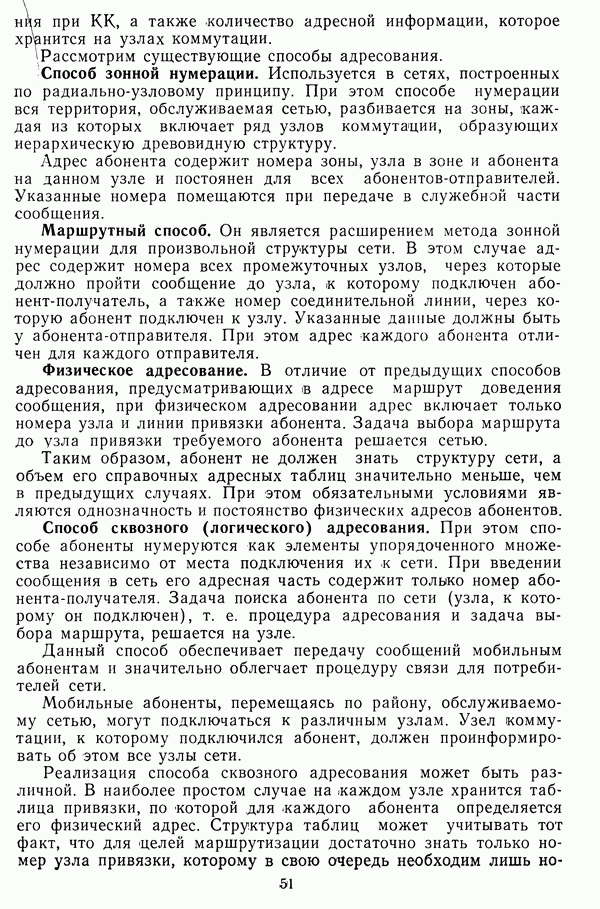 2.3. АДРЕСОВАНИЕ СООБЩЕНИЙСпособы адресования избирательных сообщенийДля идентификации абонентов и нахождения места их расположения в сети каждому из них присваивается признак — адрес. Принцип формирования адреса называется способом адресования и определяется назначением и структурой сети. В сетях с КК способ адресования называется системой нумерации. Способ адресования определяет заполнение адресной части заголовка сообщений при КС (КП) или состав служебного сообщения при КК, а также количество адресной информации, которое хранится на узлах коммутации. Рассмотрим существующие способы адресования. Способ зонной нумерации. Используется в сетях, построенных по радиально-узловому принципу. При этом способе нумерации вся территория, обслуживаемая сетью, разбивается на зоны, каждая из которых включает ряд узлов коммутации, образующих иерархическую древовидную структуру. Адрес абонента содержит номера зоны, узла в зоне и абонента на данном узле и постоянен для всех абонентов-отправителей. Указанные номера помещаются при передаче в служебной части сообщения. Маршрутный способ. Он является расширением метода зонной нумерации для произвольной структуры сети. В этом случае адрес содержит номера всех промежуточных узлов, через которые должно пройти сообщение до узла, к которому подключен абонент-получатель, а также номер соединительной линии, через которую абонент подключен к узлу. Указанные данные должны быть у абонента-отправителя. При этом адрес каждого абонента отличен для каждого отправителя. Физическое адресование. В отличие от предыдущих способов адресования, предусматривающих в адресе маршрут доведения сообщения, при физическом адресовании адрес включает только номера узла и линии привязки абонента. Задача выбора маршрута до узла привязки требуемого абонента решается сетью. Таким образом, абонент не должен знать структуру сети, а объем его справочных адресных таблиц значительно меньше, чем в предыдущих случаях. При этом обязательными условиями являются однозначность и постоянство физических адресов абонентов. Способ сквозного (логического) адресования. При этом способе абоненты нумеруются как элементы упорядоченного множества независимо от места подключения их к сети. При введении сообщения в сеть его адресная часть содержит только номер абонента-получателя. Задача поиска абонента по сети (узла, к которому он подключен), т. е. процедура адресования и задача выбора маршрута, решается на узле. Данный способ обеспечивает передачу сообщений мобильным абонентам и значительно облегчает процедуру связи для потребителей сети. Мобильные абоненты, перемещаясь по району, обслуживаемому сетью, могут подключаться к различным узлам. Узел коммутации, к которому подключился абонент, должен проинформировать об этом все узлы сети. Реализация способа сквозного адресования может быть различной. В наиболее простом случае на каждом узле хранится таблица привязки, по которой для каждого абонента определяется его физический адрес. Структура таблиц может учитывать тот факт, что для целей маршрутизации достаточно знать только номер узла привязки, которому в свою очередь необходим лишь номер соединительной линии. Тогда на каждом узле достаточно в принципе иметь таблицу узлов привязки абонентов сети и таблицу номеров 