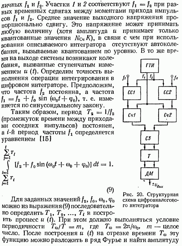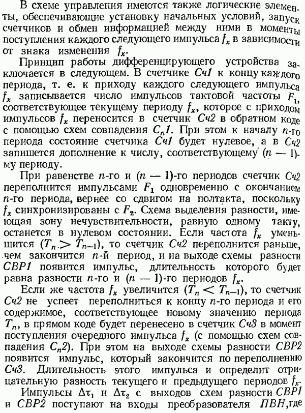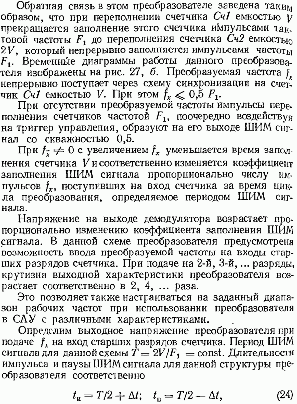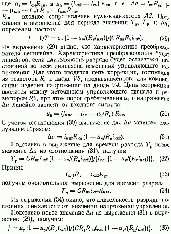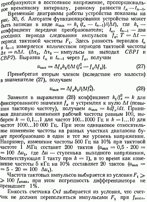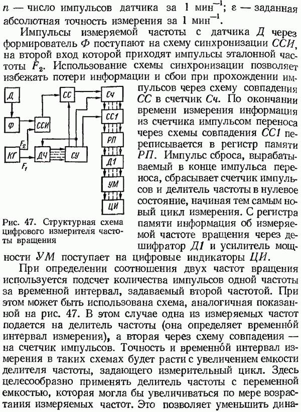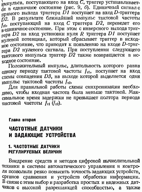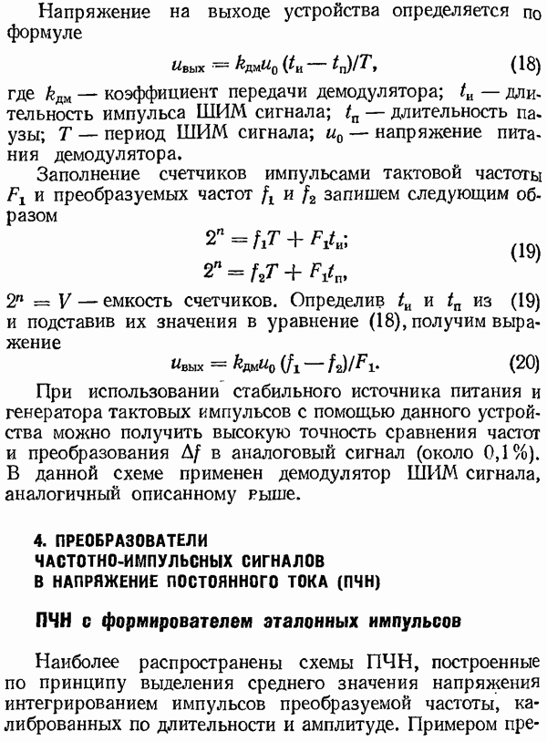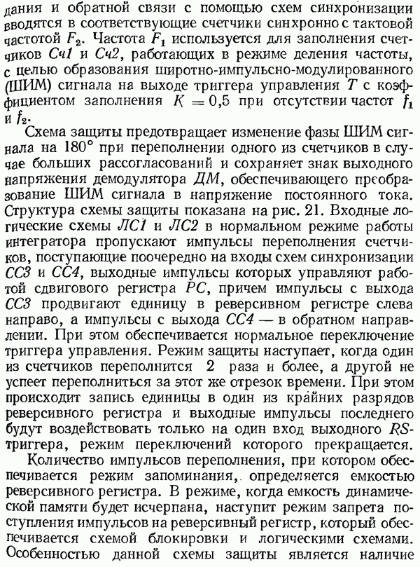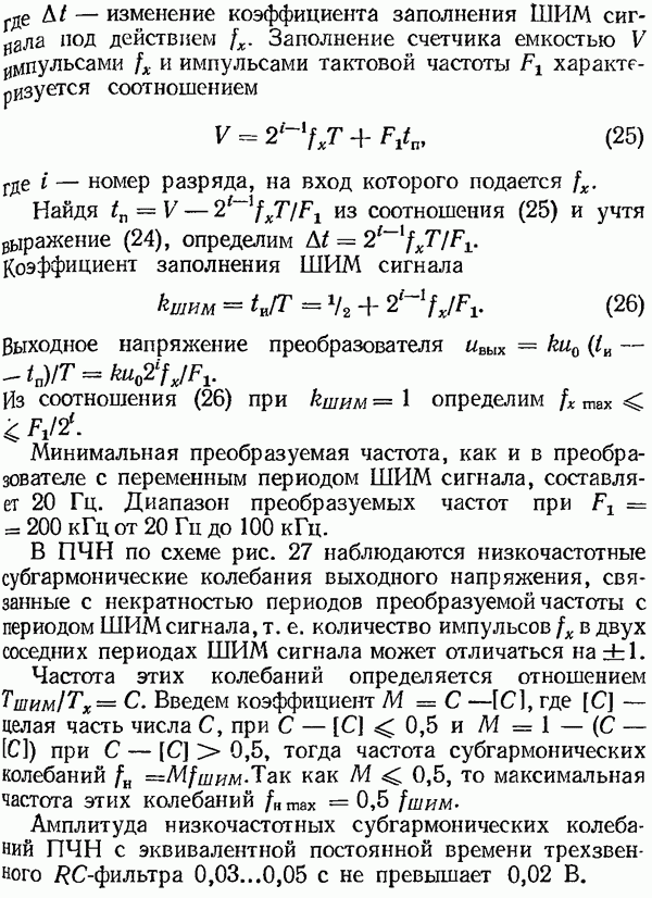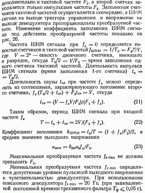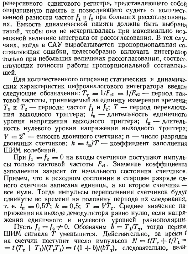 Рис. 32. Структурная схема умножителя частоты интегратора, который осуществляет непрерывное интегрирование разности этих частот с последующим преобразованием в аналоговый сигнал. На выходе управляемого генератора установятся колебания, частота которых будет определяться выражением Благодаря использованию принципа следящего уравновешивания умножитель частоты имеет высокие метрологические характеристики в установившемся режиме. Инструментальные ошибки демодулятора и управляемого генератора практически не влияют на точность показаний всего умножителя. В динамических режимах допустимая скорость изменения умножаемой частоты