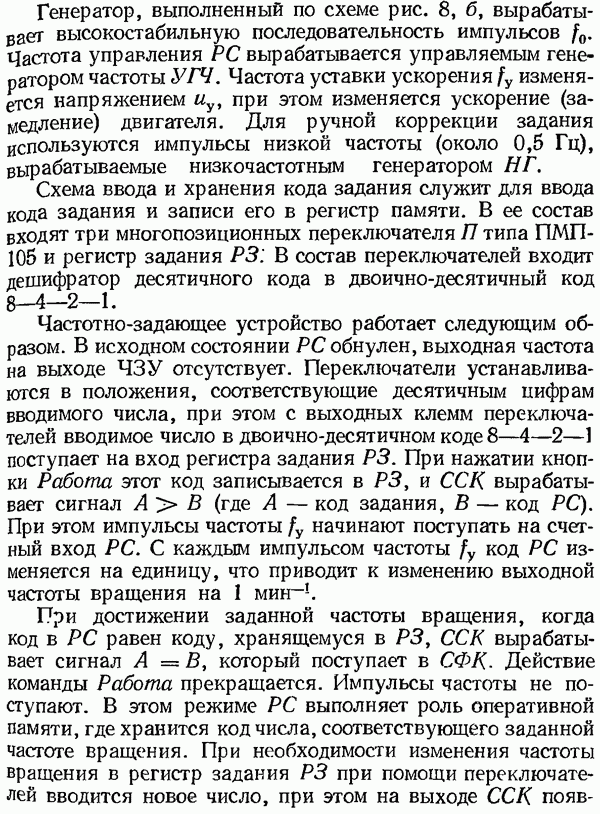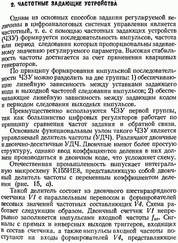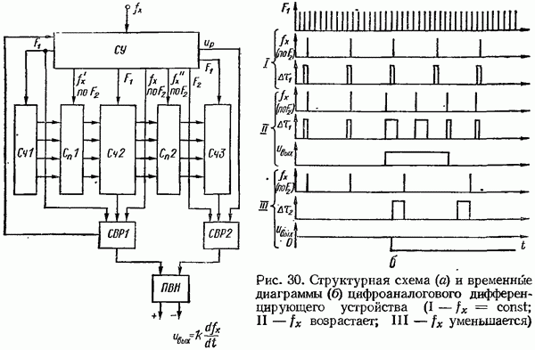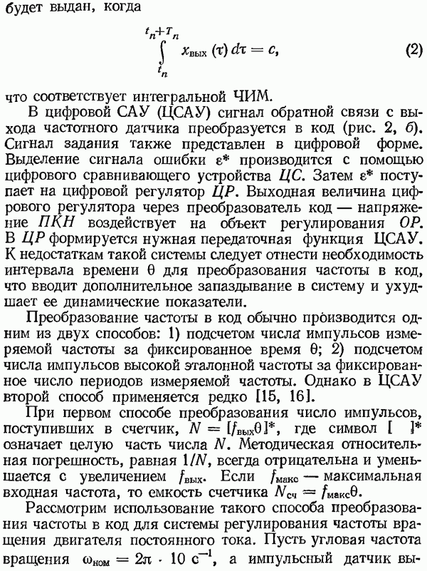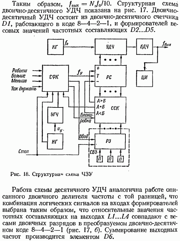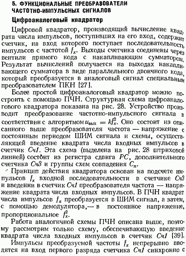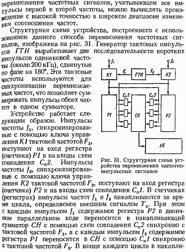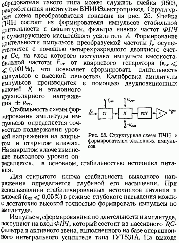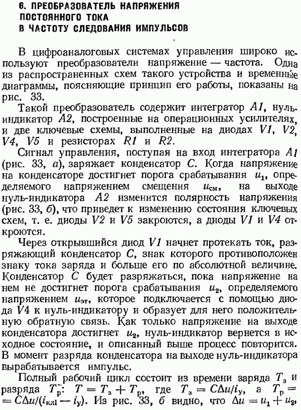Умножитель частотыУмножитель частоты предназначендля умножения частотно-импульсных сигналов на целый коэффициент. Структурная схема умножителя изображена на рис. 32 и представляет собой астатическую следящую систему частотно-фазового типа. Умножитель состоит из цифроаналогового интегратора ЦАИ, описанного выше, управляемого генератора УГ, представляющего собой преобразователь напряжения постоянного тока в частоту, и управляемого делителя частоты УДЧ, представляющего собой обычный счетчиковый делитель с дискретной установкой коэффициента деления [33]. При работе импульсы умножаемой частоты
