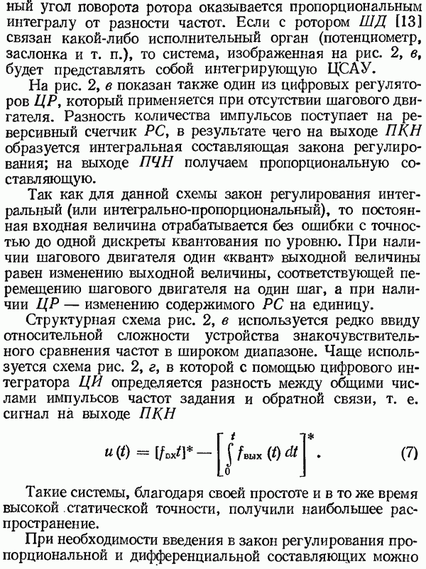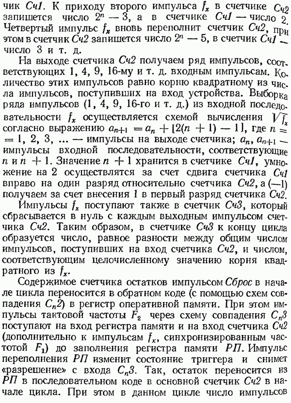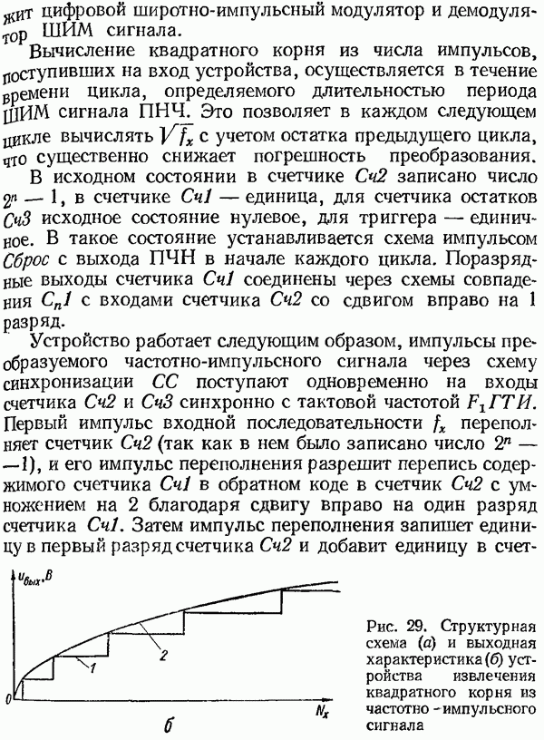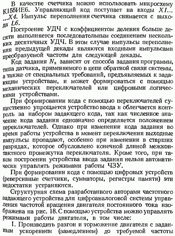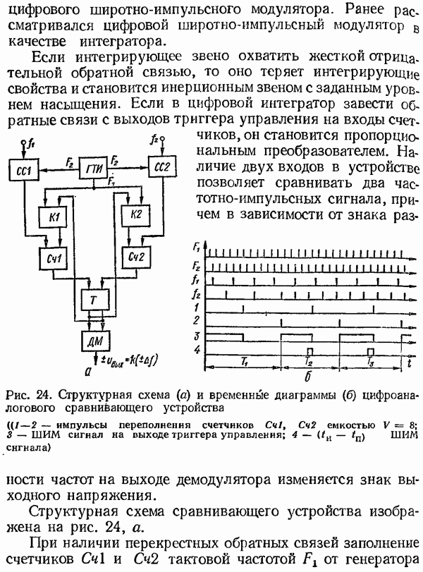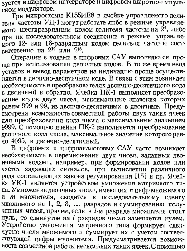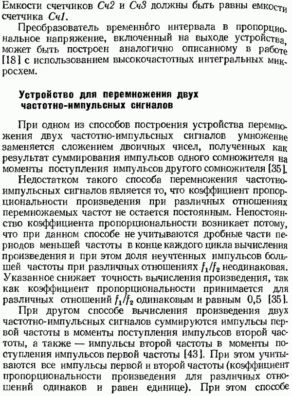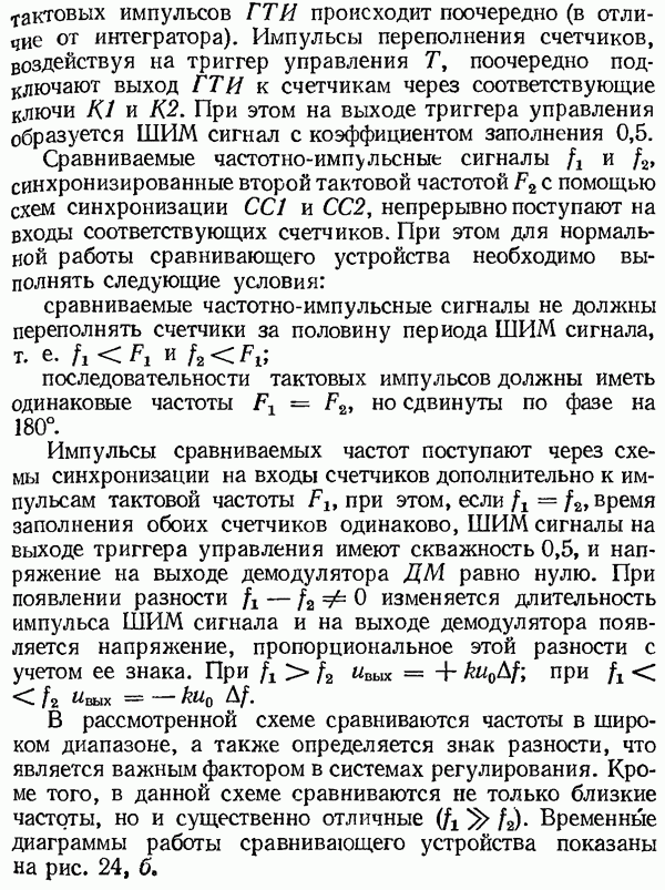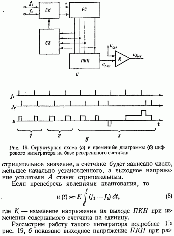 Умножитель частотыУмножитель частоты предназначендля умножения частотно-импульсных сигналов на целый коэффициент. Структурная схема умножителя изображена на рис. 32 и представляет собой астатическую следящую систему частотно-фазового типа. Умножитель состоит из цифроаналогового интегратора ЦАИ, описанного выше, управляемого генератора УГ, представляющего собой преобразователь напряжения постоянного тока в частоту, и управляемого делителя частоты УДЧ, представляющего собой обычный счетчиковый делитель с дискретной установкой коэффициента деления [33]. При работе импульсы умножаемой частоты
