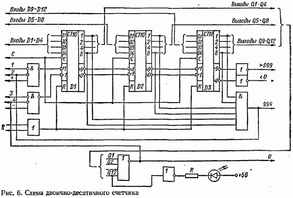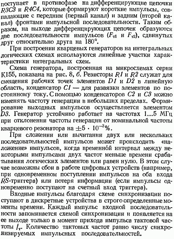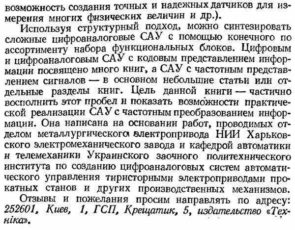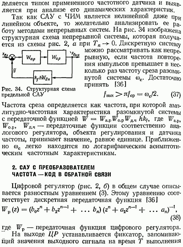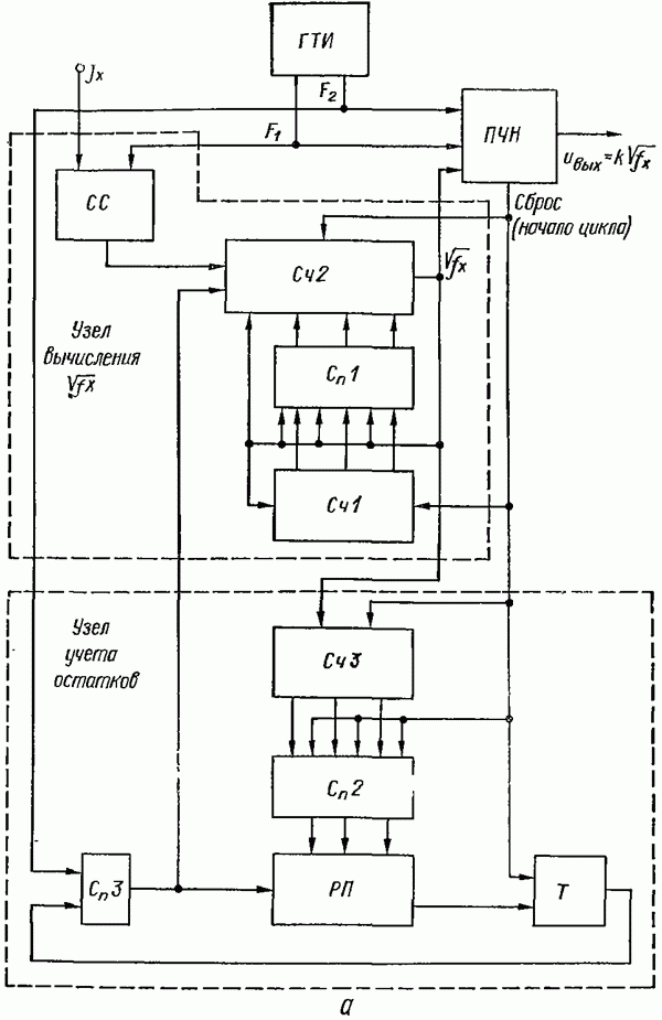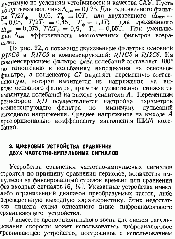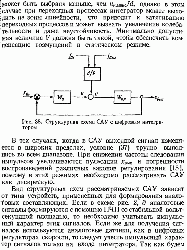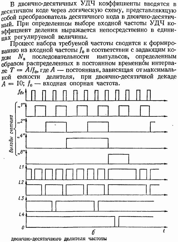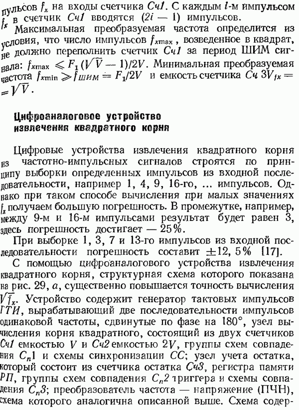 Умножитель частотыУмножитель частоты предназначендля умножения частотно-импульсных сигналов на целый коэффициент. Структурная схема умножителя изображена на рис. 32 и представляет собой астатическую следящую систему частотно-фазового типа. Умножитель состоит из цифроаналогового интегратора ЦАИ, описанного выше, управляемого генератора УГ, представляющего собой преобразователь напряжения постоянного тока в частоту, и управляемого делителя частоты УДЧ, представляющего собой обычный счетчиковый делитель с дискретной установкой коэффициента деления [33]. При работе импульсы умножаемой частоты