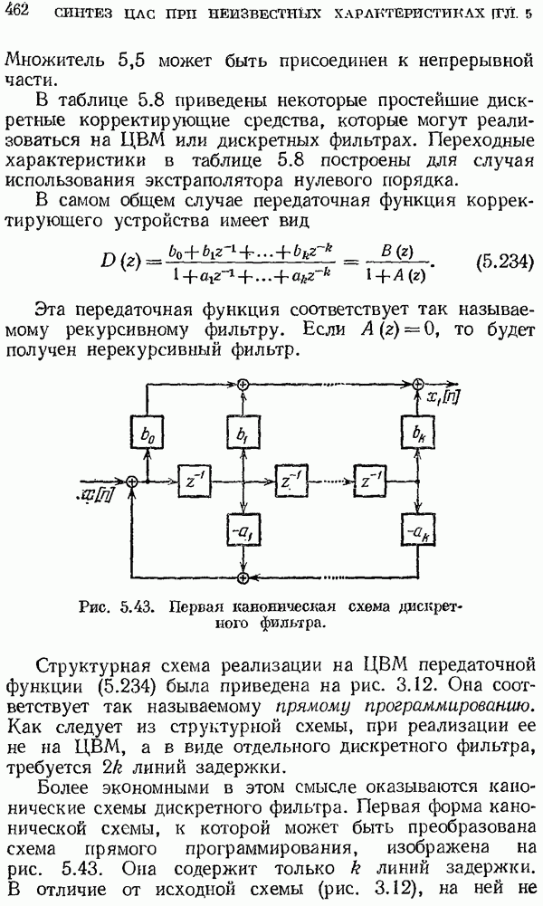 Рис. 5.43. Первая каноническая схема дискретного фильтра. Структурная схема реализации на ЦВМ передаточной функции (5.234) была приведена на рис. 3.12. Она соответствует так называемому прямому программированию. Как следует из структурной схемы, при реализации ее не на ЦВМ, а в виде отдельного дискретного фильтра, требуется Более экономными в этом смысле оказываются канонические схемы дискретного фильтра. Первая форма канонической схемы, к которой может быть преобразована схема прямого программирования, изображена на рис. 5.43. Она содержит только