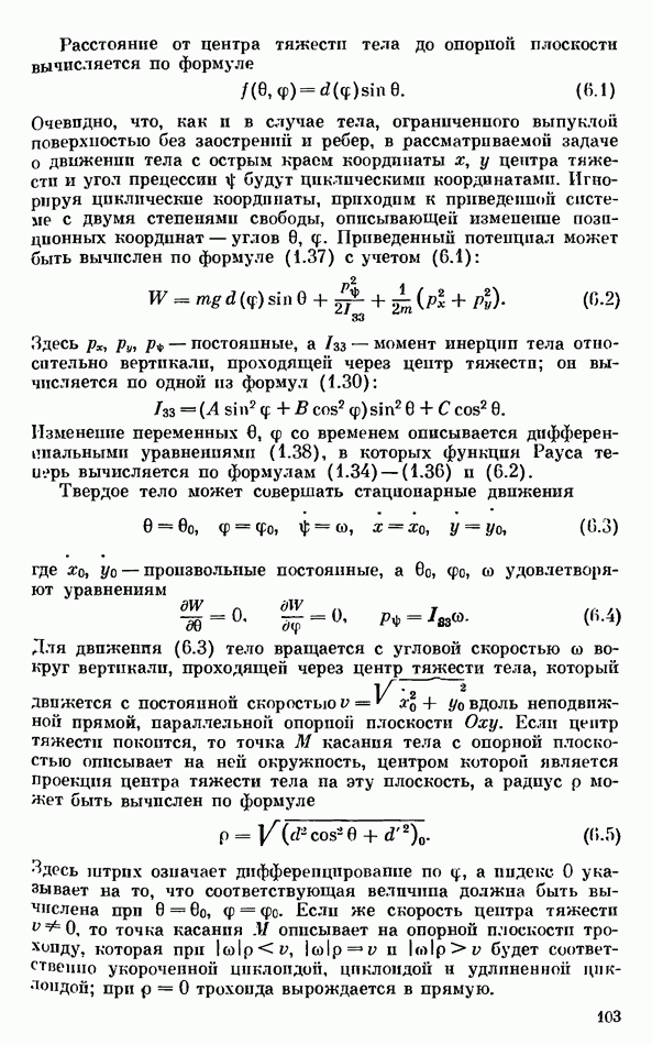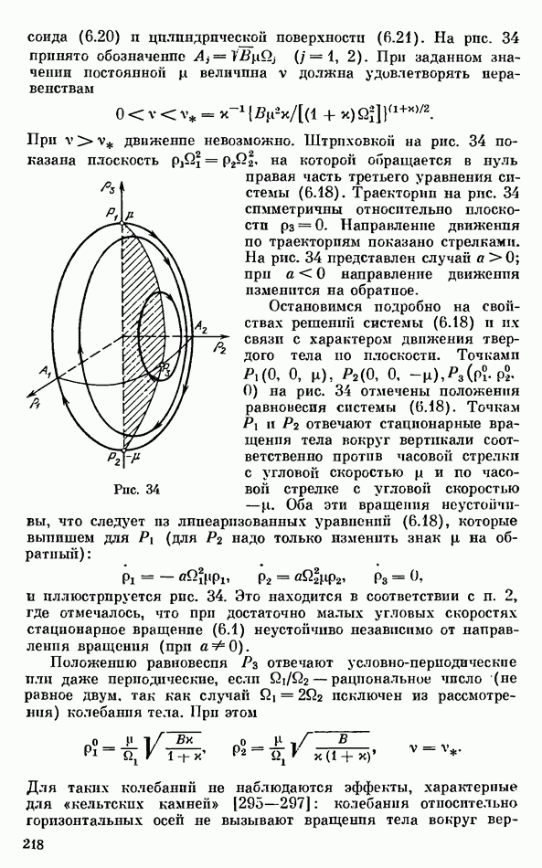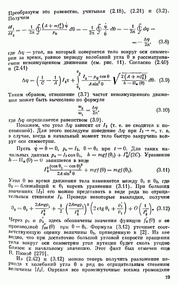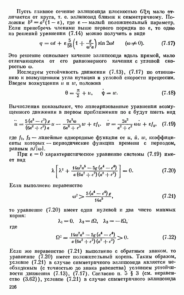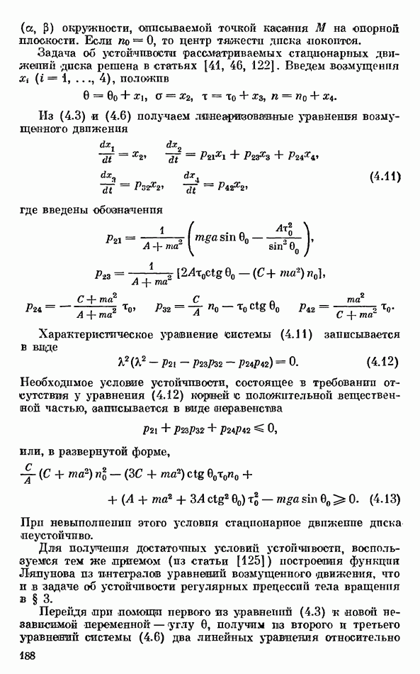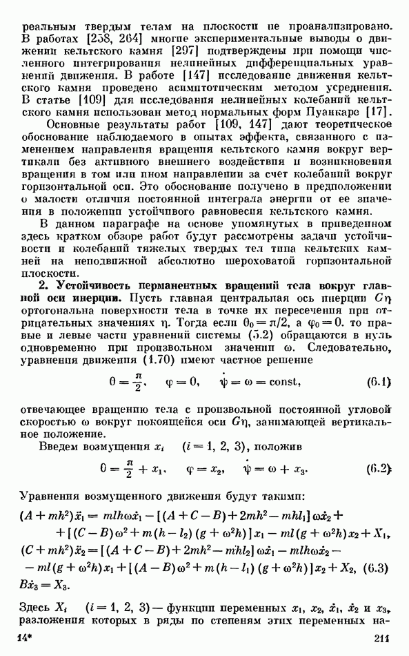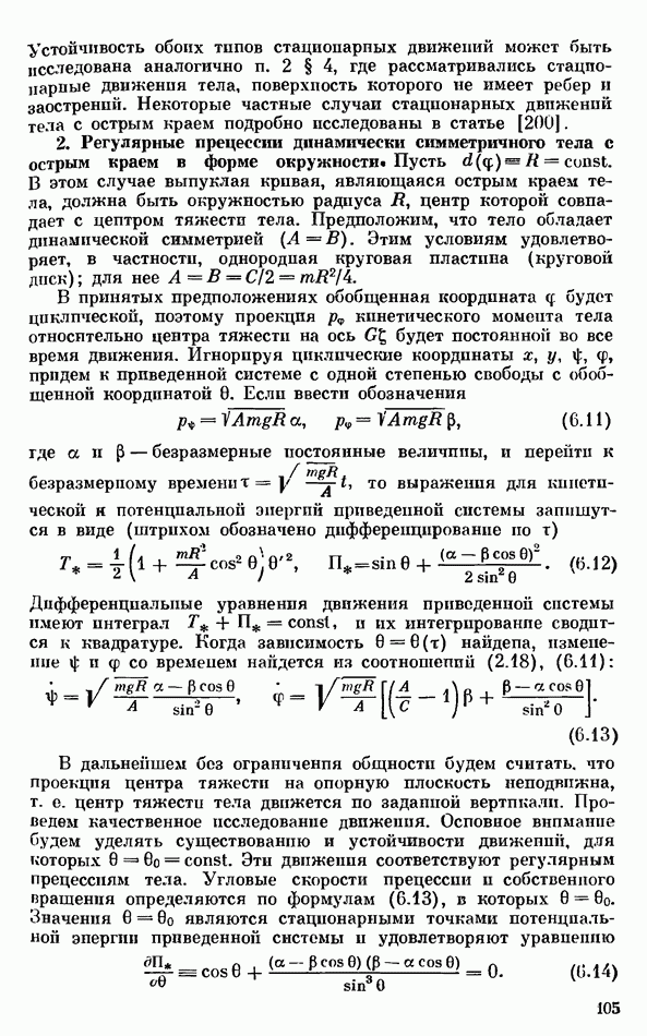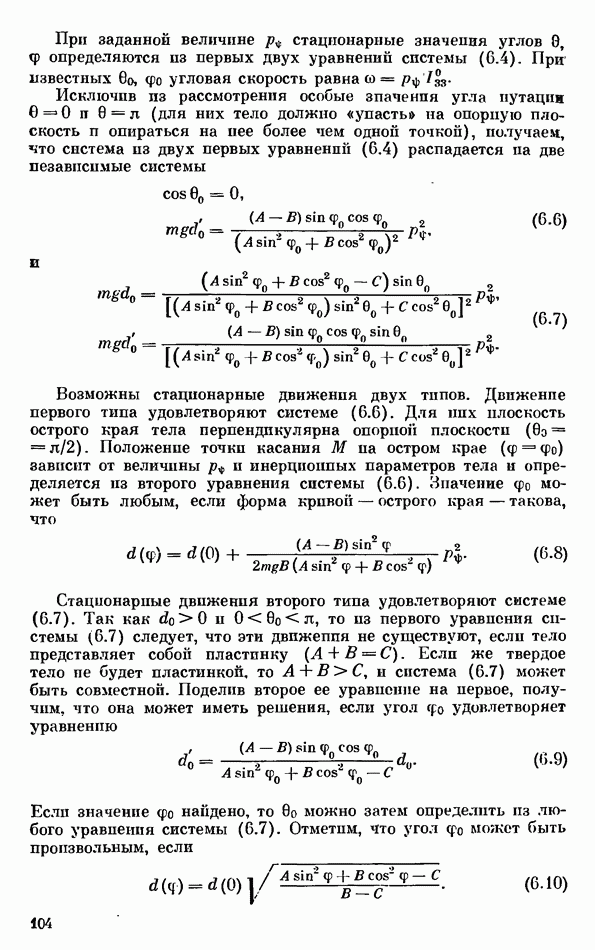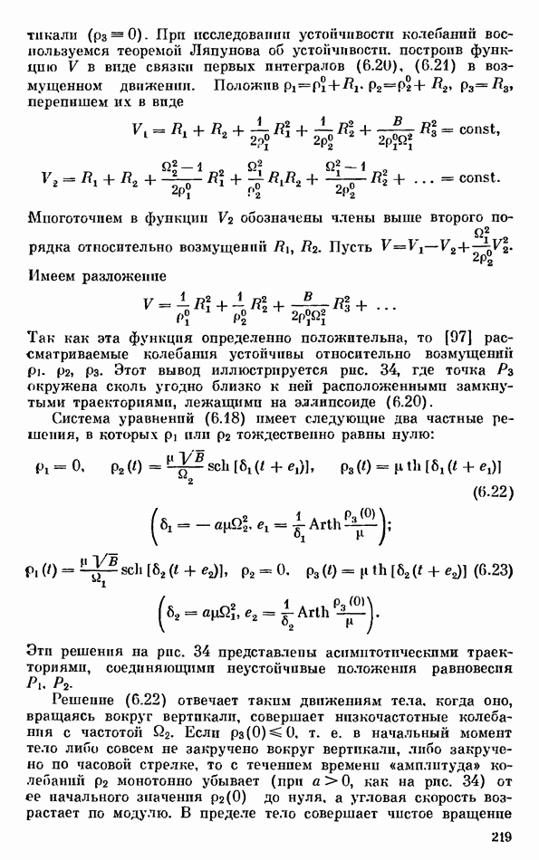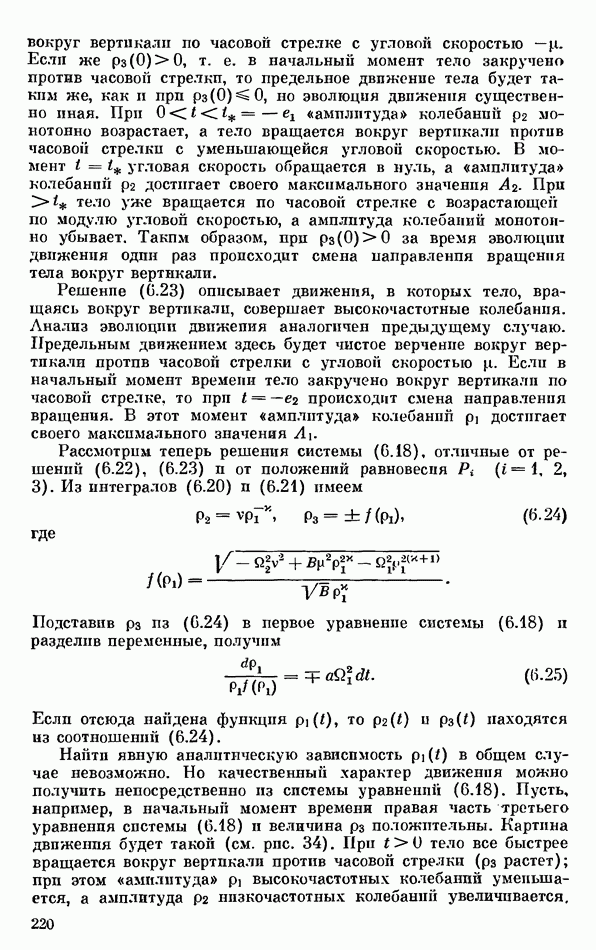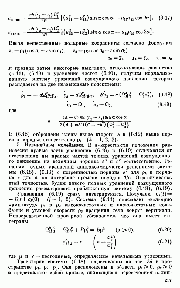 . В линеаризованной спстеме (6.9) первые два уравнения, описывающие изменение со временем углов нутации и собственного вращения, отделяются от третьего уравнения, описывающего вращение тела вокруг вертикали. Замечая, что формально эти два уравнения можно рассматривать как уравнения малых колебаний консервативной системы, сделаем в уравнениях (6.9) замену переменных