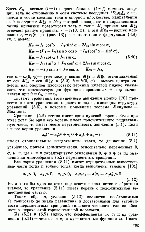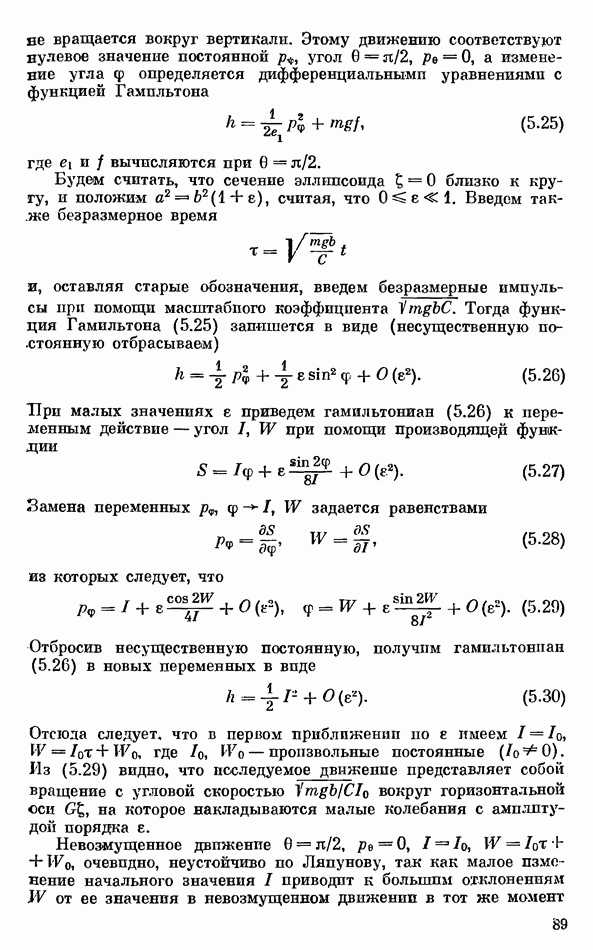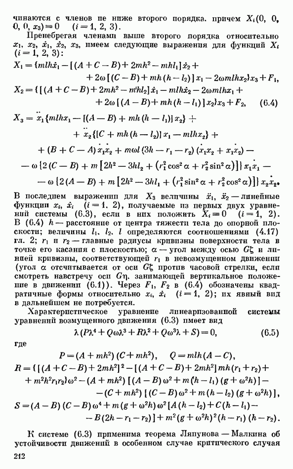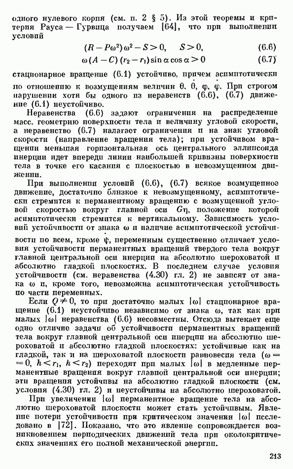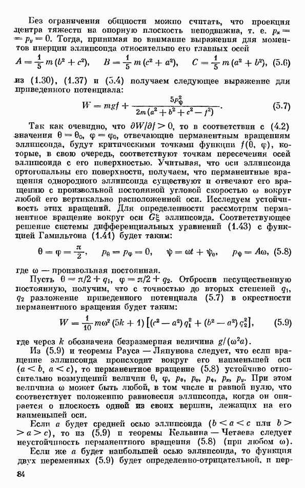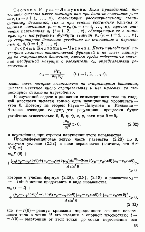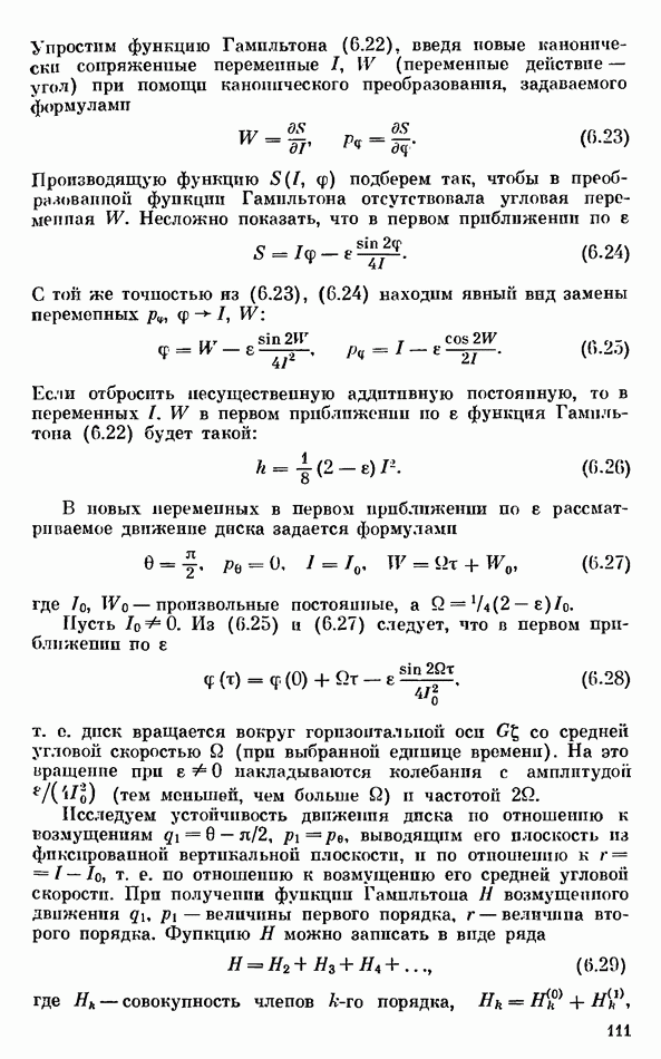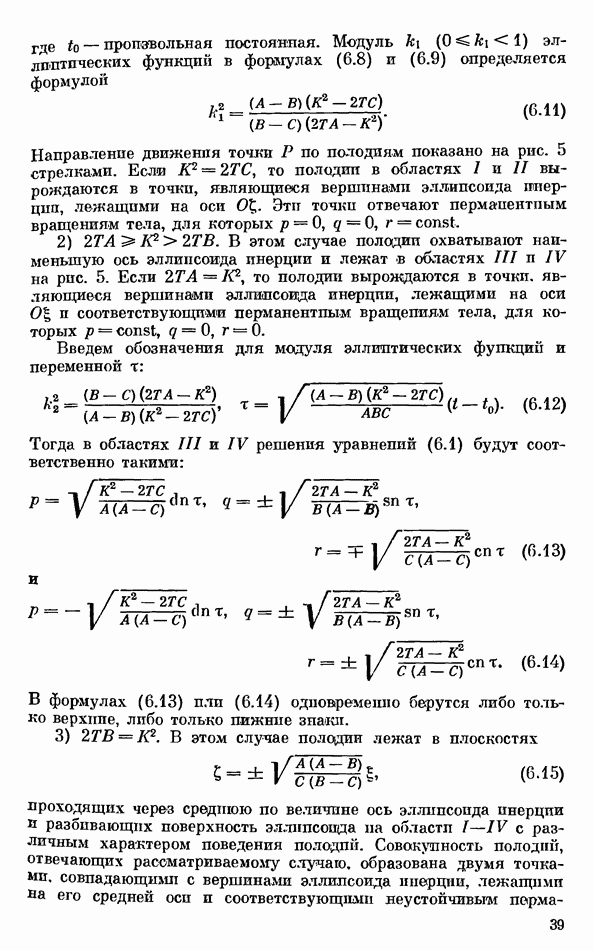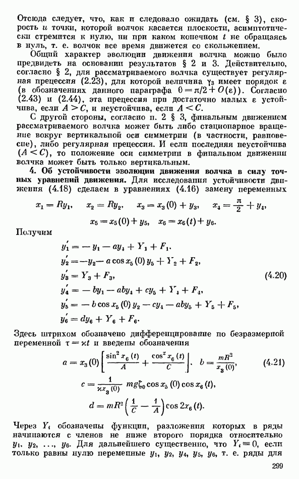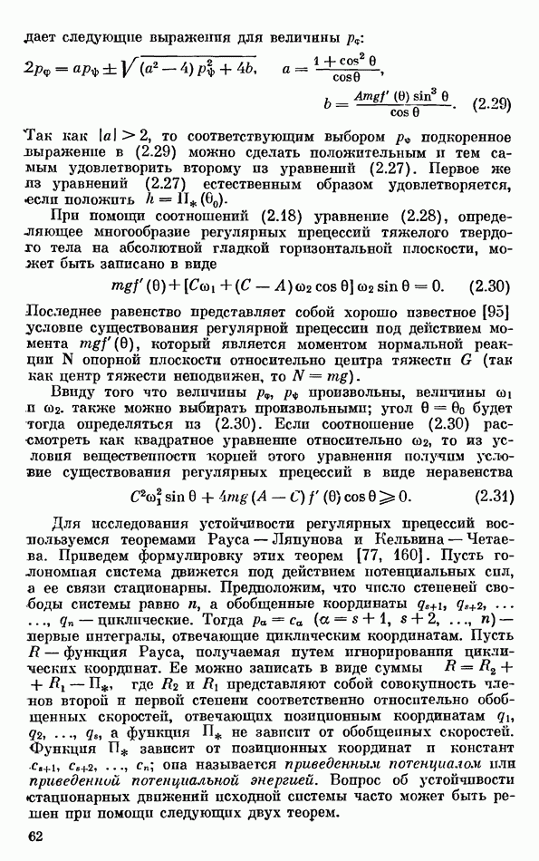 . В линеаризованной спстеме (6.9) первые два уравнения, описывающие изменение со временем углов нутации и собственного вращения, отделяются от третьего уравнения, описывающего вращение тела вокруг вертикали. Замечая, что формально эти два уравнения можно рассматривать как уравнения малых колебаний консервативной системы, сделаем в уравнениях (6.9) замену переменных