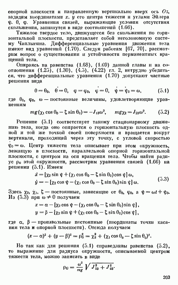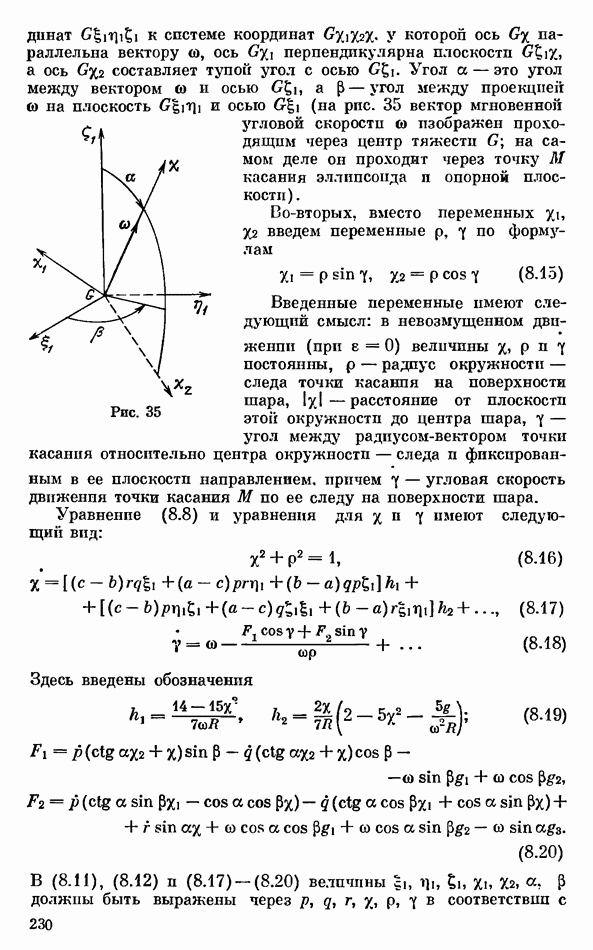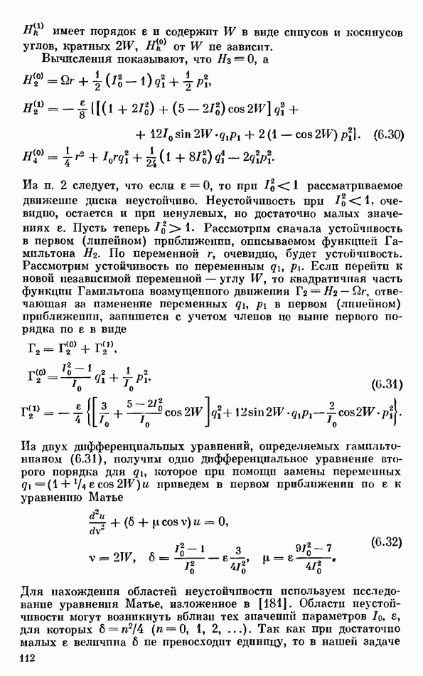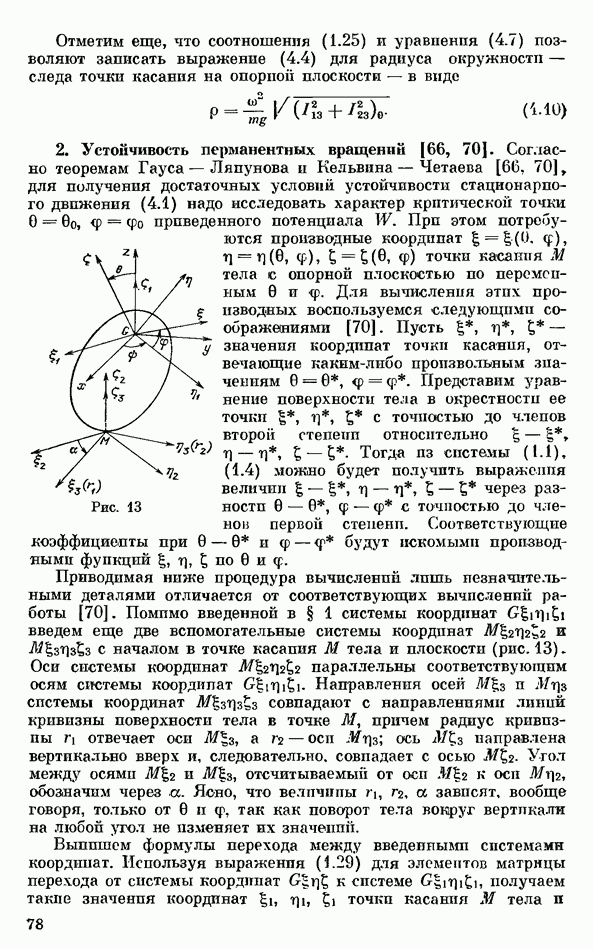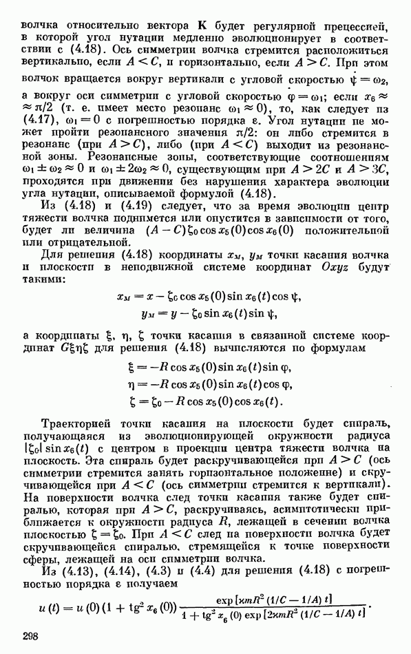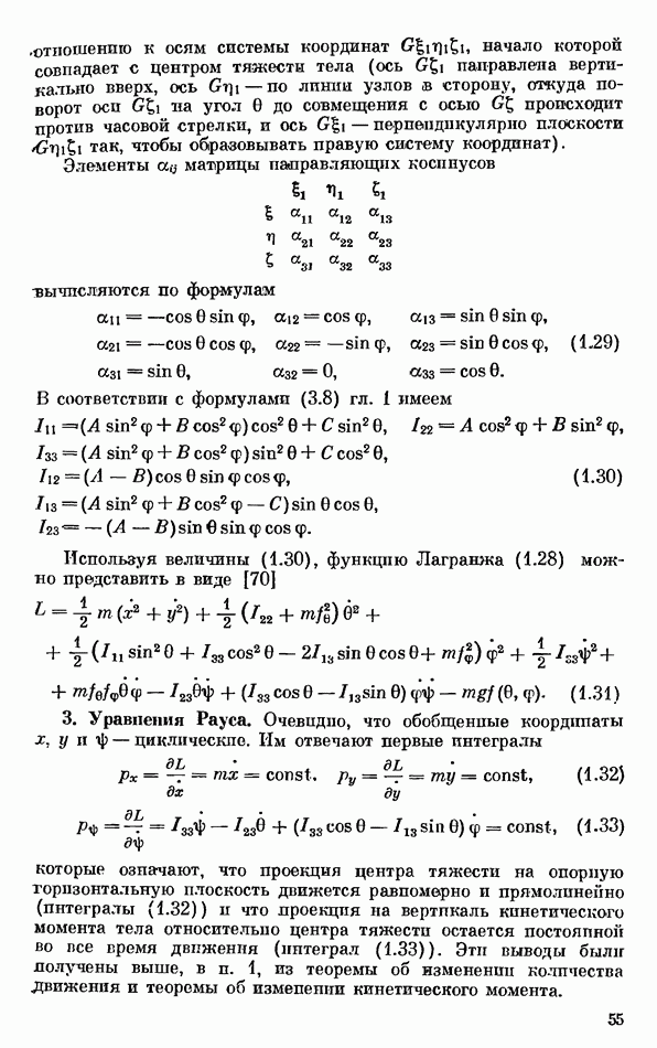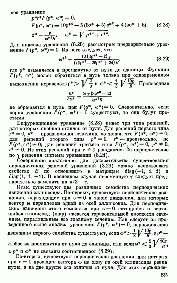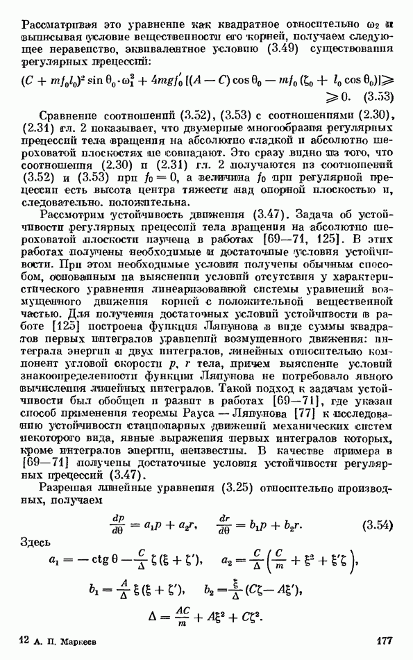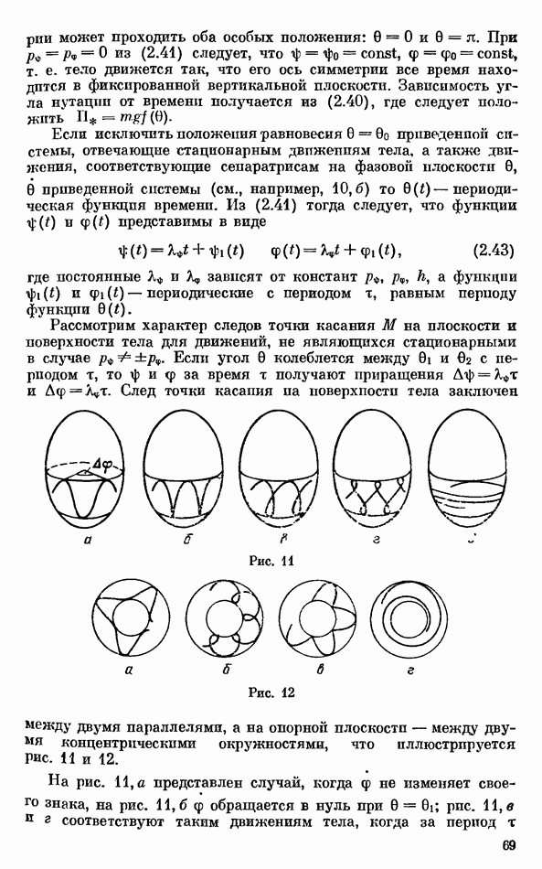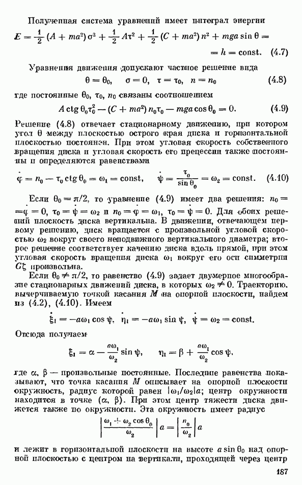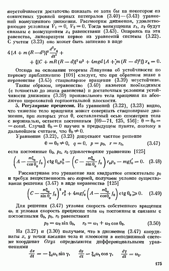 . В линеаризованной спстеме (6.9) первые два уравнения, описывающие изменение со временем углов нутации и собственного вращения, отделяются от третьего уравнения, описывающего вращение тела вокруг вертикали. Замечая, что формально эти два уравнения можно рассматривать как уравнения малых колебаний консервативной системы, сделаем в уравнениях (6.9) замену переменных