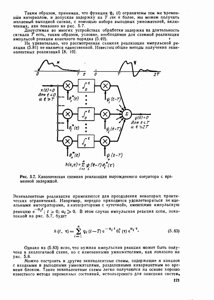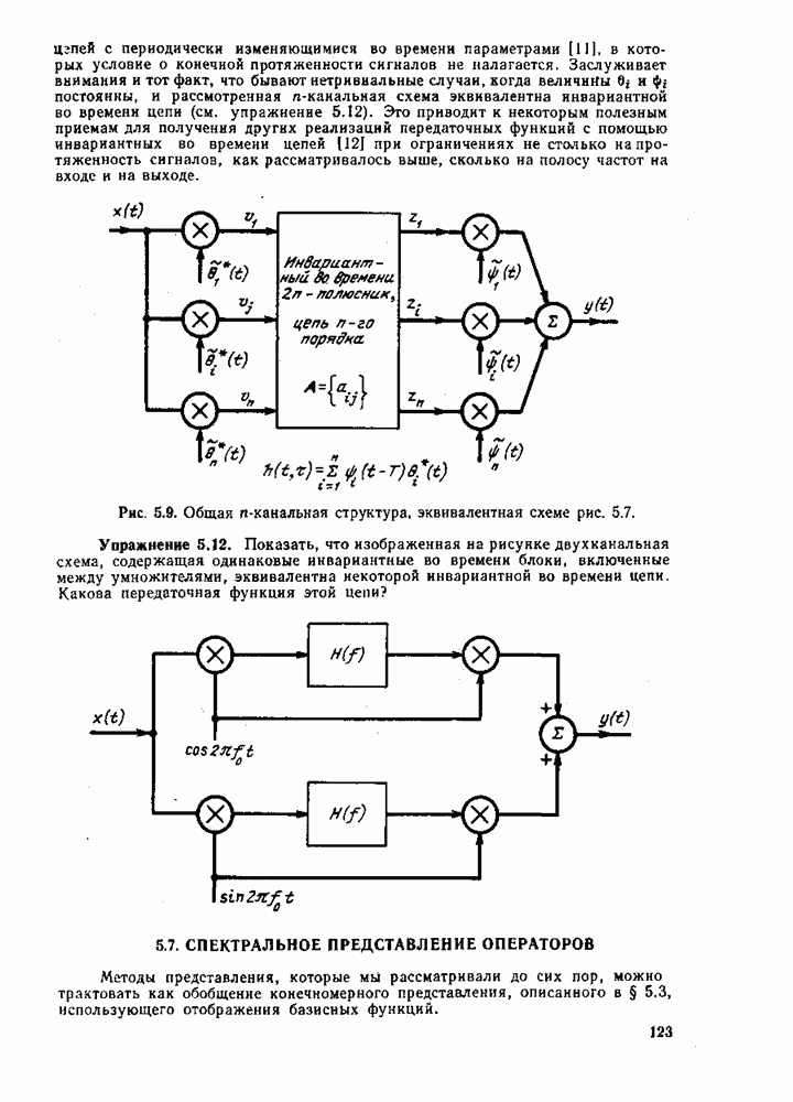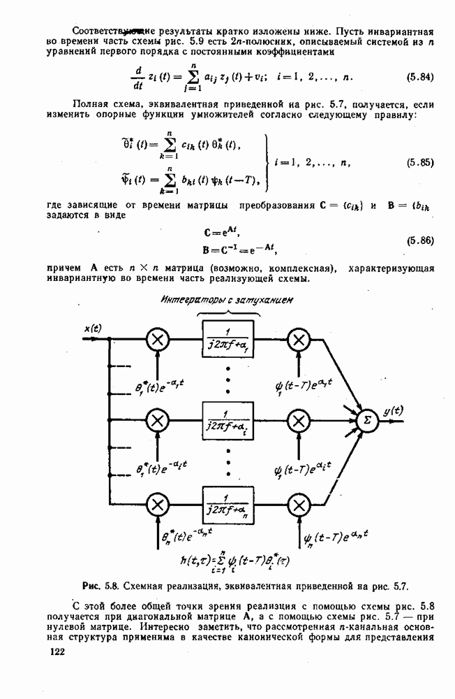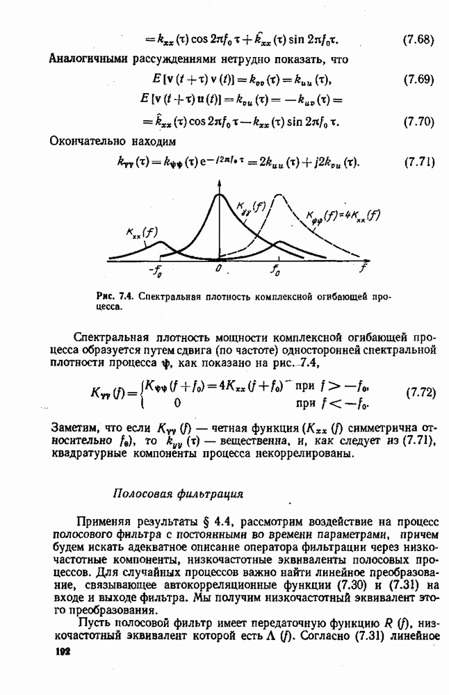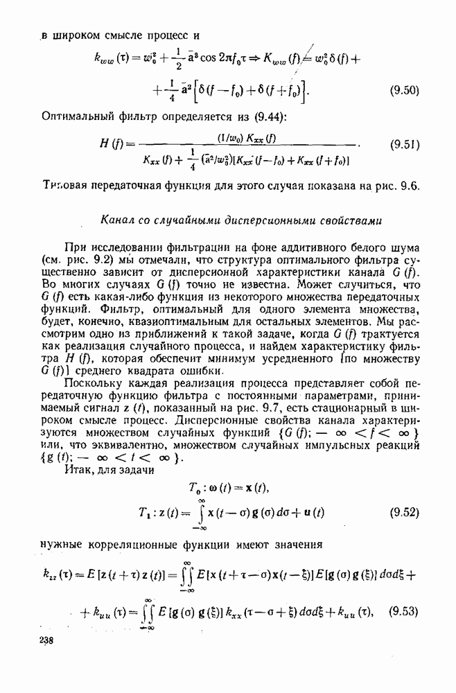 Типовая передаточная функция для этого случая показана на рис. 9.6. Канал со случайными дисперсионными свойствамиПри исследовании фильтрации на фоне аддитивного белого шума (см, рис. 9.2) мы отмечали, что структура оптимального фильтра существенно зависит от дисперсионной характеристики канала Поскольку каждая реализация процесса представляет собой передаточную функцию фильтра с постоянными параметрами, принимаемый сигнал Итак, для задачи