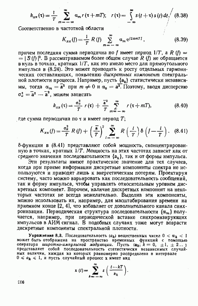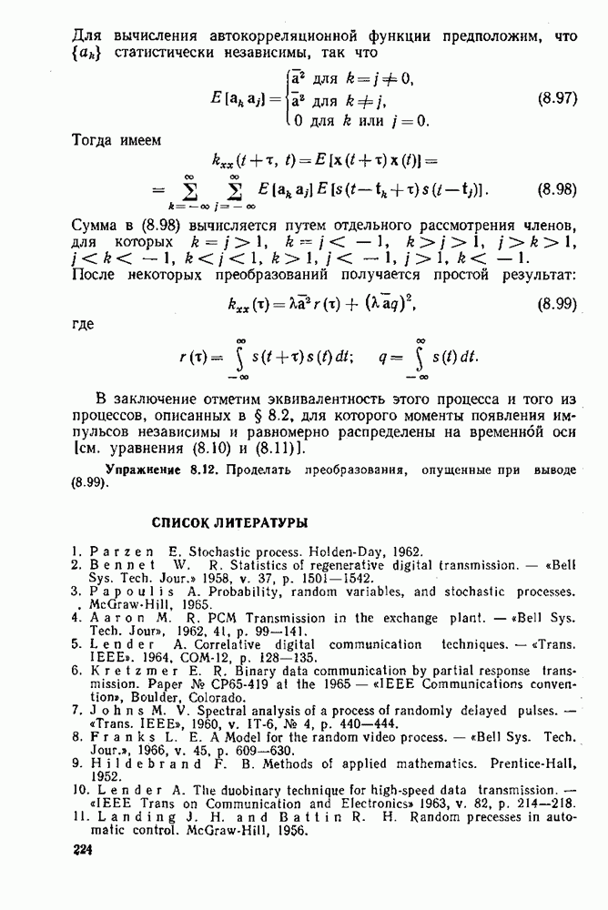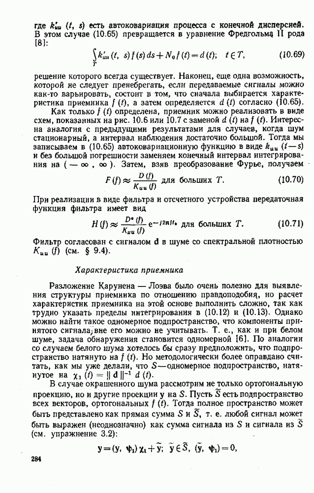где х и Упражнение 9,2. В схеме рис. 9.2 предположить, что передаваемый сигнал Найти характеристику оптимального фильтра с постоянными параметрами, удовлетворяющего этому условию, и минимизирующего дисперсию ошибки Упражнение 9.3. Для задачи проектирования передающего и приемного фильтров, рассмотренной в примере 9.2, проверить результат (9.32) для случая Упражнение 9,4, При совместной оптимизации передающего и приемного фильтров предположить, что ограничение на мощность сигнала относится к выходу передающего фильтра, т. е. на рис.