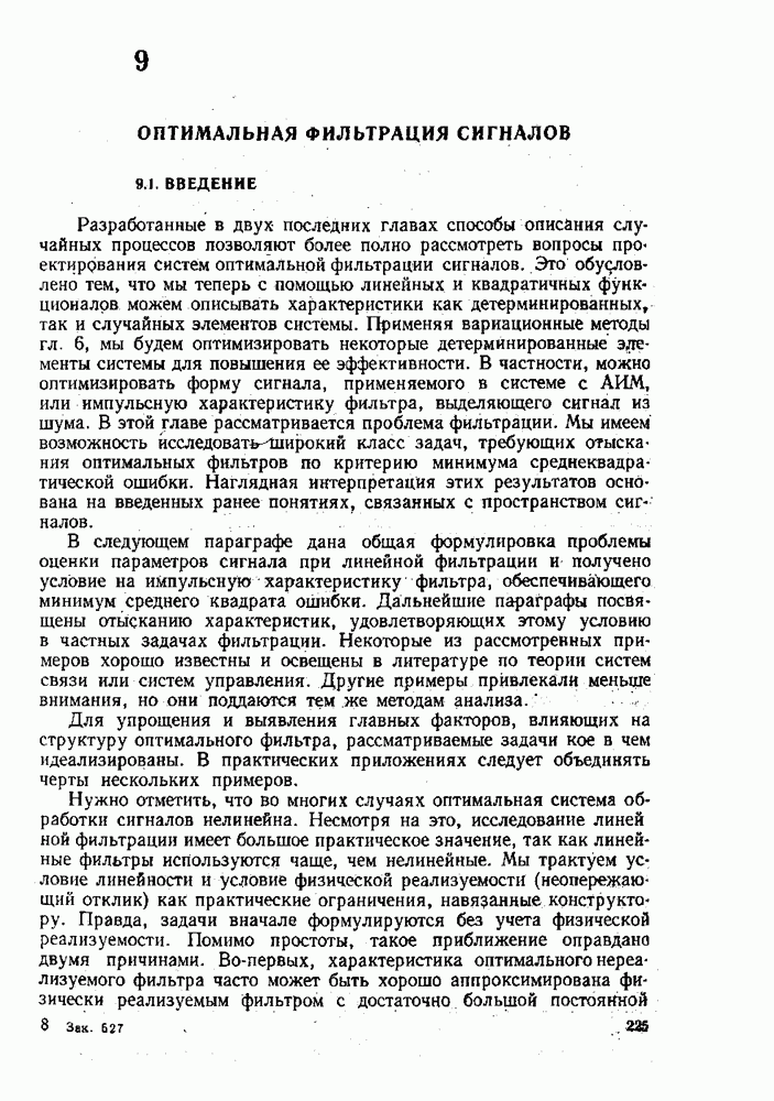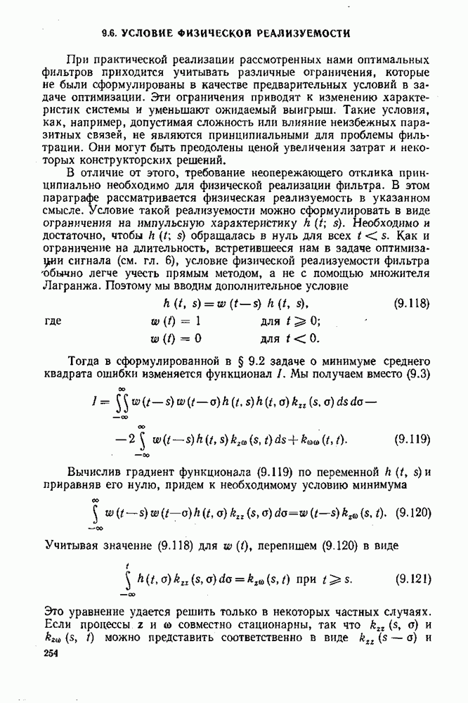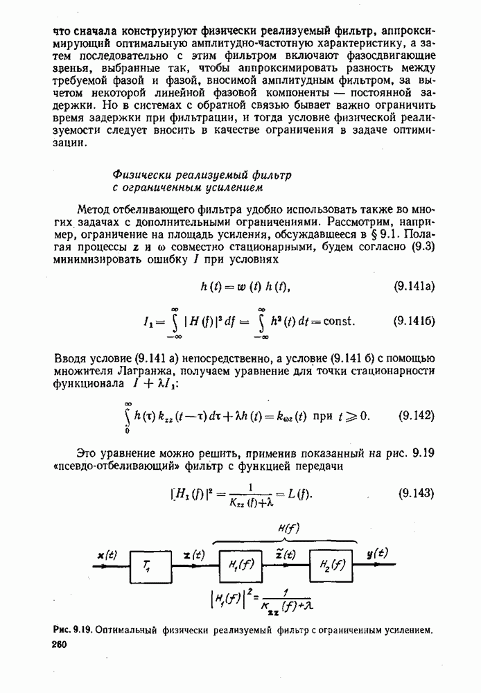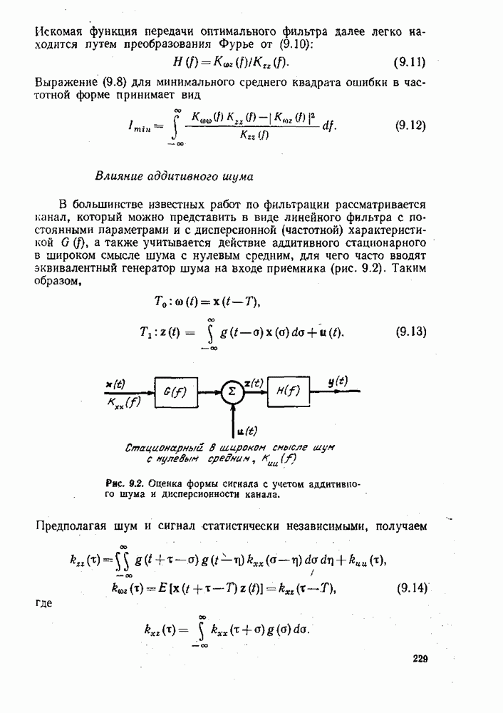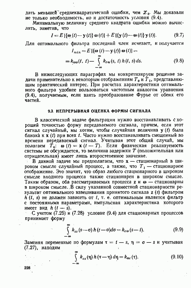 9.3 НЕПРЕРЫВНАЯ ОЦЕНКА ФОРМЫ СИГНАЛАВ классической задаче фильтрации нужно восстанавливать с хорошей точностью форму передаваемого сигнала, причем, если этот сигнал случайный, мы хотим, чтобы случайная величина В данной задаче мы предполагаем, что х — стационарный в широком смысле случайный процесс, а также, что С учетом (7.25) и (7.28) условие (9,4) для стационарных процессов принимает форму