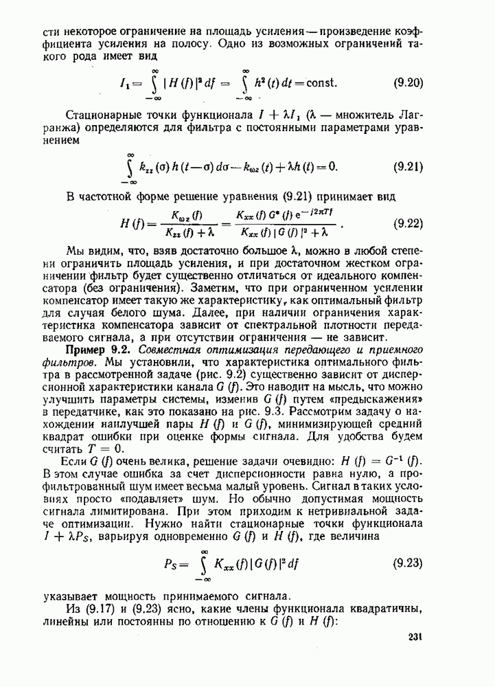 Мы видим, что, взяв достаточно большое Пример 9.2. Совместная оптимизация передающего и приемного фильтров. Мы установили, что характеристика оптимального фильтра в рассмотренной задаче (рис. 9.2) существенно зависит от дисперсионной характеристики канала Если