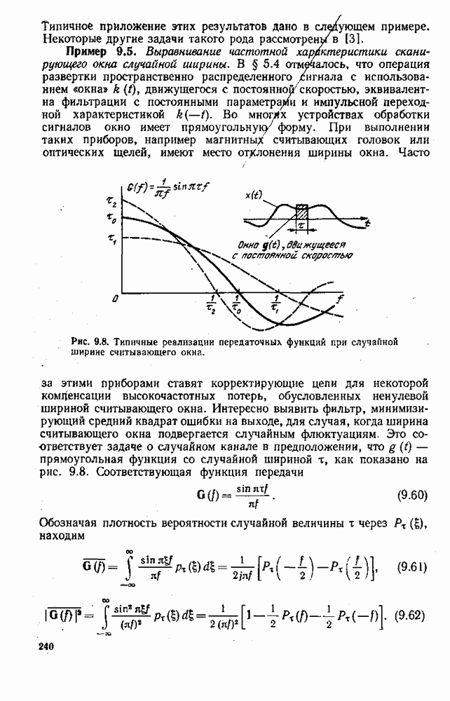 Очевидно, можно рассматривать оптимальный фильтр как фильтр, построенный согласно (9,16) для усредненного канала и аддитивного шума, имеющего спектральную плотность Типичное приложение этих результатов дано в следующем примере. Некоторые другие задачи такого рода рассмотреныв [3]. Пример 9,5. Выравнивание частотной характеристики сканирующего окна случайной ширины. В § 5.4 отмечалось, что операция развертки пространственно распределенного сигнала с использованием «окна»