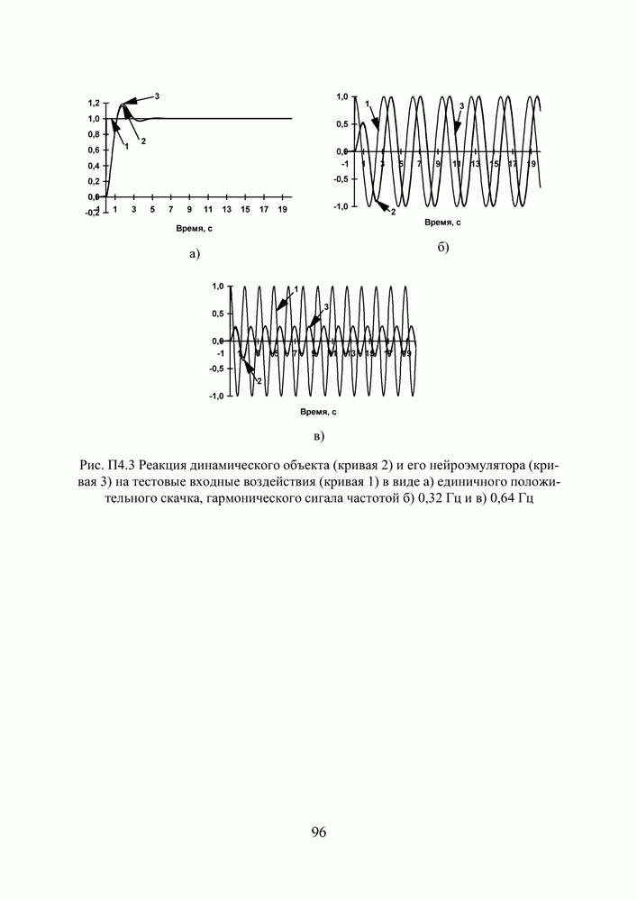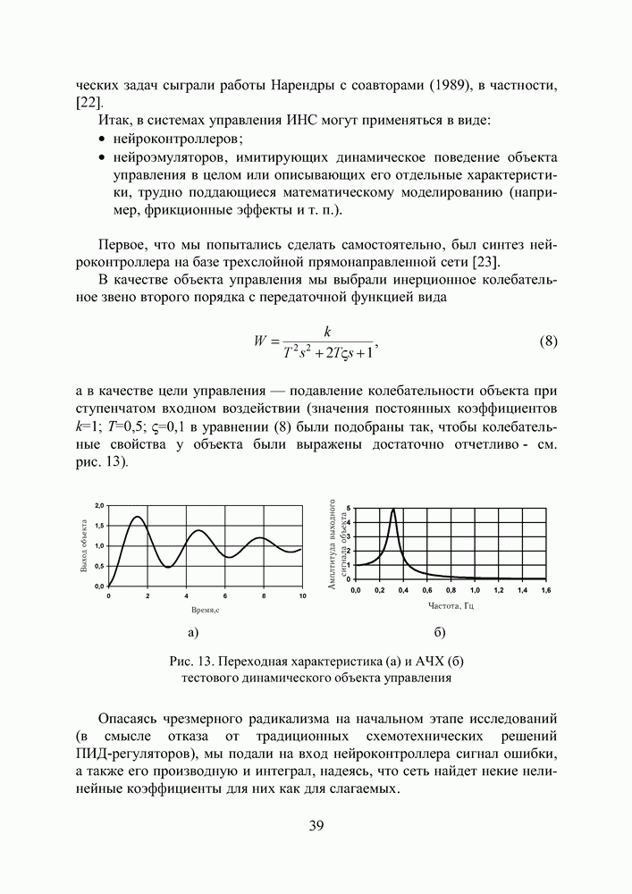 Рис. 13. Переходная характеристика (а) и АЧХ (б) тестового динамического объекта управления Опасаясь чрезмерного радикализма на начальном этапе исследований (в смысле отказа от традиционных схемотехнических решений ПИД-регуляторов), мы подали на вход нейроконтроллера сигнал ошибки, а также его производную и интеграл, надеясь, что сеть найдет некие нелинейные коэффициенты для них как для слагаемых.
