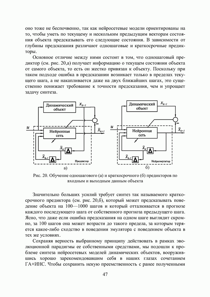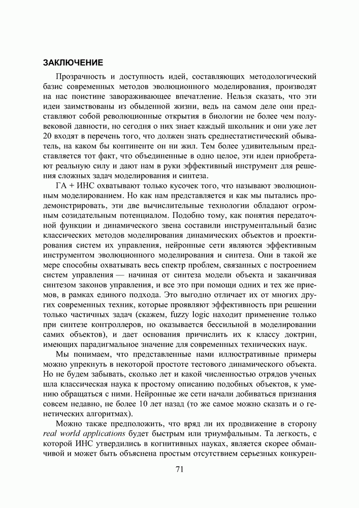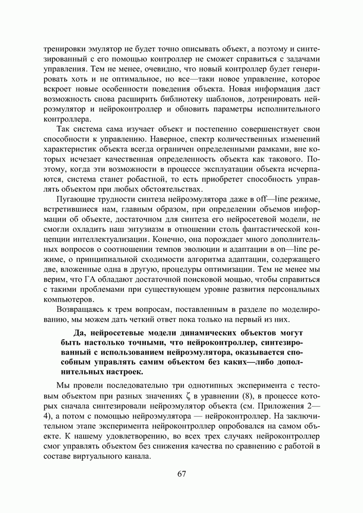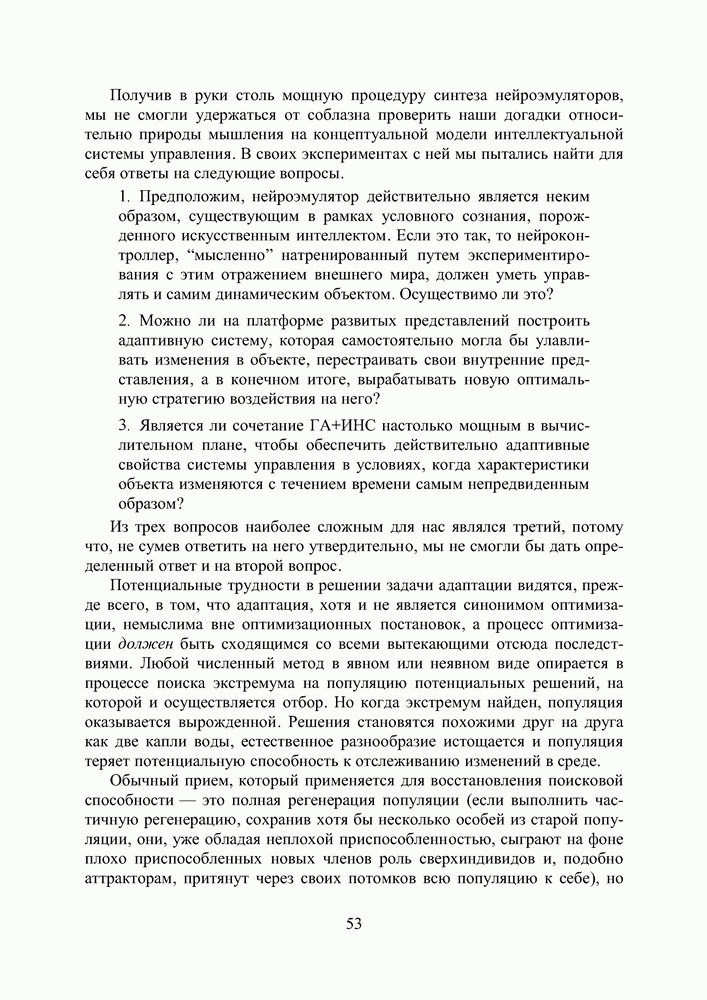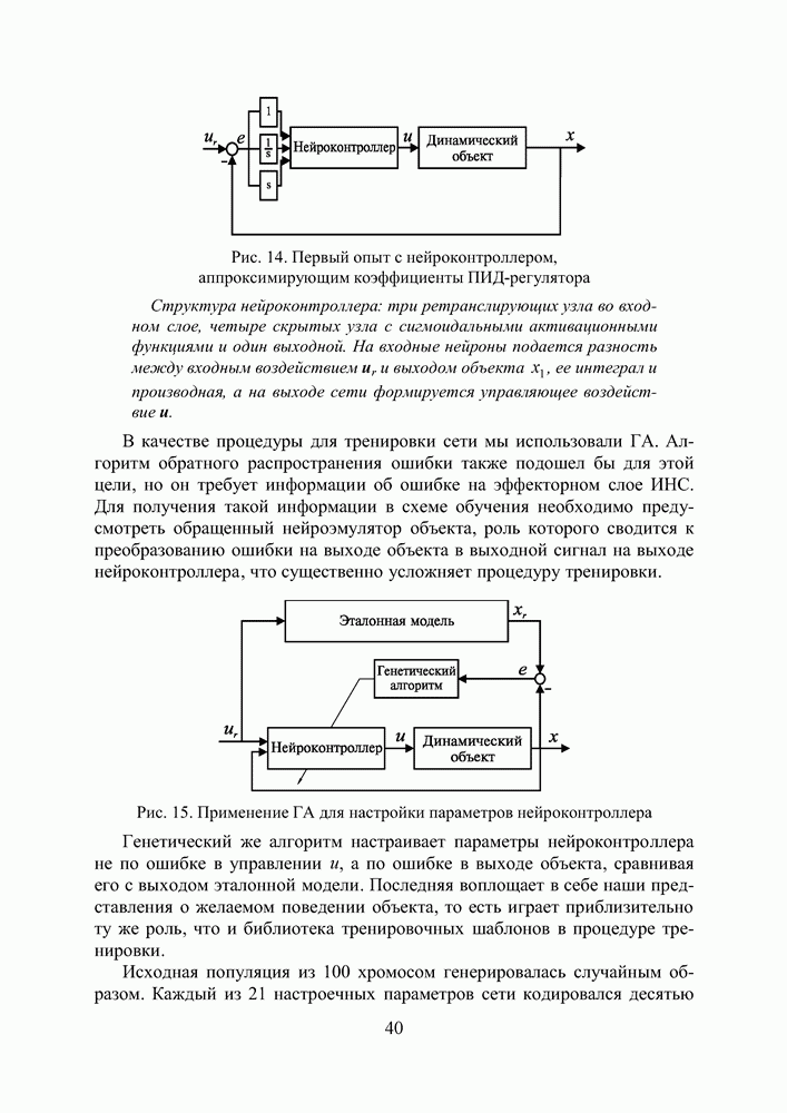 3. ГА+ИНС = НОВАЯ ПАРАДИГМА В УПРАВЛЕНИИКлассические методы синтеза систем управления базируются на хорошо развитом аппарате интегро-дифференциального исчисления, созданном Ньютоном около трехсот лет назад. Нейронные сети представляют собой альтернативное, существующее всего несколько лет, направление в теории автоматического управления, предлагающее иной способ отражения и преобразования действительности, в котором можно обнаружить и сходные, и различные черты с классической парадигмой. Проникновение дифференциальных уравнений в теорию автоматического регулирования связывают с именами Д. К. Максвелла (1831—1879) и И. А. Вышнеградского (1831—1895) [21]. Дело в том, что с момента построения Д. Уаттом паровой машины с центробежным регулятором скорости вращения (1784) и до середины второй половины прошлого века какая-либо теория регулирования просто отсутствовала. Однако, с ростом мощности паровых машин участились аварии, вызванные плохим качеством регулирования. И вот Максвелл и Вышнеградский почти одновременно и независимо друг от друга взялись за теоретический анализ этой системы. Оба использовали теорию малых колебаний, берущую начало от Ж. Л. Лагранжа. Записав уравнения Лагранжа для паровой машины и выразив в них фазовые переменные через возмущения относительно некоторых равновесных значений, Максвелл и Вышнеградский линеаризовали уравнения относительно возмущений и исследовали условия устойчивости состояния равновесия. Так начался первый этап в развитии теории автоматического управления, этап расцвета классических методов анализа. Продолжался он довольно долго — до 40-х годов нашего века, но в содержательном отношении не отличался большим разнообразием подходов. Исследование устойчивости, а также качества переходных процессов продолжали оставаться основными задачами всего этого периода. Термин «нейроуправление» впервые появился в работах Вербоса уже в 1976 году, однако решающую роль во внедрении ИНС в сферу управленческих задач сыграли работы Нарендры с соавторами (1989), в частности, [22]. Итак, в системах управления ИНС могут применяться в виде: • нейроконтроллеров; • нейроэмуляторов, имитирующих динамическое поведение объекта управления в целом или описывающих его отдельные характеристики, трудно поддающиеся математическому моделированию (например, фрикционные эффекты и т. п.). Первое, что мы попытались сделать самостоятельно, был синтез нейроконтроллера на базе трехслойной прямонаправленной сети [23]. В качестве объекта управления мы выбрали инерционное колебательное звено второго порядка с передаточной функцией вида