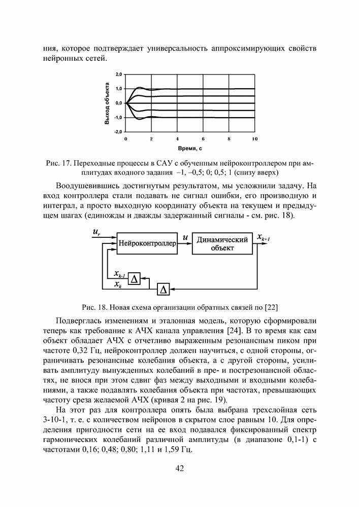 Рис. 18. Новая схема организации обратных связей по [22] Подверглась изменениям и эталонная модель, которую сформировали теперь как требование к АЧХ канала управления [24]. В то время как сам объект обладает АЧХ с отчетливо выраженным резонансным пиком при частоте 0,32 Гц, нейроконтроллер должен научиться, с одной стороны, ограничивать резонансные колебания объекта, а с другой стороны, усиливать амплитуду вынужденных колебаний в пре- и пострезонансной областях, не внося при этом сдвиг фаз между выходными и входными колебаниями, а также подавлять колебания объекта при частотах, превышающих частоту среза желаемой АЧХ (кривая 2 на рис. 19). На этот раз для контроллера опять была выбрана трехслойная сеть 3-10-1, т. е. с количеством нейронов в скрытом слое равным 10. Для определения пригодности сети на ее вход подавался фиксированный спектр гармонических колебаний различной амплитуды (в диапазоне 0,1-1) с частотами 0,16; 0,48; 0,80; 1,11 и 1,59 Гц. Интегральная ошибка по всем тестовым переходным процессам, продолжительность которых, как и ранее, составляла 10 секунд, принималась в качестве меры успешности управления. Результаты синтеза оказались удачными. Контроллер, параметры которого представлены в Приложении 1, справлялся с возложенными на него задачами. Фактическая АЧХ нейросетевой системы управления представлена на рис. 19. Она построена уже на непрерывном спектре частот, включающем частоты тренировочных сигналов. По-видимому, из-за недостаточного размера скрытого слоя сети, синтезированная АЧХ на участке 0,6-1 Гц значительно отличается от эталонной. Однако в общем, полученные результаты свидетельствует, что способность сети к обобщению может использоваться и при синтезе нейроконтроллера в частотной области.