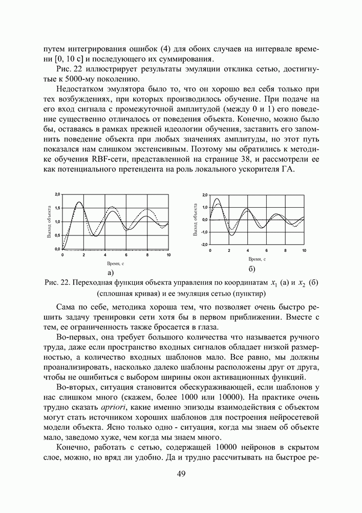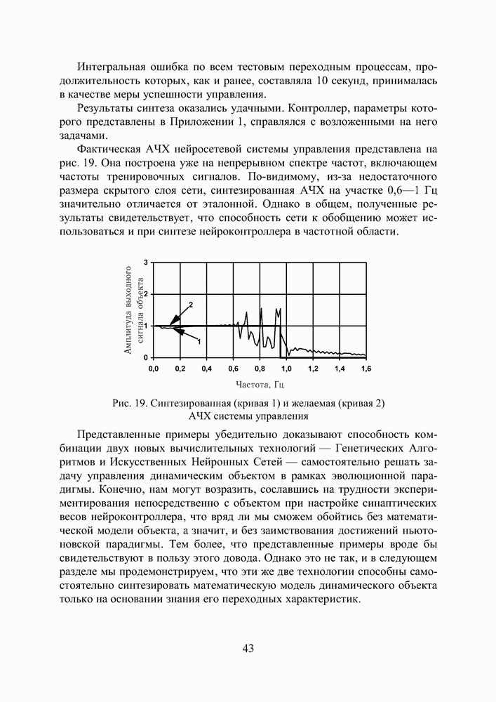 Рис. 19. Синтезированная (кривая 1) и желаемая (кривая 2) АЧХ системы управления Представленные примеры убедительно доказывают способность комбинации двух новых вычислительных технологий — Генетических Алгоритмов и Искусственных Нейронных Сетей — самостоятельно решать задачу управления динамическим объектом в рамках эволюционной парадигмы. Конечно, нам могут возразить, сославшись на трудности экспериментирования непосредственно с объектом при настройке синаптических весов нейроконтроллера, что вряд ли мы сможем обойтись без математической модели объекта, а значит, и без заимствования достижений ньютоновской парадигмы. Тем более, что представленные примеры вроде бы свидетельствуют в пользу этого довода. Однако это не так, и в следующем разделе мы продемонстрируем, что эти же две технологии способны самостоятельно синтезировать математическую модель динамического объекта только на основании знания его переходных характеристик.