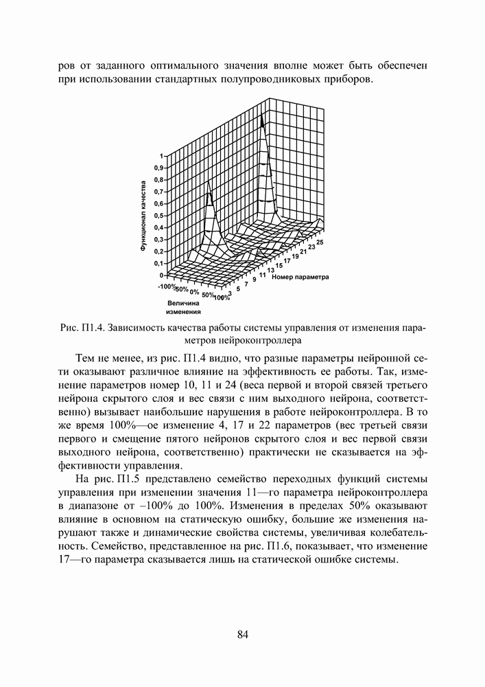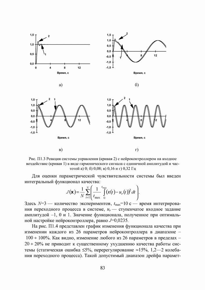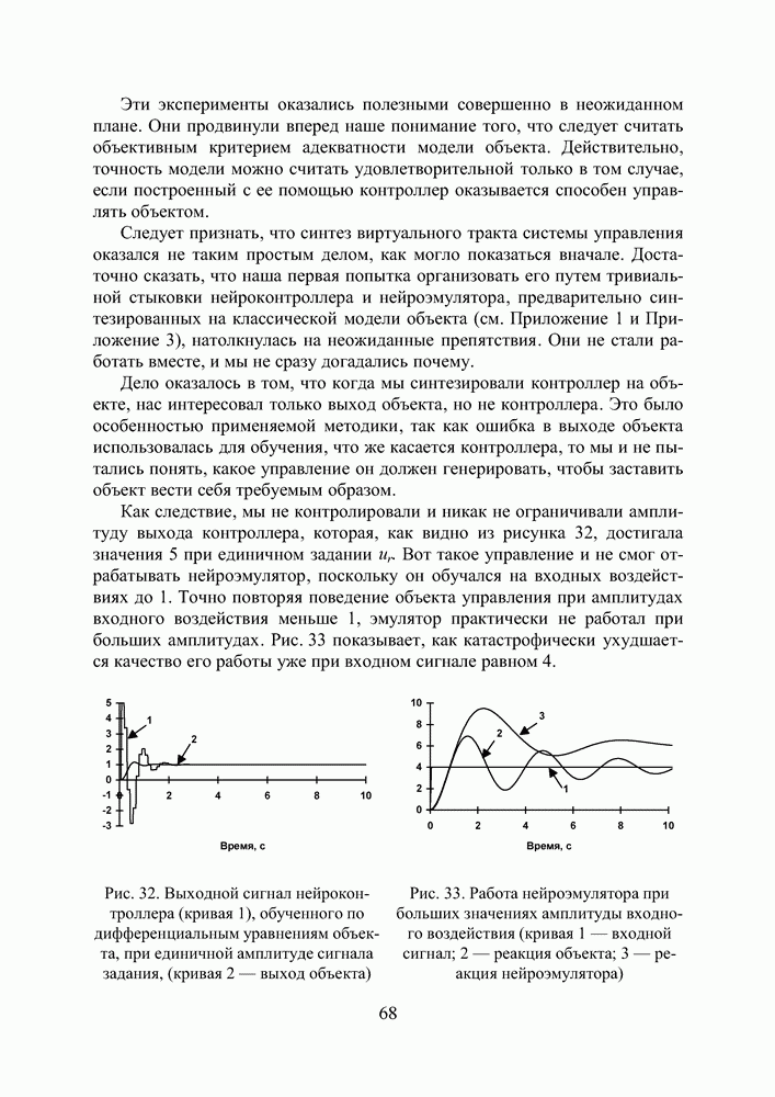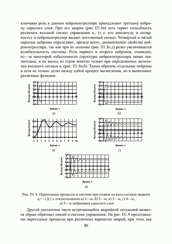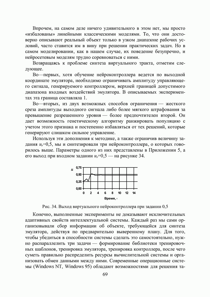 Рис. 14. Первый опыт с нейроконтроллером, аппроксимирующим коэффициенты ПИД-регулятора Структура нейроконтроллера: три ретранслирующих узла во входном слое, четыре скрытых узла с сигмоидальными активационными функциями и один выходной. На входные нейроныг подается разность между входным воздействием В качестве процедуры для тренировки сети мы использовали ГА. Алгоритм обратного распространения ошибки также подошел бы для этой цели, но он требует информации об ошибке на эффекторном слое ИНС. Для получения такой информации в схеме обучения необходимо предусмотреть обращенный нейроэмулятор объекта, роль которого сводится к преобразованию ошибки на выходе объекта в выходной сигнал на выходе нейроконтроллера, что существенно усложняет процедуру тренировки.