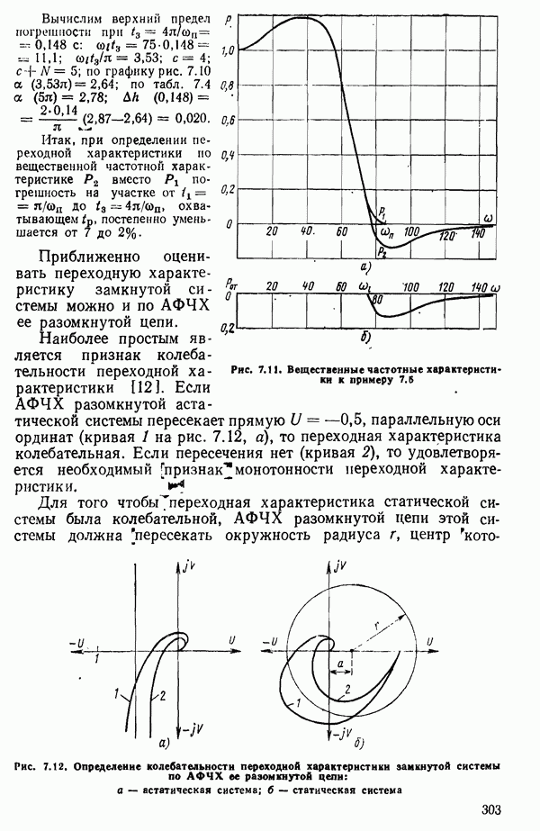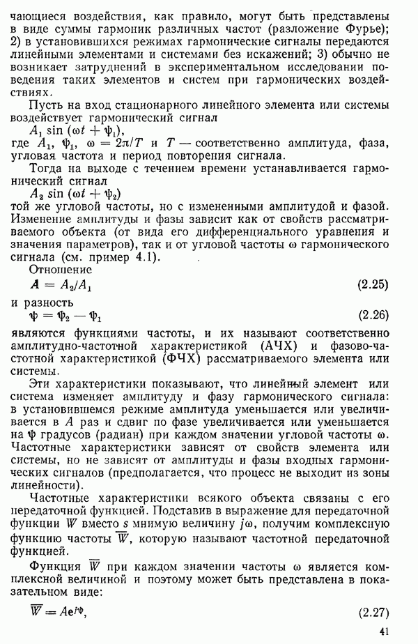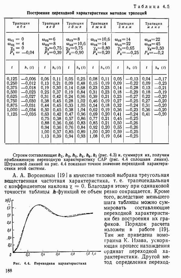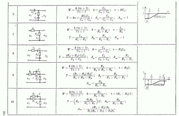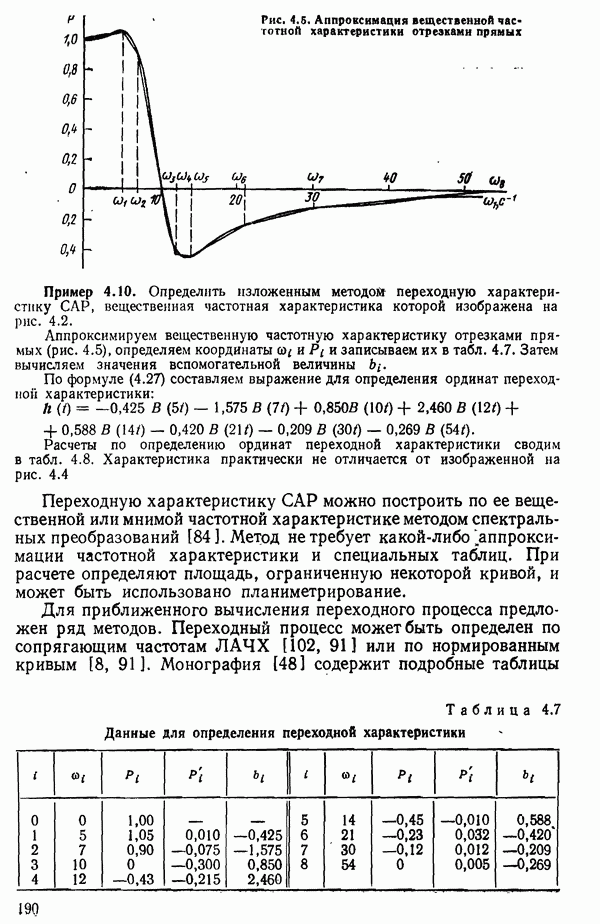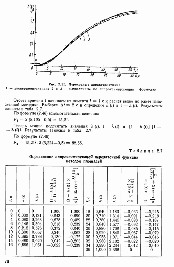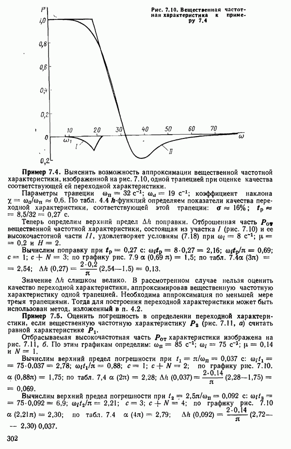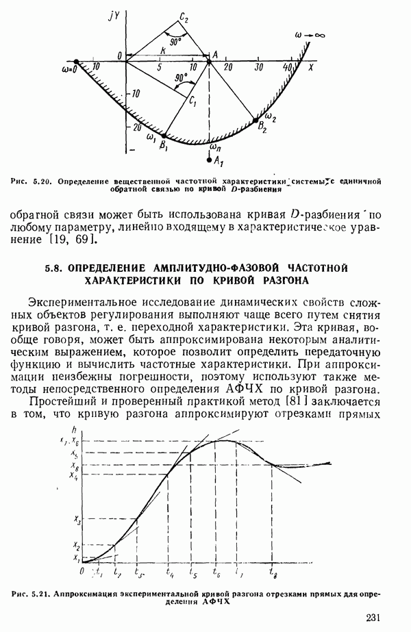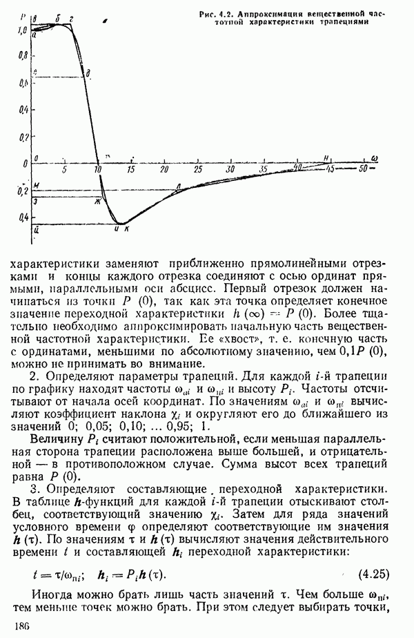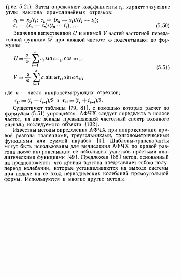 Известны методы определения АФЧХ при аппроксимации кривой разгона трапециями, треугольниками, тригонометрическими функциями или суммой парабол [4]. Шаблоны-транспоранты могут быть использованы для вычисления АФЧХ по кривой разгона после аппроксимации ее небольших участков простыми аналитическими функциями [49]. Предложен [88] метод, основанный на предположении, что кривая разгона представляет собою полупериод колебаний, которые устанавливаются на выходе системы при подаче на ее вход периодических колебаний прямоугольной формы. Используются и многие другие методы.