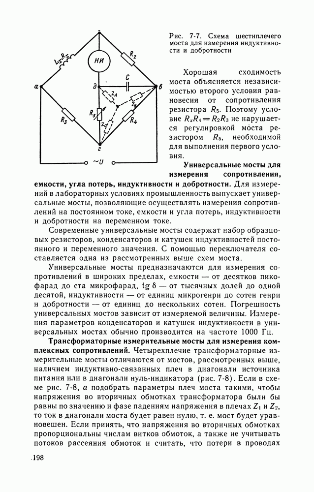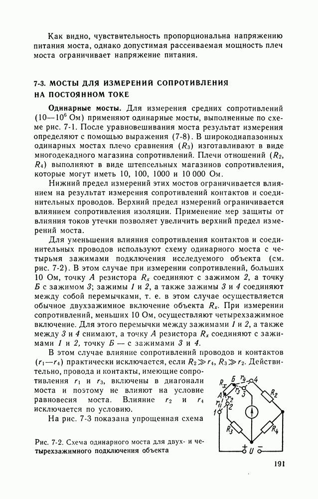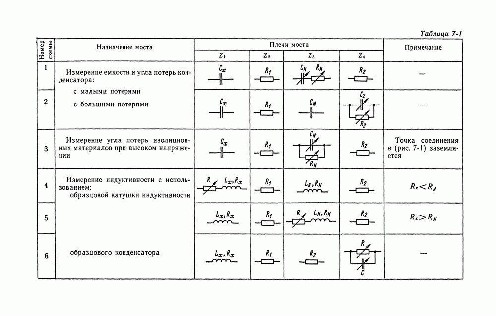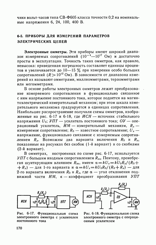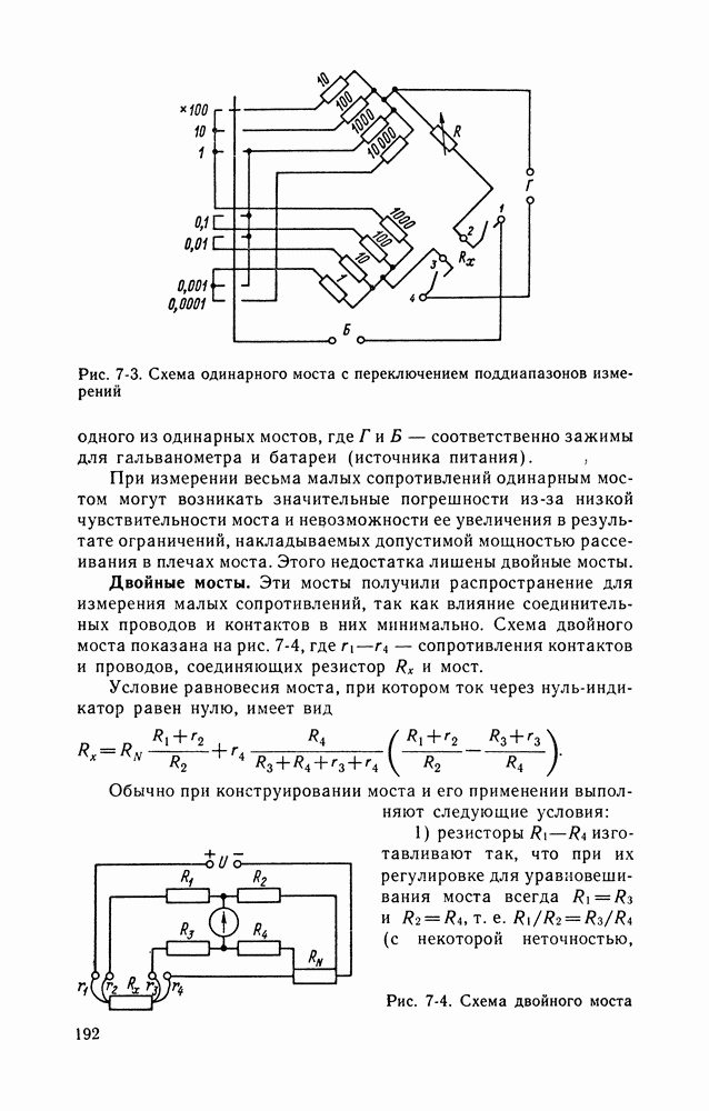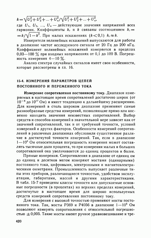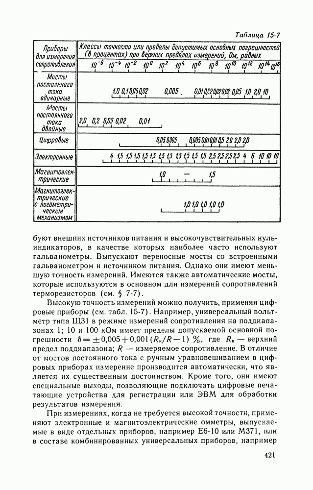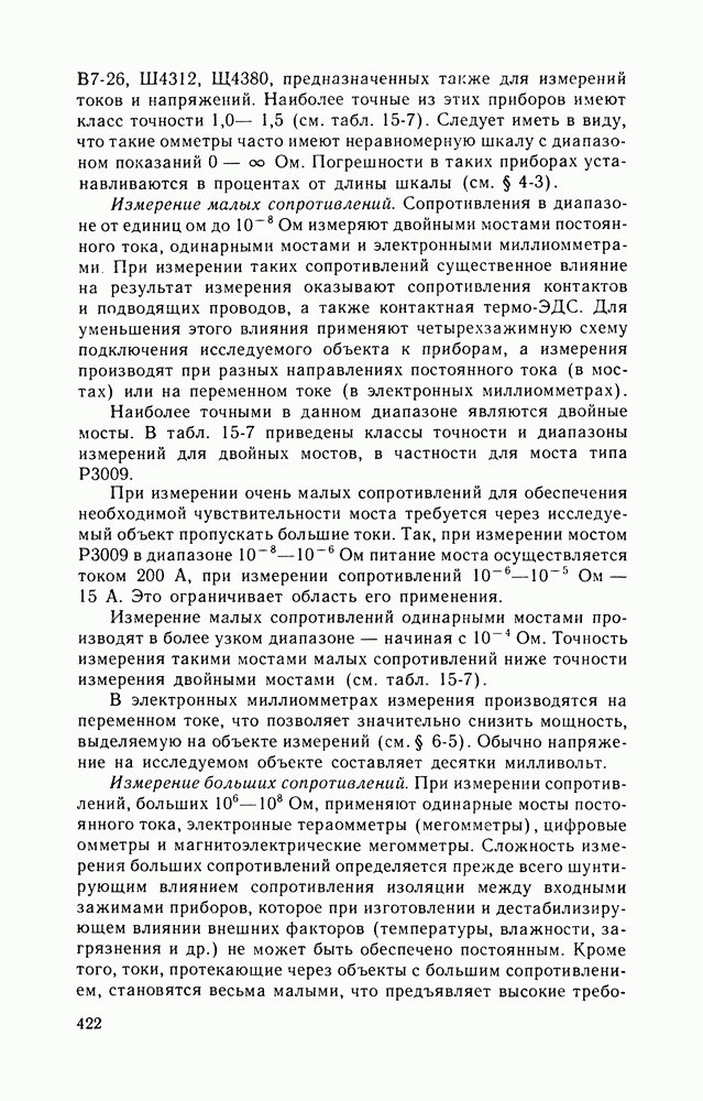 15-4. ИЗМЕРЕНИЯ ПАРАМЕТРОВ ЦЕПЕЙ ПОСТОЯННОГО И ПЕРЕМЕННОГО ТОКАИзмерение сопротивления постоянному току.Диапазон измеряемых в настоящее время сопротивлений достаточно широк (от Прямые измерения. Сопротивления в диапазоне от единиц ом до единиц и десятков мегом измеряют мостами (одинарными) постоянного тока, цифровыми, электронными и магнитоэлектрическими омметрами. Промышленность выпускает различные типы этих приборов, различающиеся точностью, удобством эксплуатации, габаритами, массой и другими характеристиками. В табл. 15-7 приведены классы точности или допускаемые основные погрешности (в процентах) на верхних пределах измерений, достигнутые в настоящее время для широко используемых средств измерений сопротивления постоянному току. Для измерения с высокой точностью применяют мосты постоянного тока. Так, мосты Таблица 15-7 (см. скан) требуют внешних источников питания и высокочувствительных нуль-индикаторов, в качестве которых наиболее часто используют гальванометры. Выпускают переносные мосты со встроенными гальванометром и источником питания. Однако они имеют меньшую точность измерений. Имеются также автоматические мосты, которые используются в основном для измерений сопротивлений терморезисторов (см. § 7-7). Высокую точность измерений можно получить, применяя цифровые приборы (см. табл. 15-7). Например, универсальный вольтметр типа При измерениях, когда не требуется высокой точности, применяют электронные и магнитоэлектрические омметры, выпускаемые в виде отдельных приборов, например