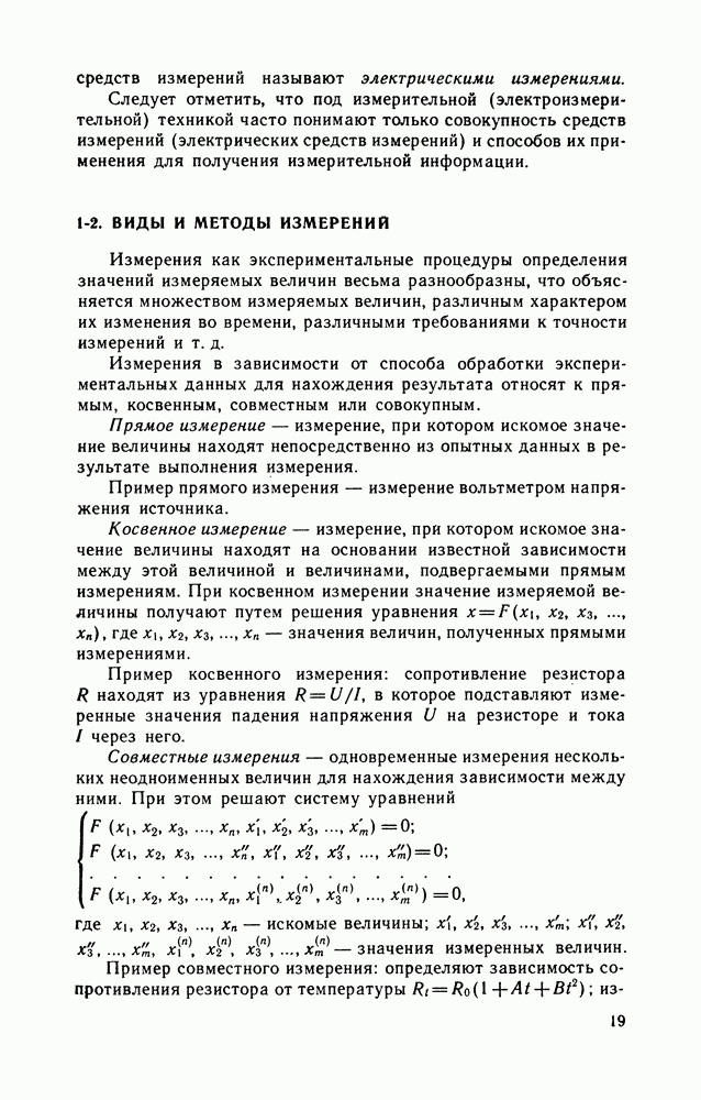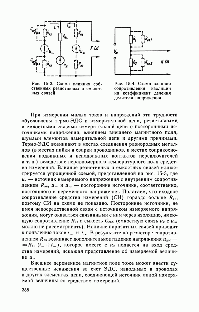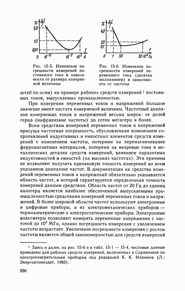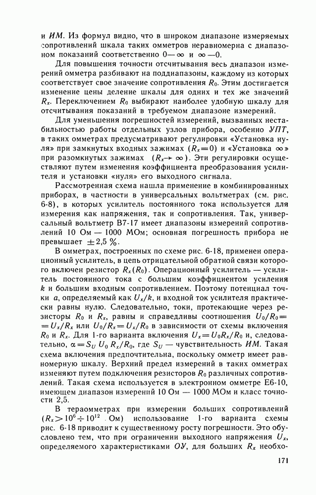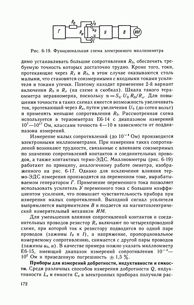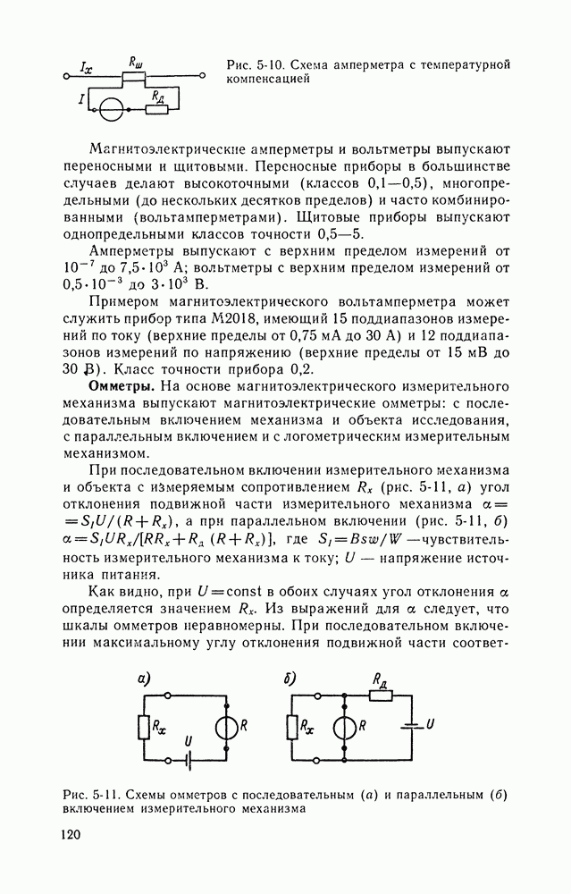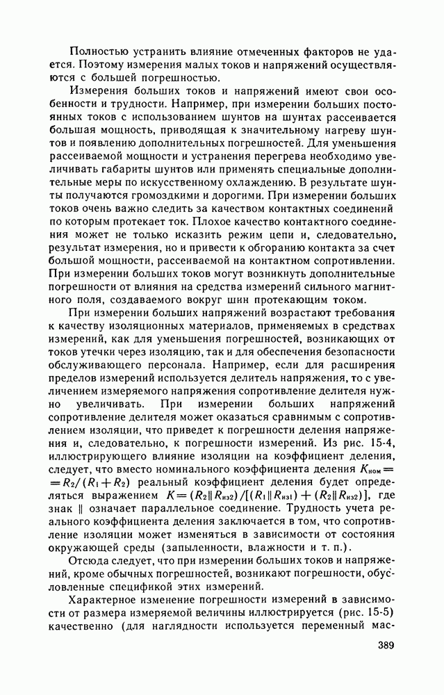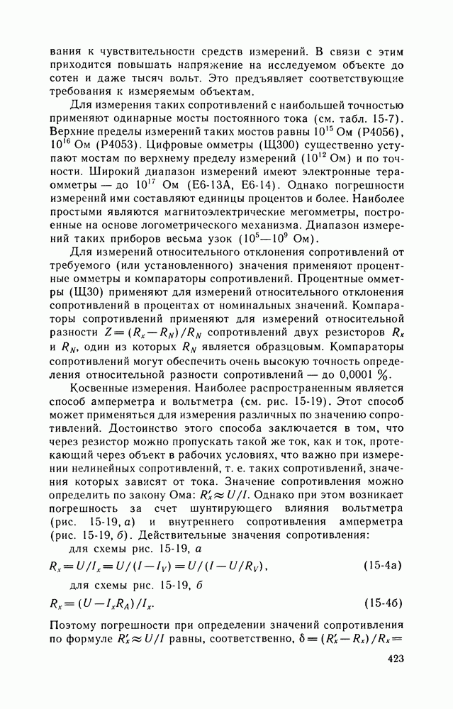Измерение малых сопротивлений. Сопротивления в диапазоне от единиц ом до Наиболее точными в данном диапазоне являются двойные мосты. В табл. 15-7 приведены классы точности и диапазоны измерений для двойных мостов, в частности для моста типа При измерении очень малых сопротивлений для обеспечения необходимой чувствительности моста требуется через исследуемый объект пропускать большие токи. Так, при измерении мостом Измерение малых сопротивлений одинарными мостами производят в более узком диапазоне — начиная с 10-4 Ом. Точность измерения такими мостами малых сопротивлений ниже точности измерения двойными мостами (см. табл. 15-7). В электронных миллиомметрах измерения производятся на переменном токе, что позволяет значительно снизить мощность, выделяемую на объекте измерений (см. § 6-5). Обычно напряжение на исследуемом объекте составляет десятки милливольт. Измерение больших сопротивлений. При измерении сопротивлений, больших 106—108 Ом, применяют одинарные мосты постоянного тока, электронные тераомметры (мегомметры), цифровые омметры и магнитоэлектрические мегомметры. Сложность измерения больших сопротивлений определяется прежде всего шунтирующим влиянием сопротивления изоляции между входными зажимами приборов, которое при изготовлении и дестабилизирующем влиянии внешних факторов (температуры, влажности, загрязнения и др.) не может быть обеспечено постоянным. Кроме того, токи, протекающие через объекты с большим сопротивлением, становятся весьма малыми, что предъявляет высокие требования к чувствительности средств измерений. В связи с этим приходится повышать напряжение на исследуемом объекте до сотен и даже тысяч вольт. Это предъявляет соответствующие требования к измеряемым объектам. Для измерения таких сопротивлений с наибольшей точностью применяют одинарные мосты постоянного тока (см. табл. 15-7). Верхние пределы измерений таких мостов равны 1015 Ом Для измерений относительного отклонения сопротивлений от требуемого (или установленного) значения применяют процентные омметры и компараторы сопротивлений. Процентные омметры Косвенные измерения. Наиболее распространенным является способ амперметра и вольтметра (см. рис. 15-19). Этот способ может применяться для измерения различных по значению сопротивлений. Достоинство этого способа заключается в том, что через резистор можно пропускать такой же ток, как и ток, протекающий через объект в рабочих условиях, что важно при измерении нелинейных сопротивлений, т. е. таких сопротивлений, значения которых зависят от тока. Значение сопротивления можно определить по закону Ома: